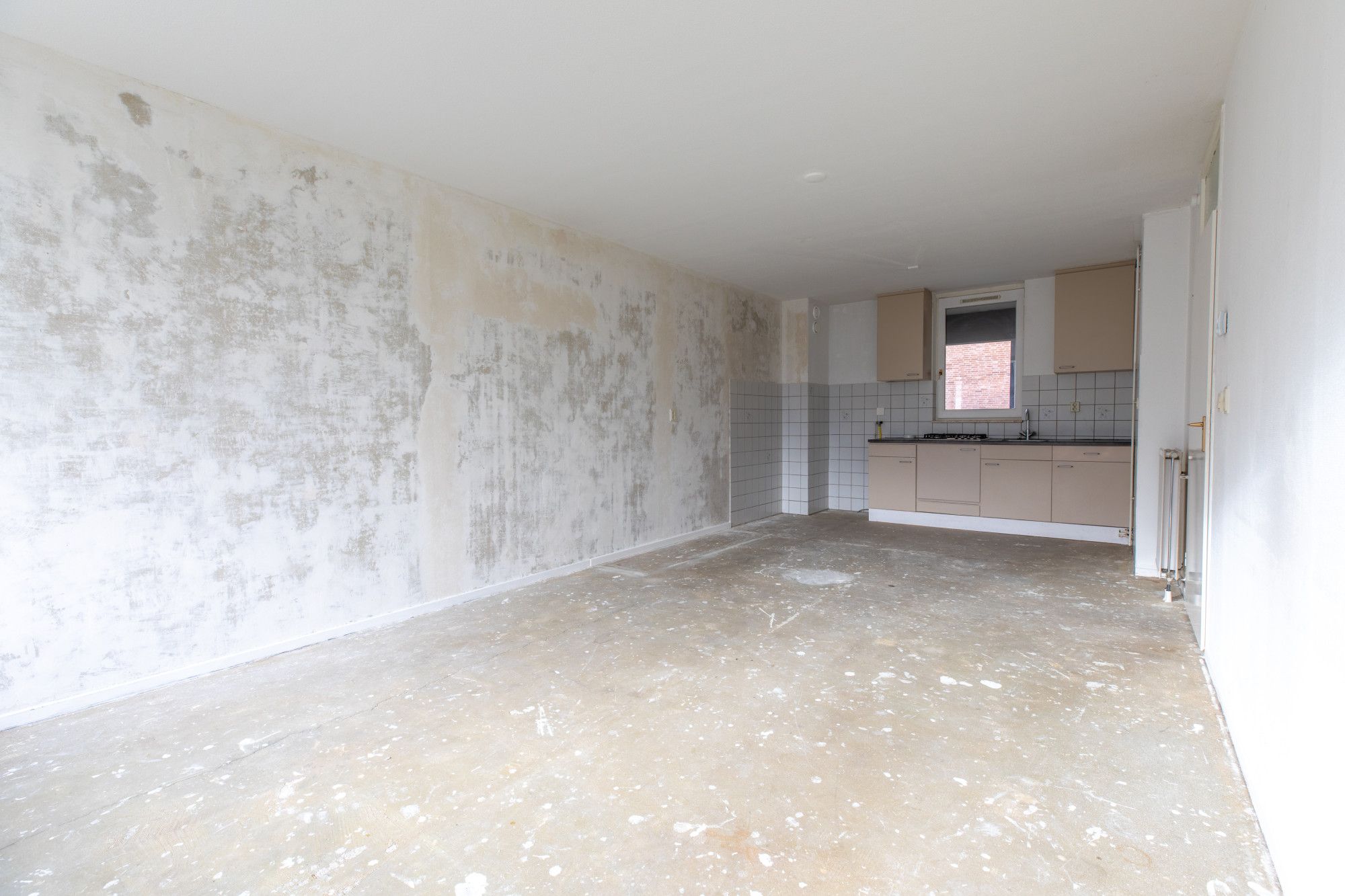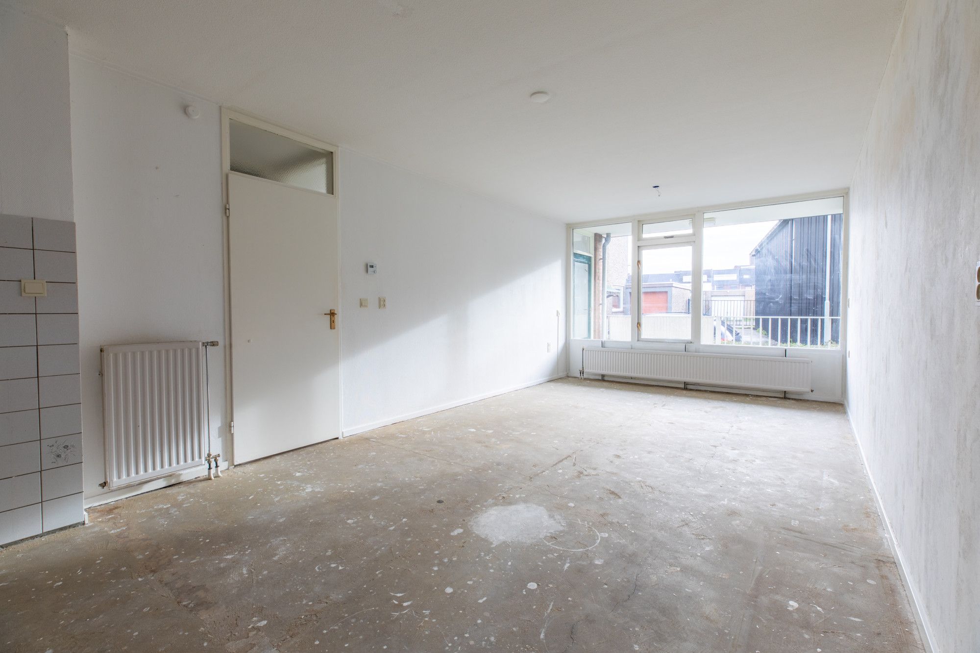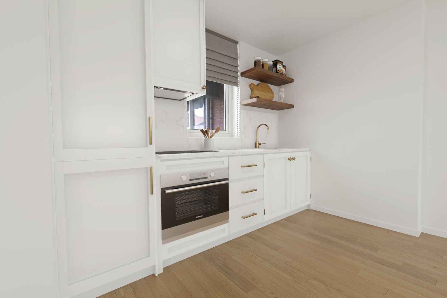 Hal met doorgang naar alle ruimten. Woonkamer met toegang balkon en doorloop naar het open keukengedeelte. In de keuken bevindt zich een functioneel keukenblok.