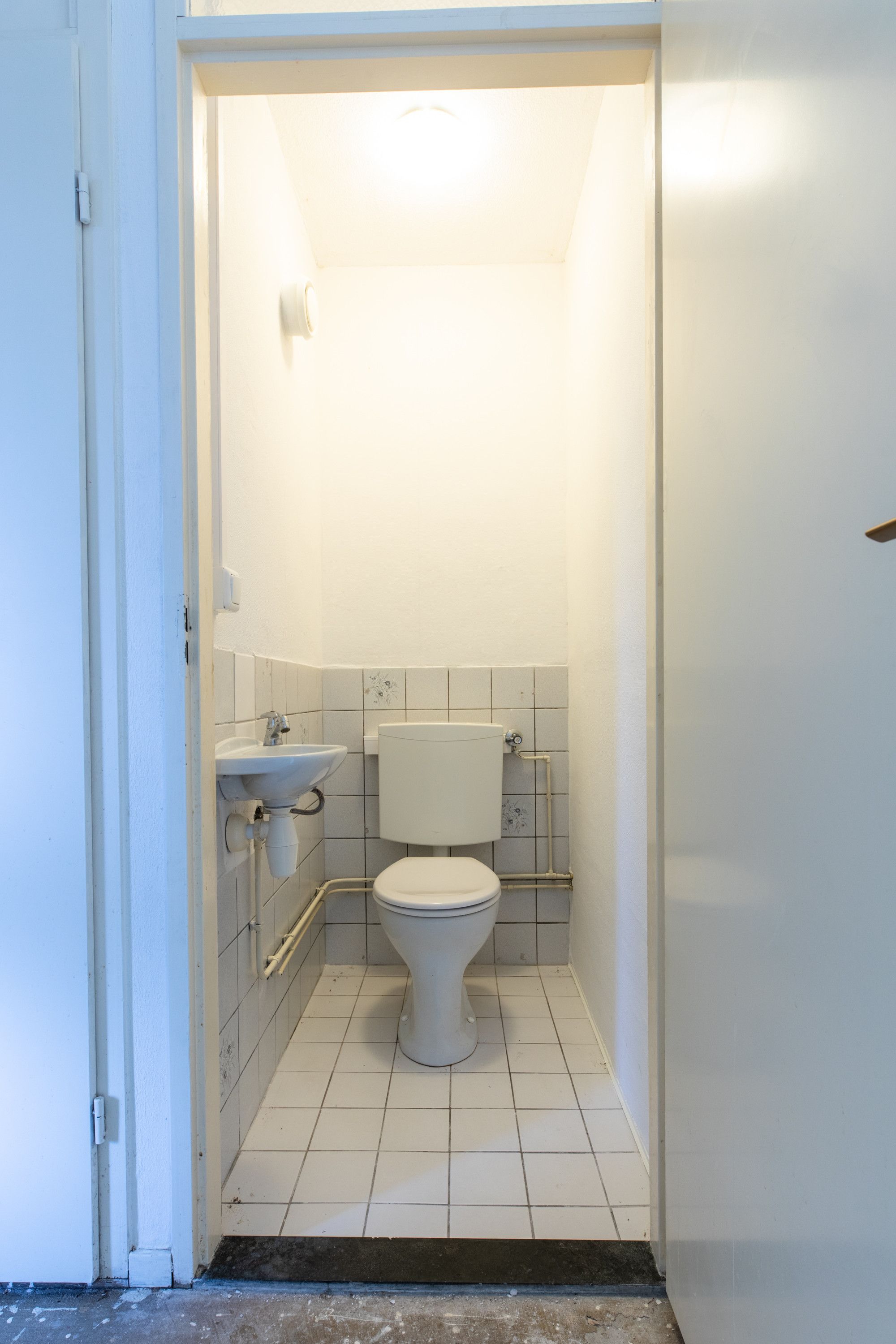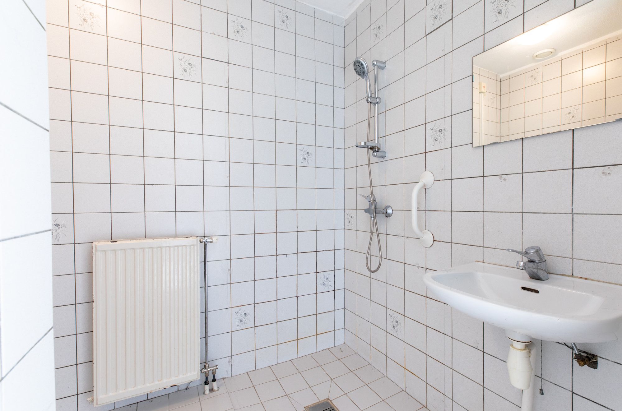 Eenvoudige badkamer met douche, wastafel, aansluiting wasmachine en toilet