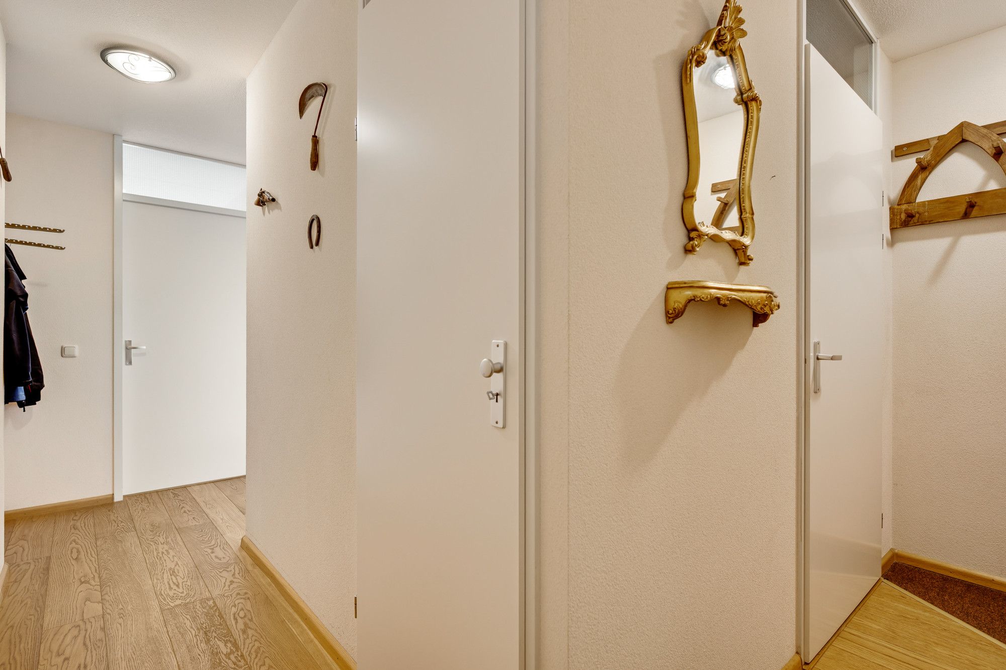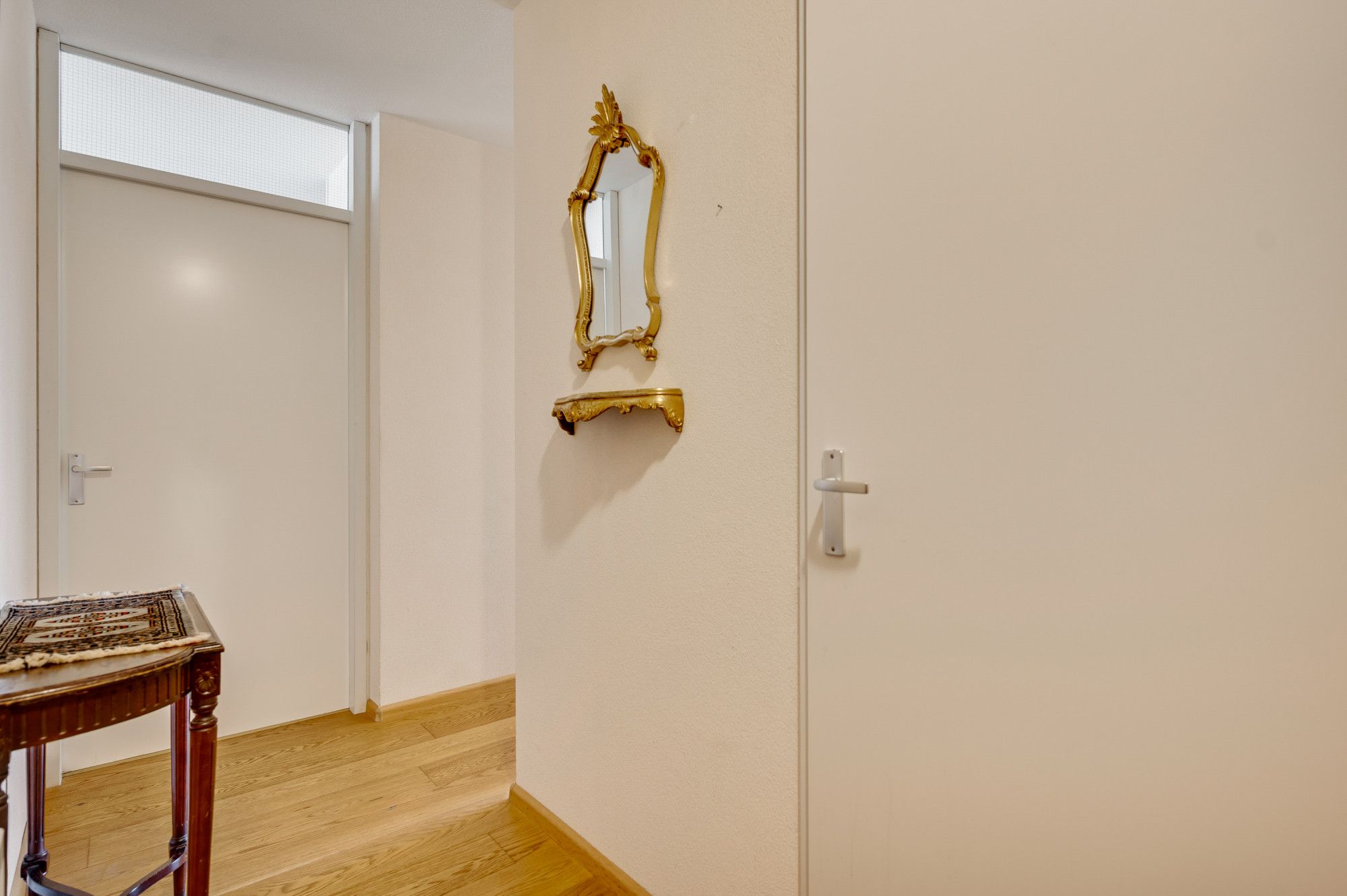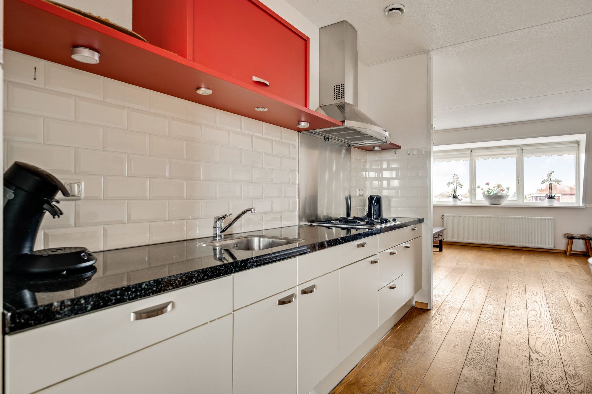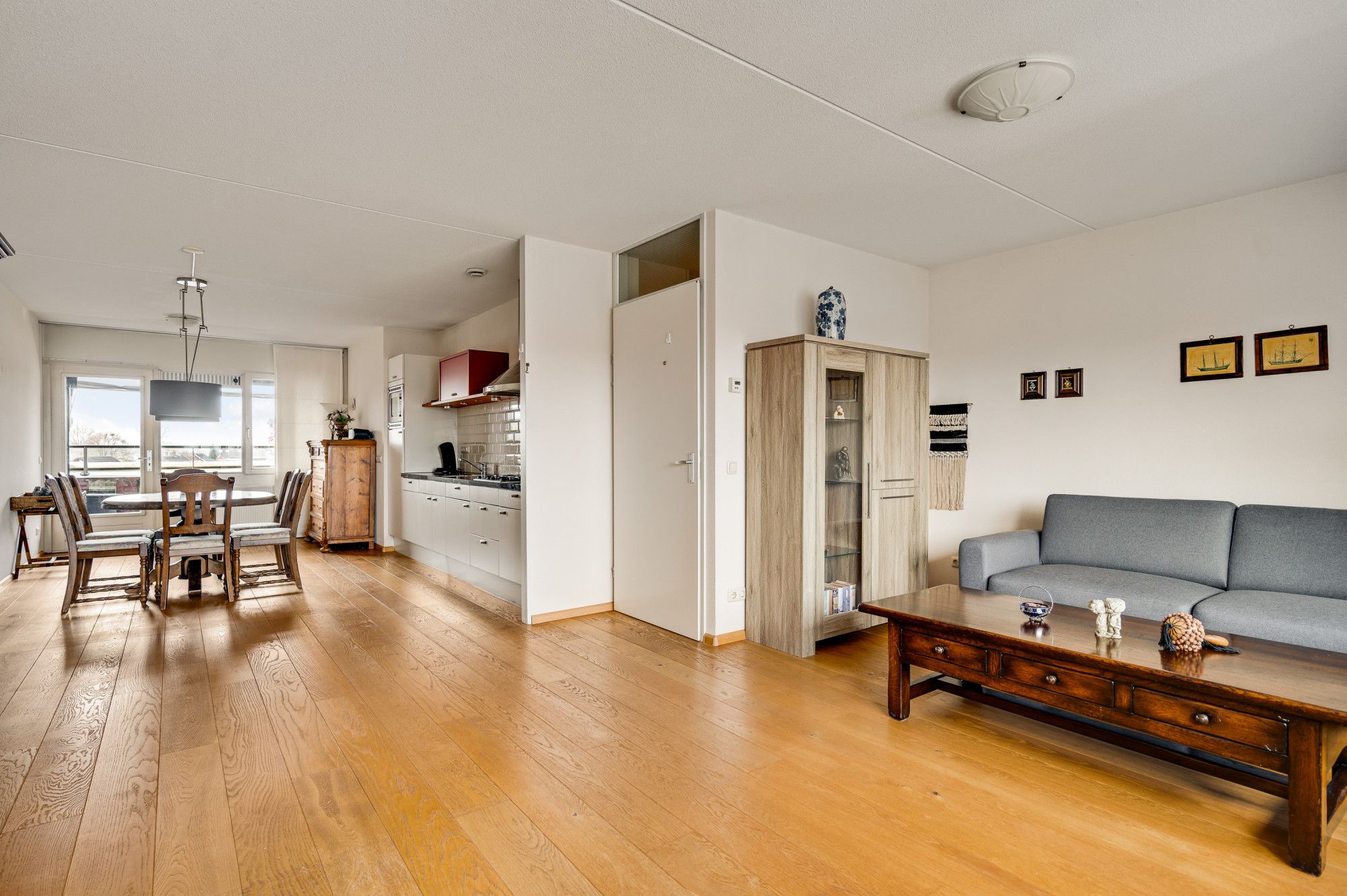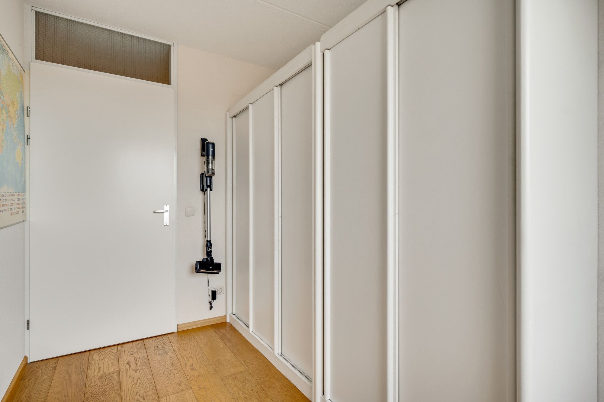 Riante hal met videofoon en moderne meterkast, alsmede een apart toilet met zwevend toilet en fonteintje. Vanuit de centrale hal zijn vrijwel alle ruimtes in het appartement bereikbaar. De ruime woonkamer biedt veel lichtinval door de grote raampartijen in de woonkamer. Vanuit de woonkamer is het balkon toegankelijk met een heerlijks wijd uitzicht, alsmede de open keuken met een combinatie en de navolgende inbouwapparatuur; 4-pits gaskookplaat, afzuigkap, oven, koelkast en een vaatwasser. Inpandig is de praktische berging/bijkeuken te bereiken. Deze biedt volop bergruimte en de aansluitingen voor het witgoed, de unit van de mechanische ventilatie en de opstelling van de cv-combiketel (Intergas combi Kompakt HR, huur, 2021). De complete badkamer is geheel betegeld en uitgerust met een douche, wastafel en een meubel. Verder zijn er 2 ruime slaapkamers aanwezig. De verdieping is deels voorzien van een mooie houten vloer.