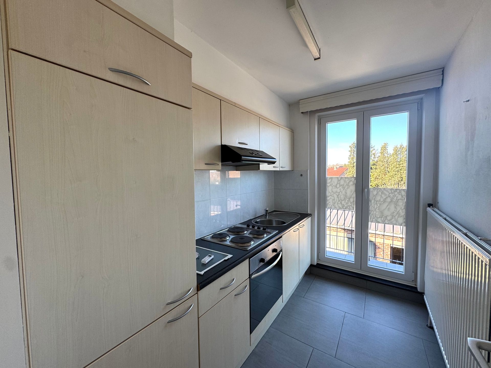 Via de trap bereiken we het appartement. De ruime en lichtrijke woonkamer vormt het hart van de woonst. Aansluitend is er de keuken, uitgerust met een oven, koelkast en elektrische kookplaat. Vanuit de keuken is er toegang tot een klein balkon.
