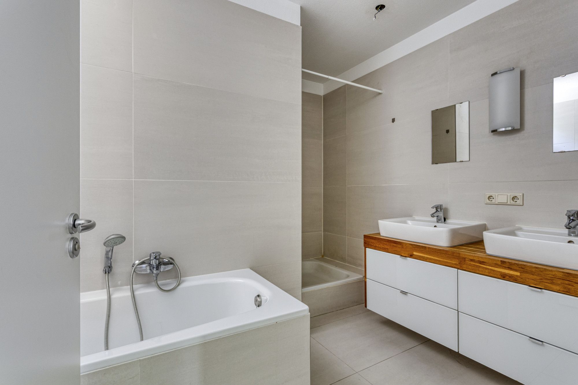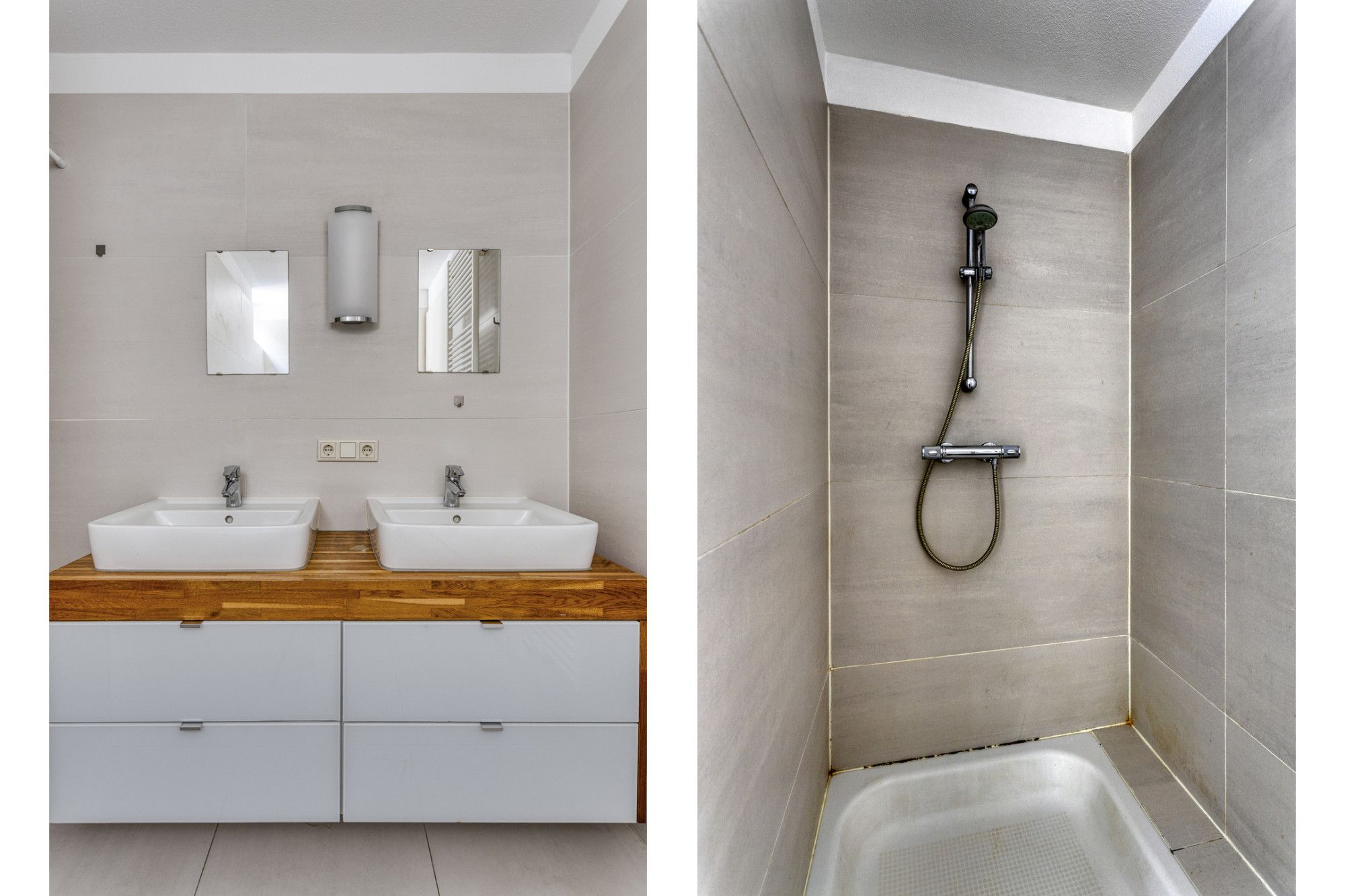 - Luxe badkamer van circa 9 m² met douche, ligbad, wandcloset en dubbele wastafel op meubel.