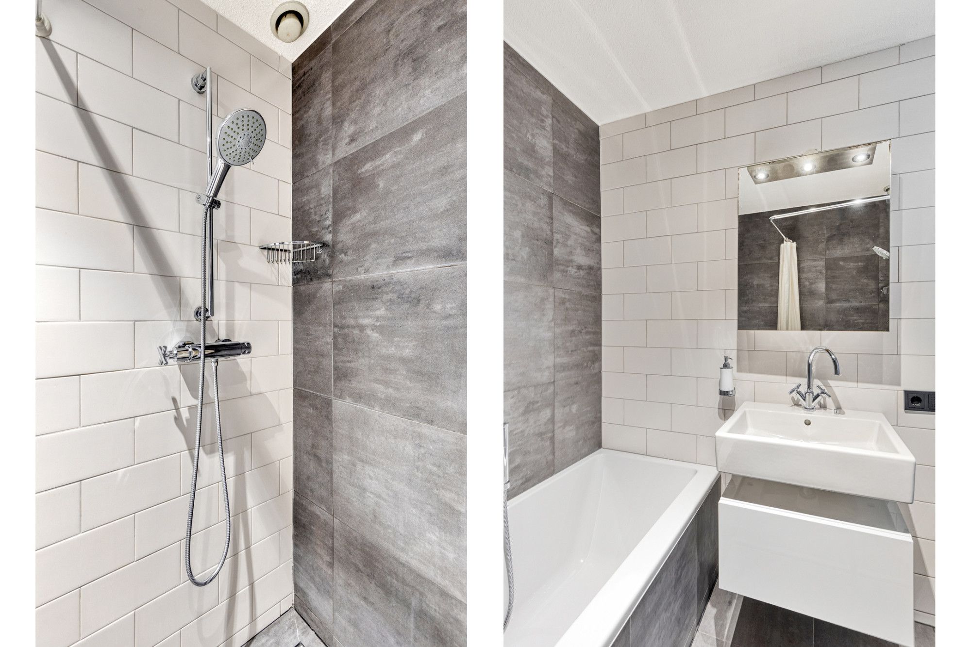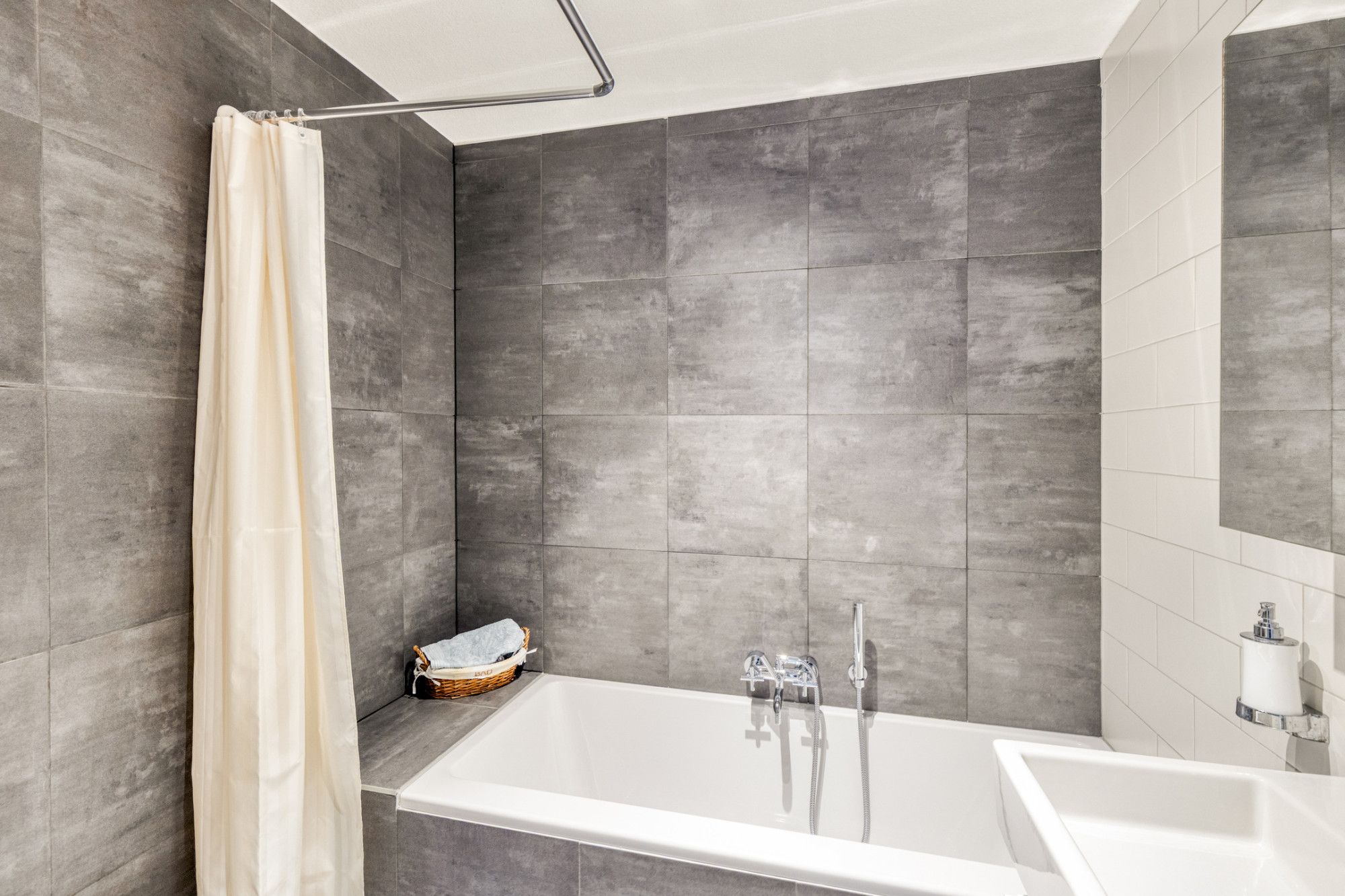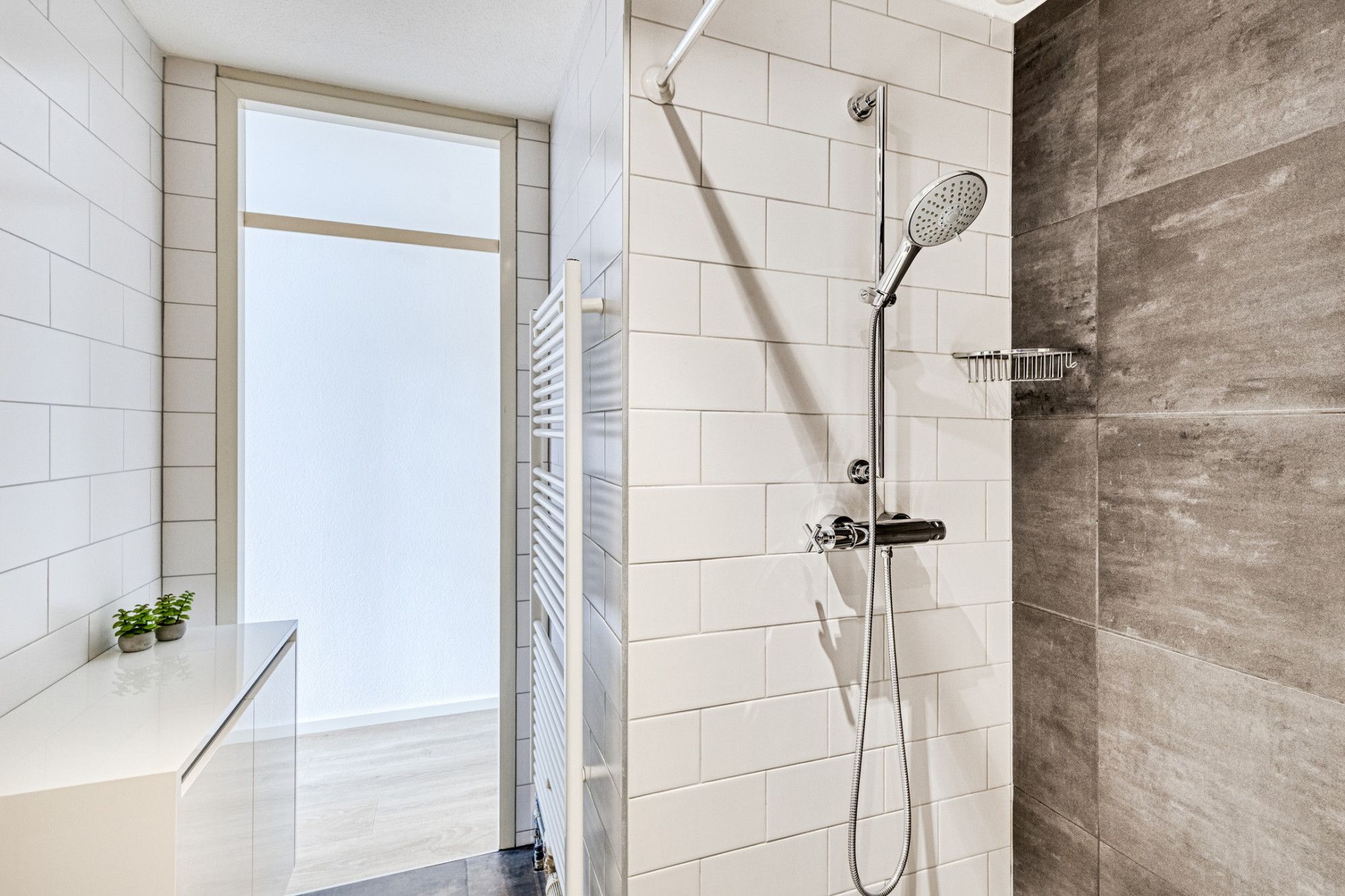 Badkamer (2.81 x 2.02 m) voorzien van verzonken douche, ligbad,, design radiator, ingebouwde radio en vaste wastafel in badmeubel.