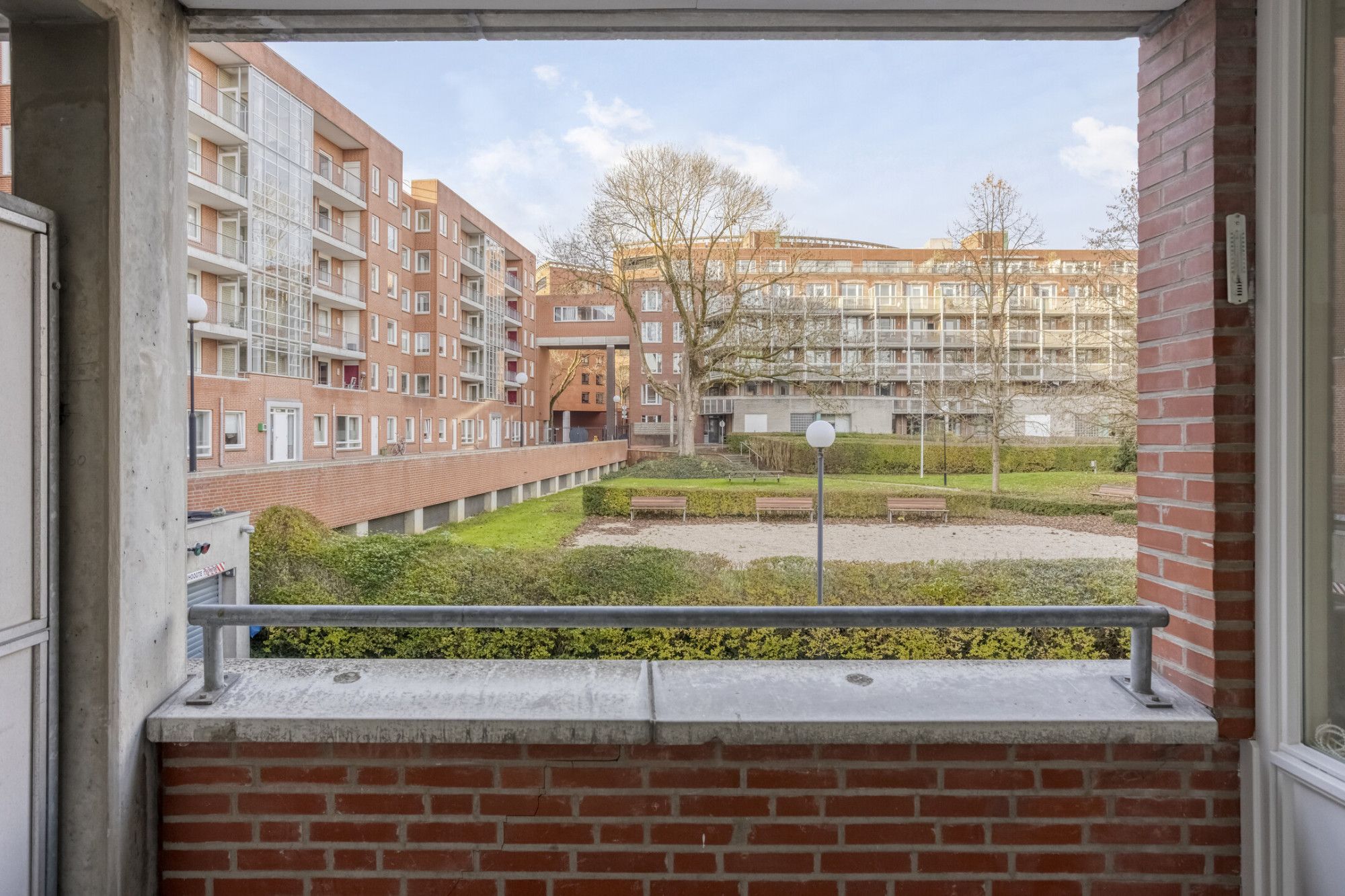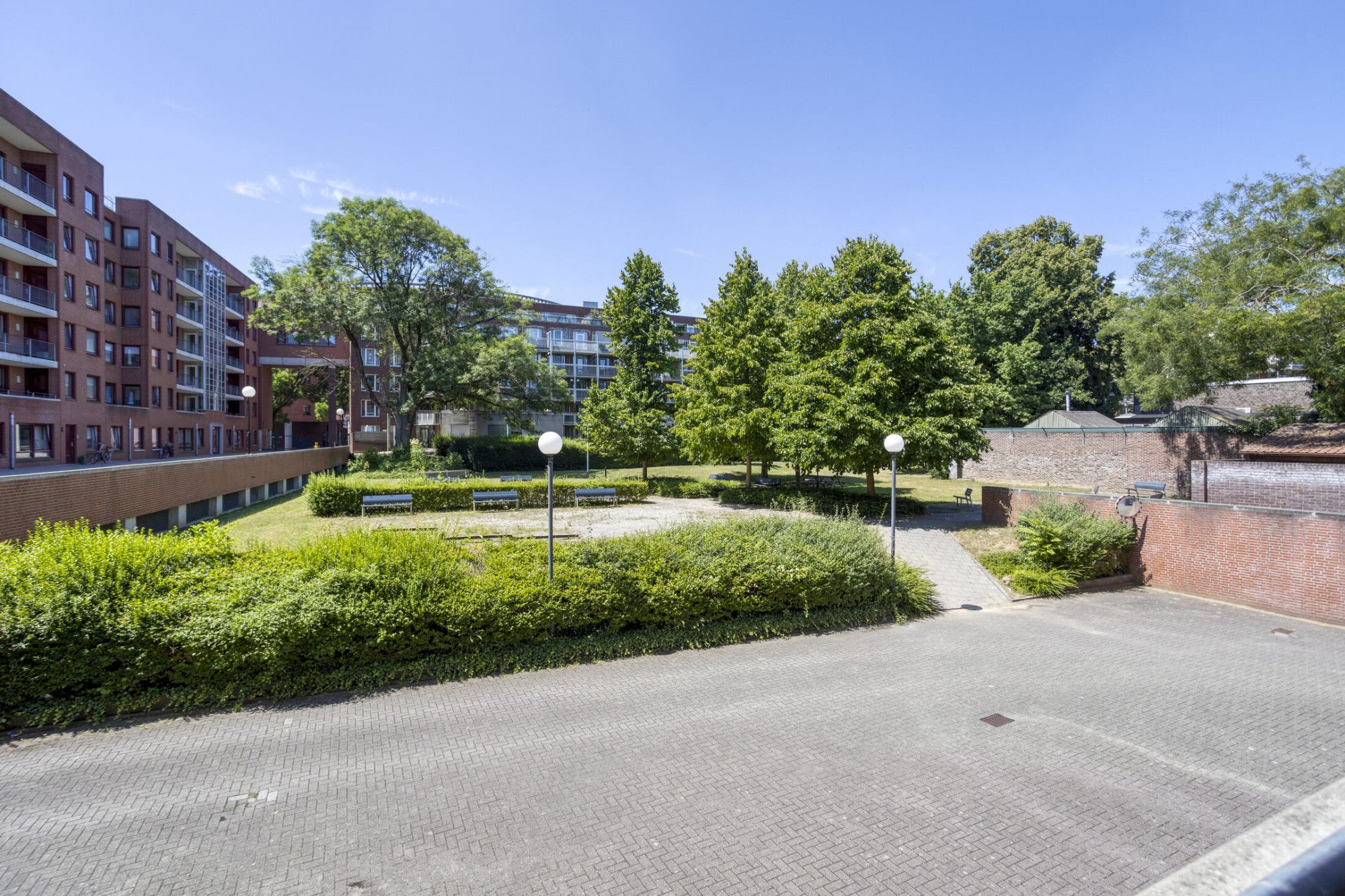 Aan de achterzijde kijk je vrij weg over het groen van het omsloten park: rustig, beschut en zonder directe inkijk. Boodschappen, horeca, cultuur en dagelijkse voorzieningen heb je allemaal in de buurt, je auto heb je hier eigenlijk nauwelijks nodig.
