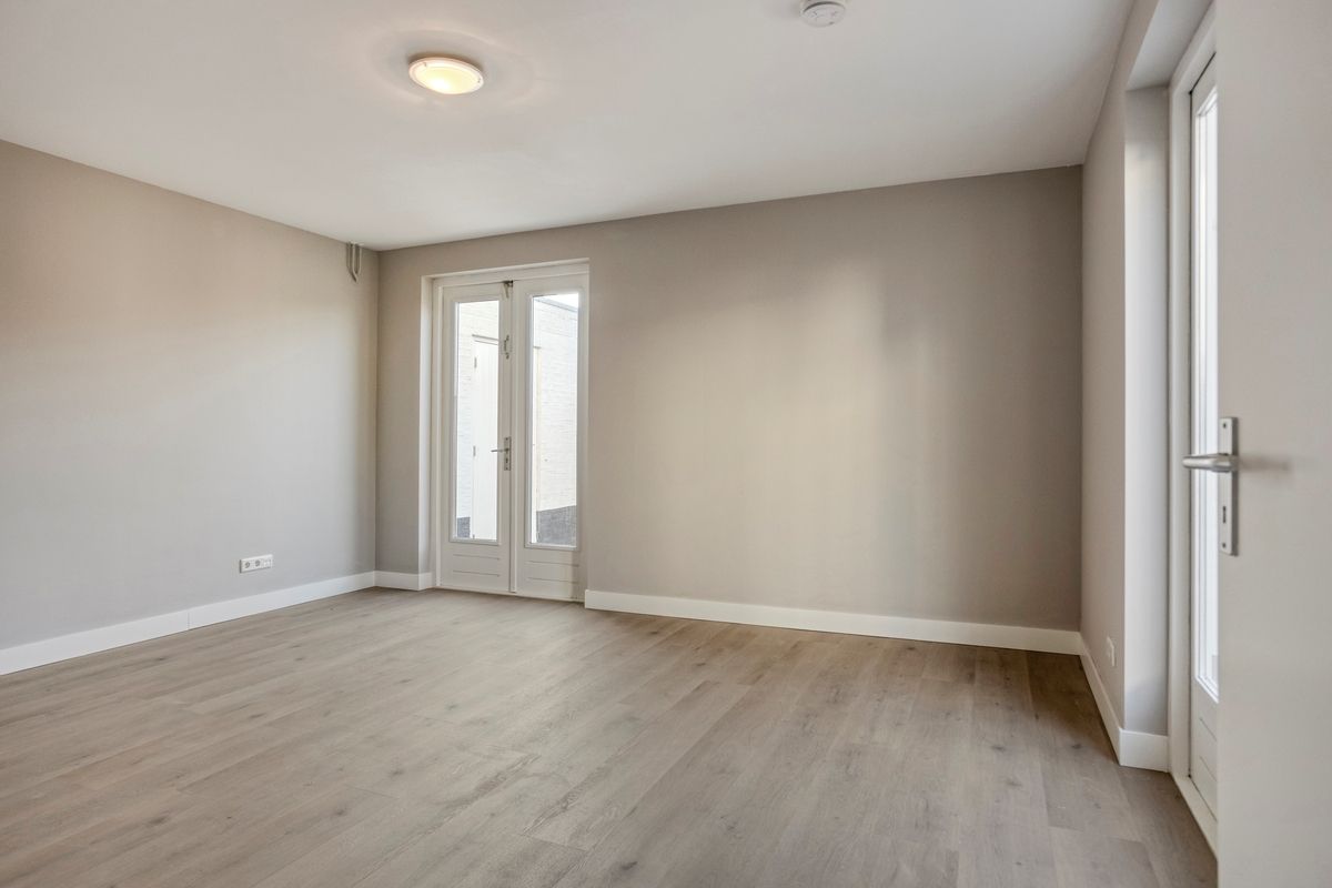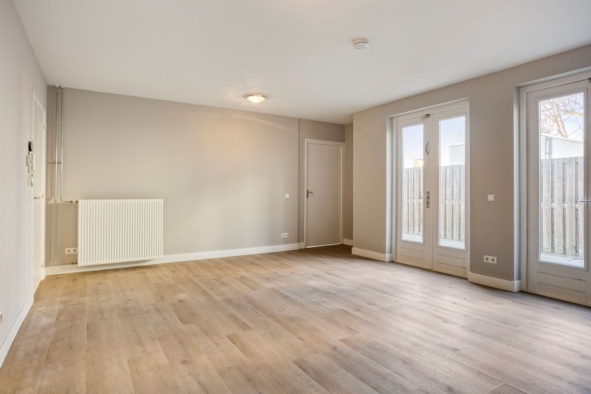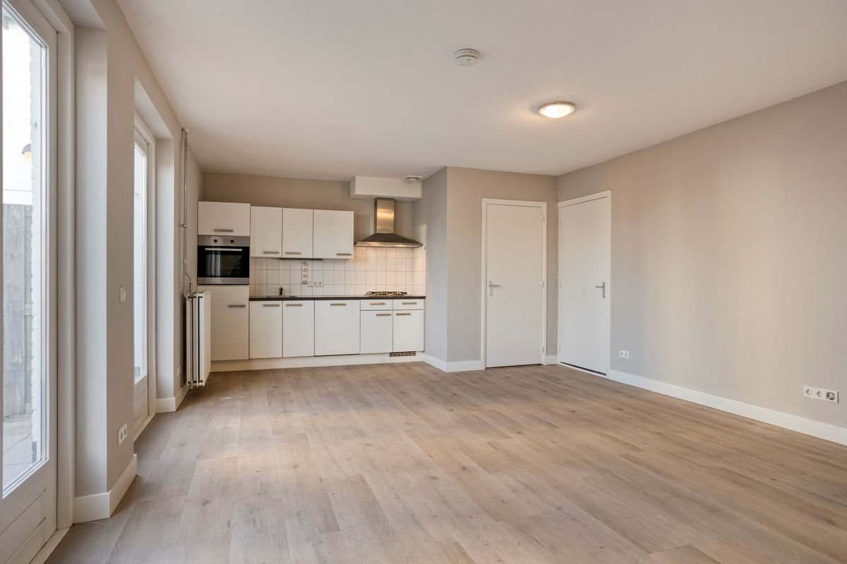Indeling: Begane grond: entree, meterkast; hal, ruim toilet met fonteintje, woonkamer (ruim 31m2) met nieuwe PVC vloer, open keuken met 4-pits gaskookplaat, afzuigkap, koelkast en oven. De woonkamer beschikt over twee openslaande deuren naar het terras; berging met cv-installatie (eigendom) en wasmachine aansluiting; badkamer met wastafel en douche; 1 grote slaapkamer van 18m2 (twee kamers mogelijk) eveneens met twee openslaande deuren naar het terras. De privé tuin met fietsenberging bevindt zich aan de achterzijde van het appartement (Zuid-ligging).