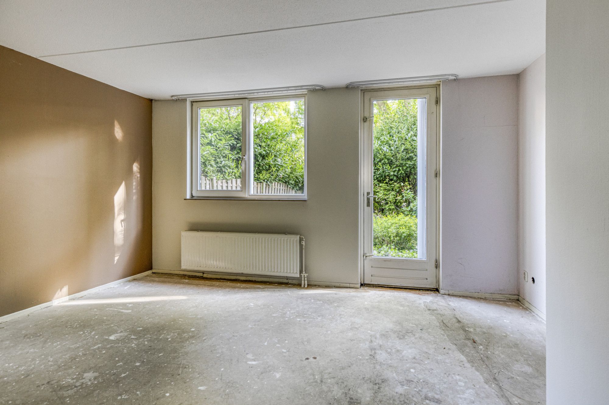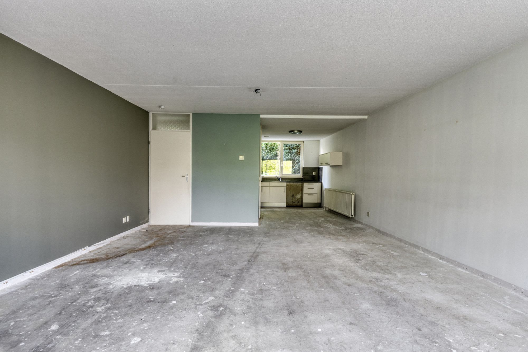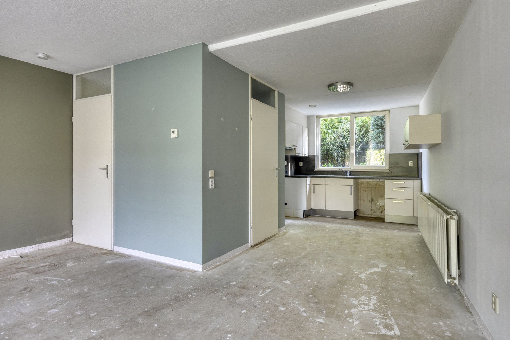 - Woonkamer met open keuken van totaal circa 49 m², uitzicht over de gemeenschappelijke tuin aan de achterzijde.