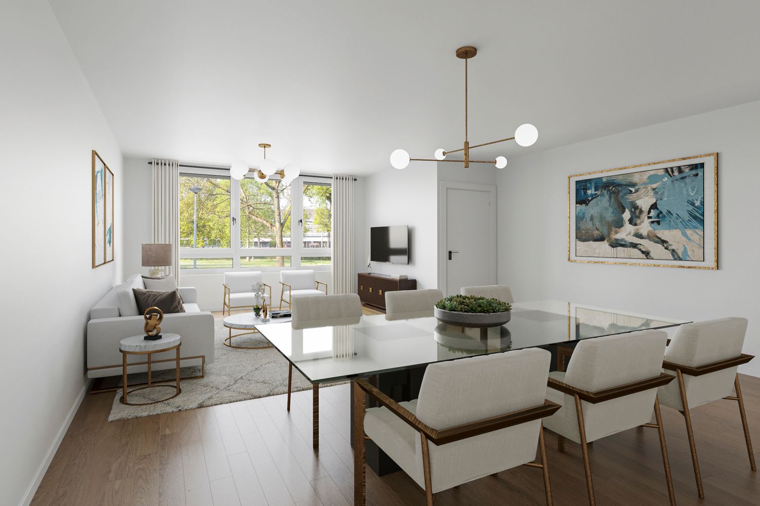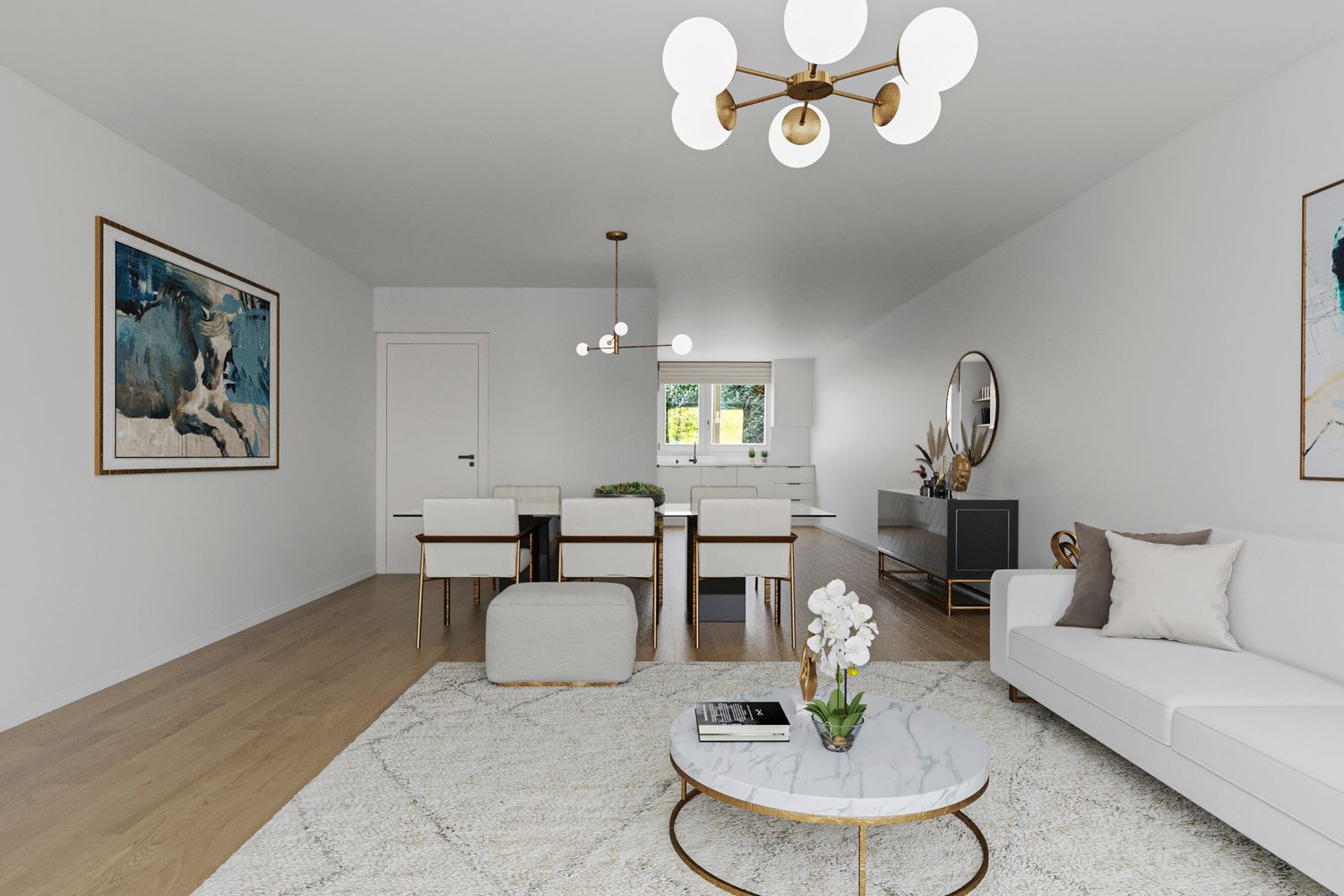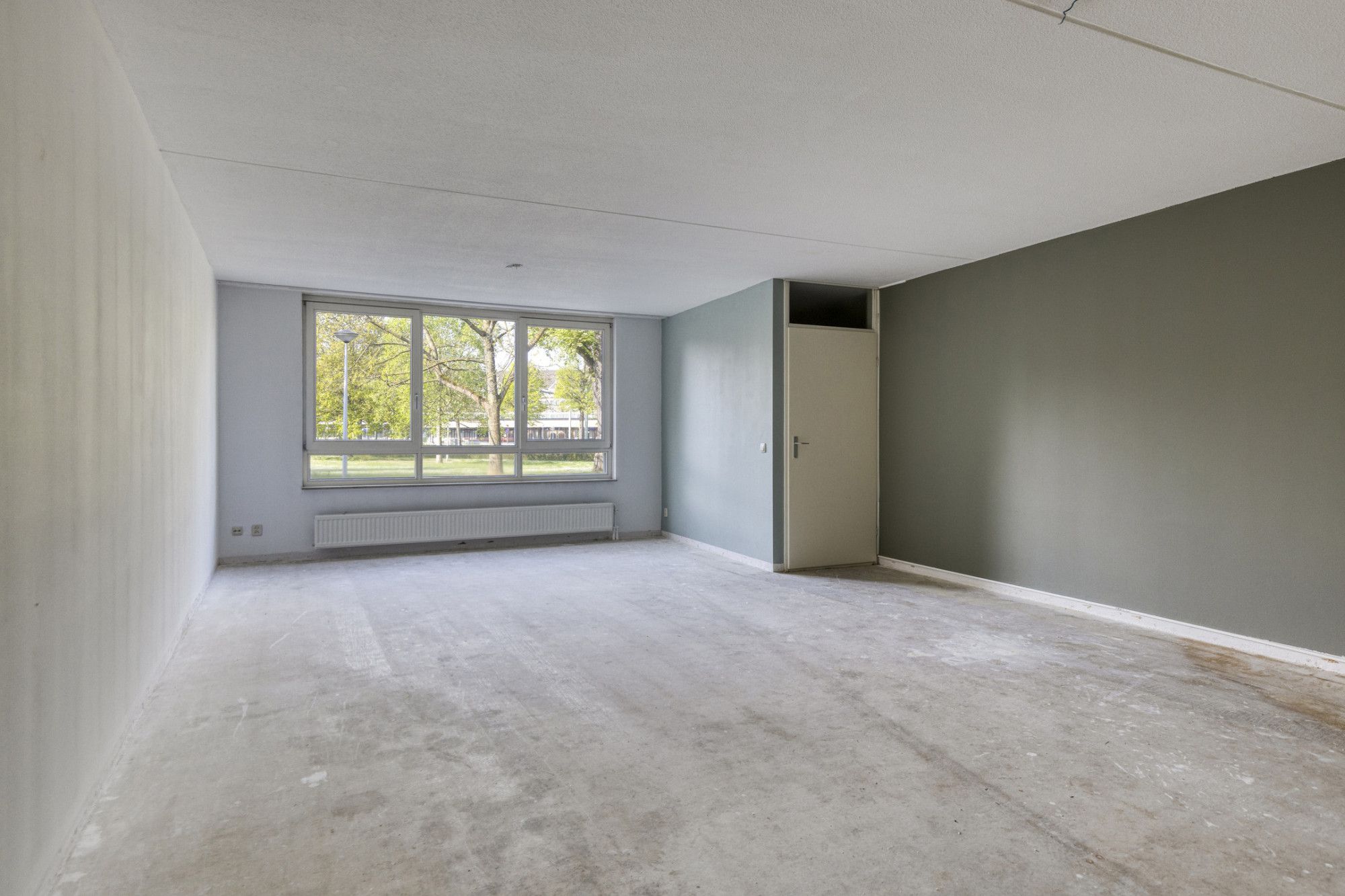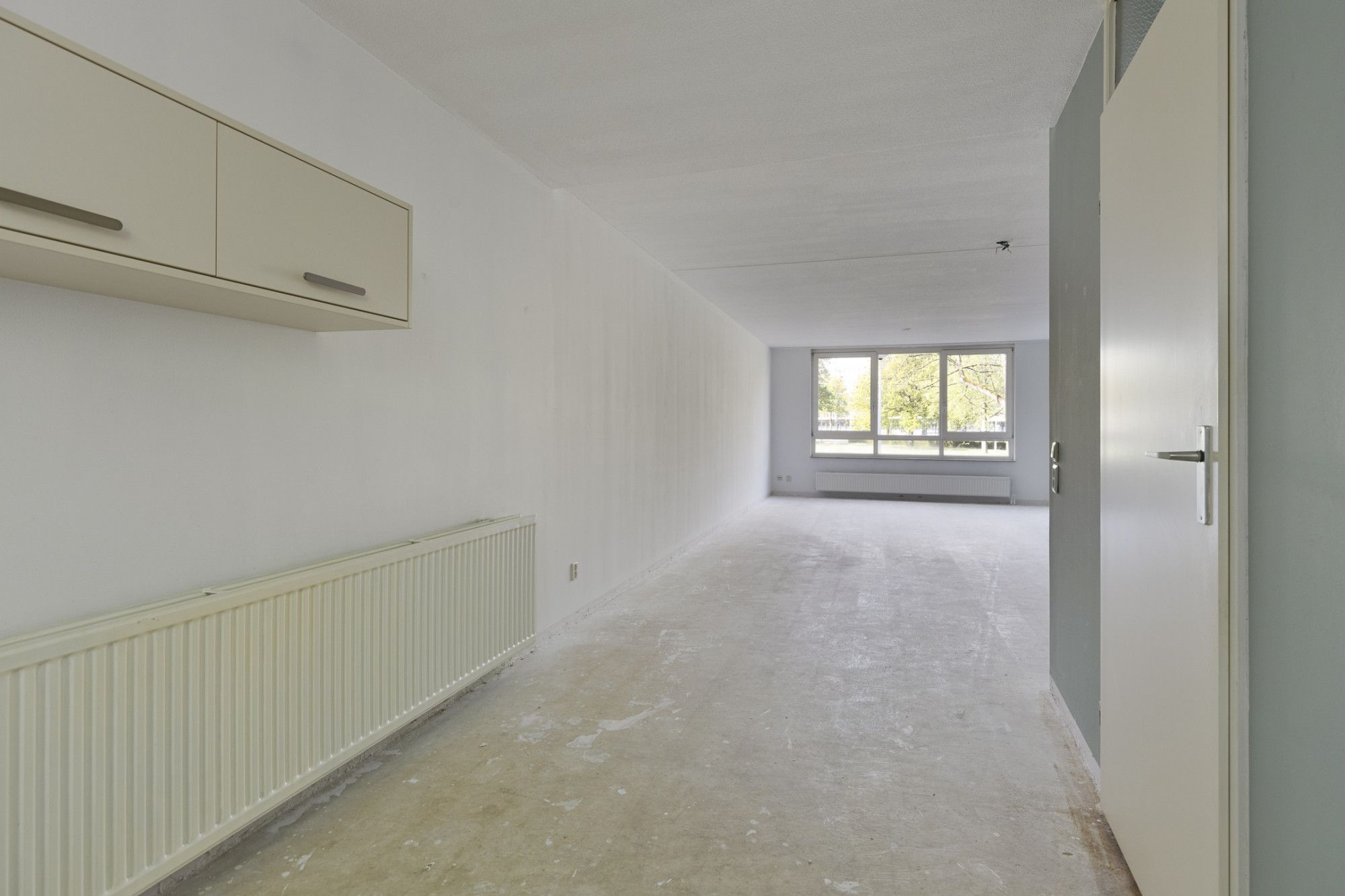 - Woonkamer met open keuken van totaal circa 49 m², uitzicht over de gemeenschappelijke tuin aan de achterzijde.