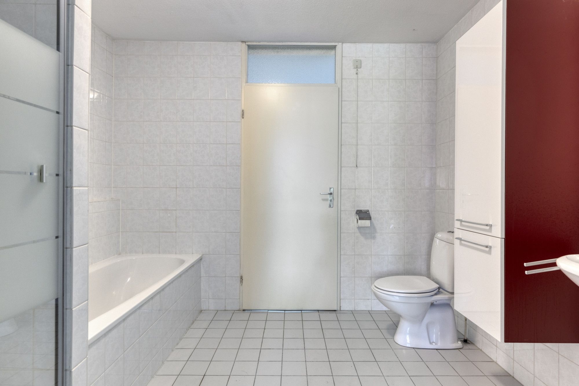 - Badkamer van circa 6 m² met witte wandtegels, douchecabine, ligbad, tweede toilet en wastafel. De badkamer is bereikbaar vanuit beide slaapkamers.