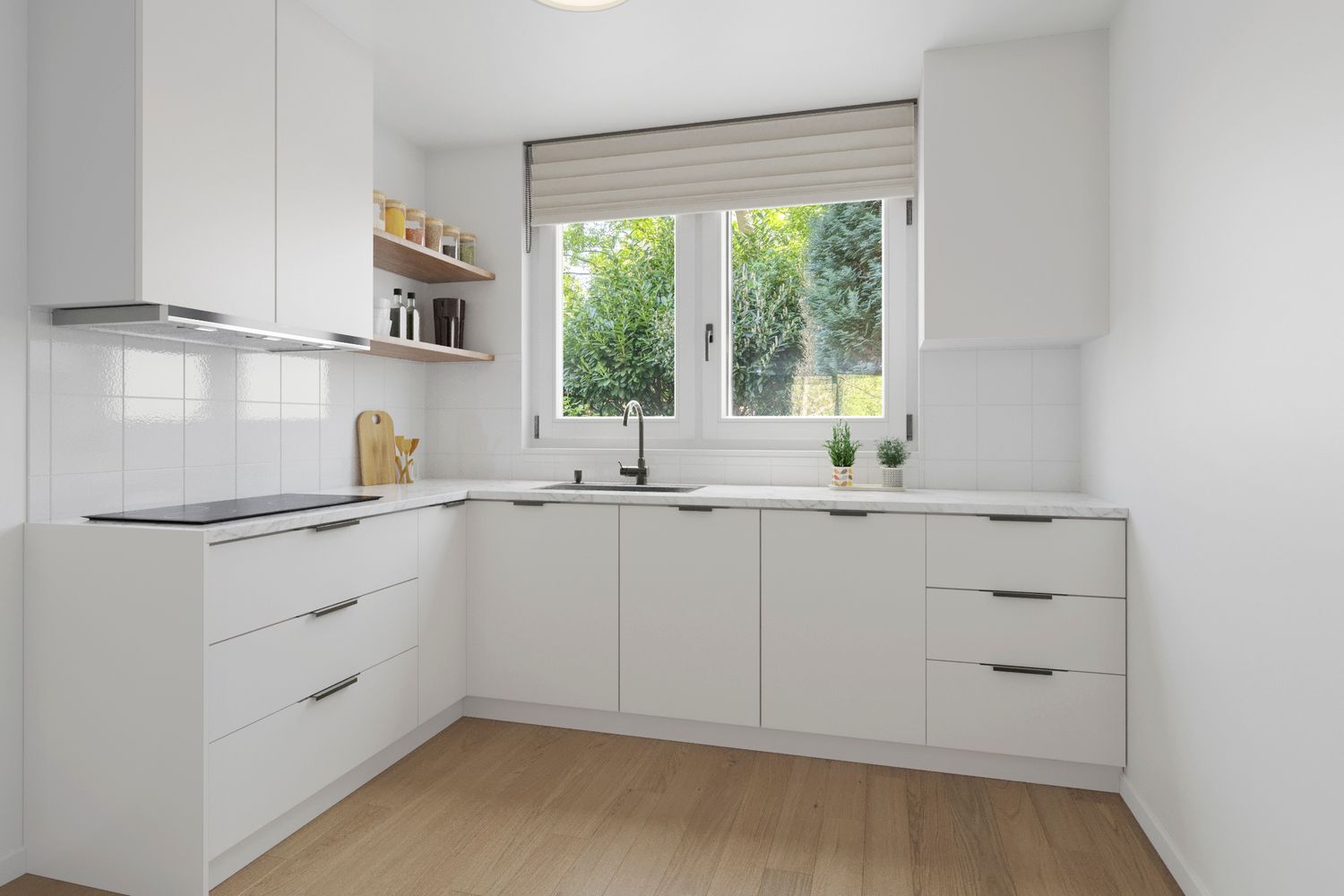 De keuken is voorzien van een eenvoudige, doch nette L-vormige inrichting.