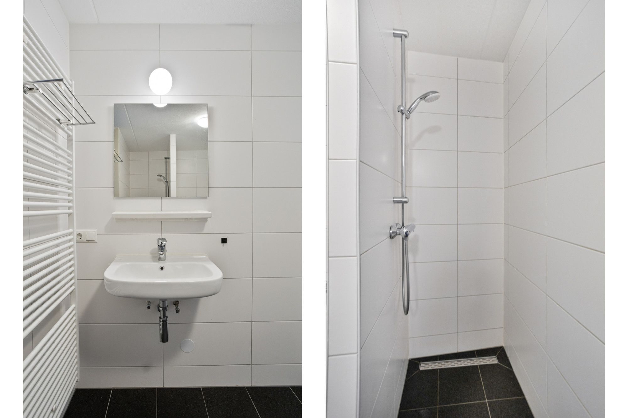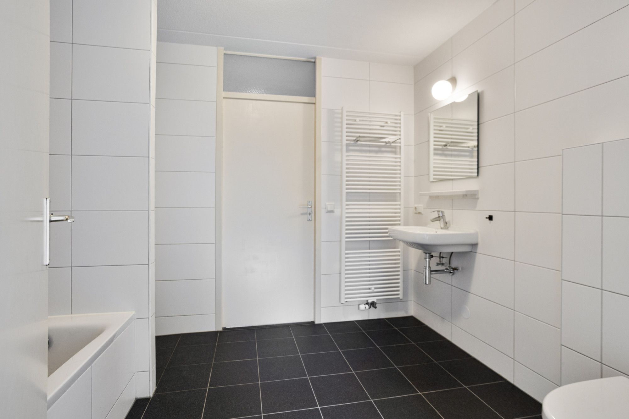 - Nette betegelde badkamer van ca. 8 m² met inloopdouche, ligbad, toilet en wastafel.
