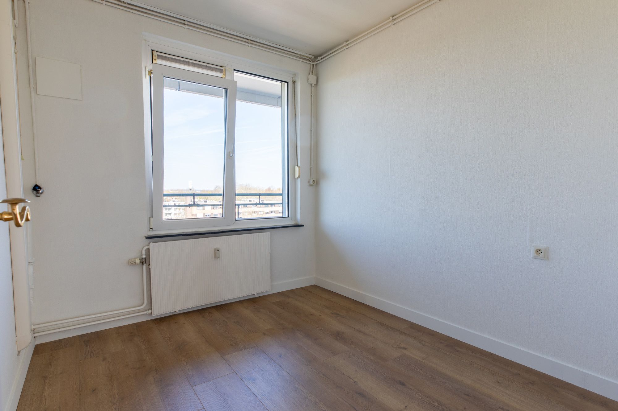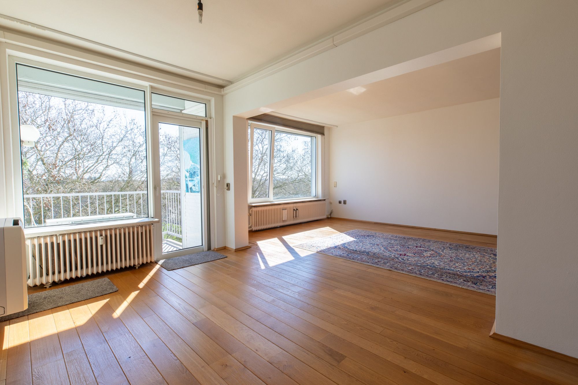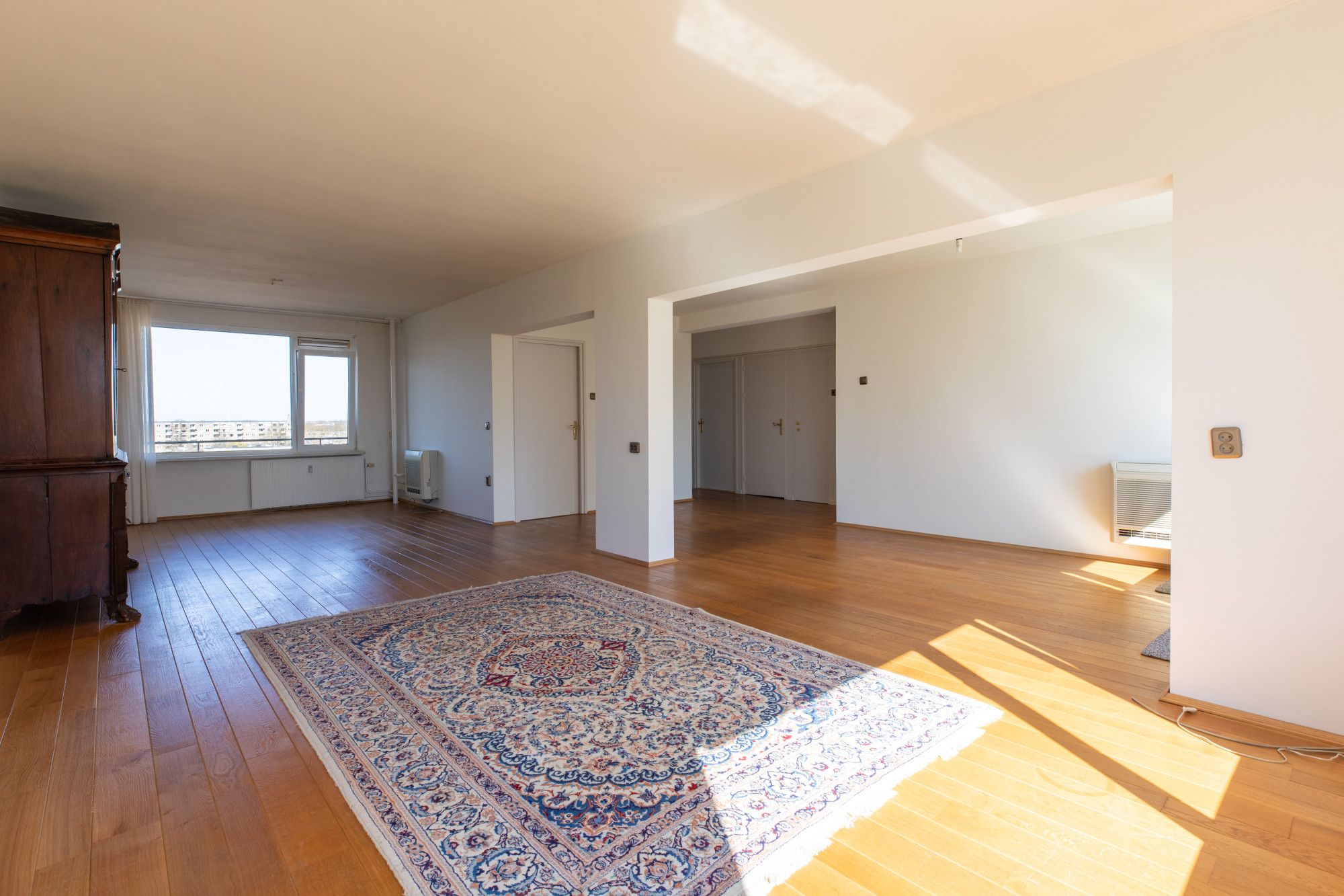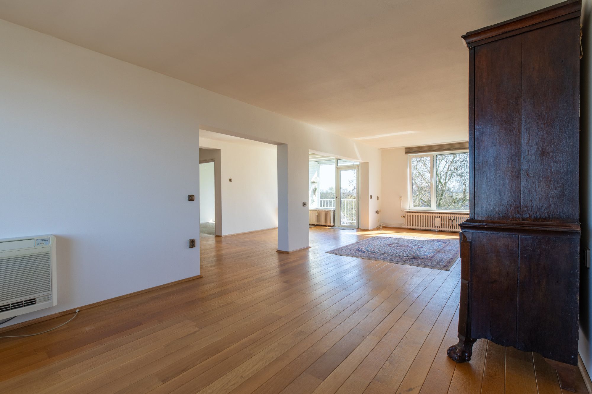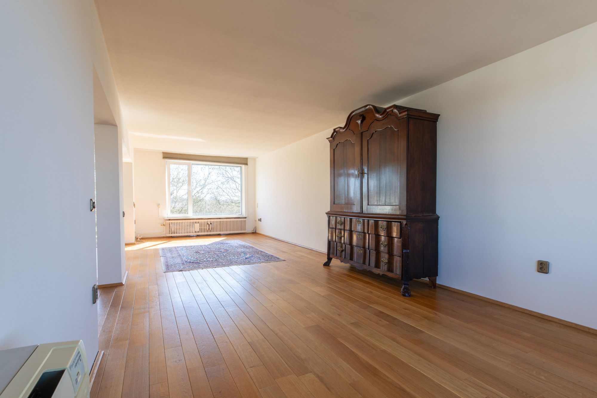 - De riante doorzon woonkamer van ca. 53 m² is voorzien een sfeervolle houten vloer en airco en geeft toegang tot het balkon. De grote raampartijen garanderen een optimale lichtinval en bieden tevens een fraai uitzicht.