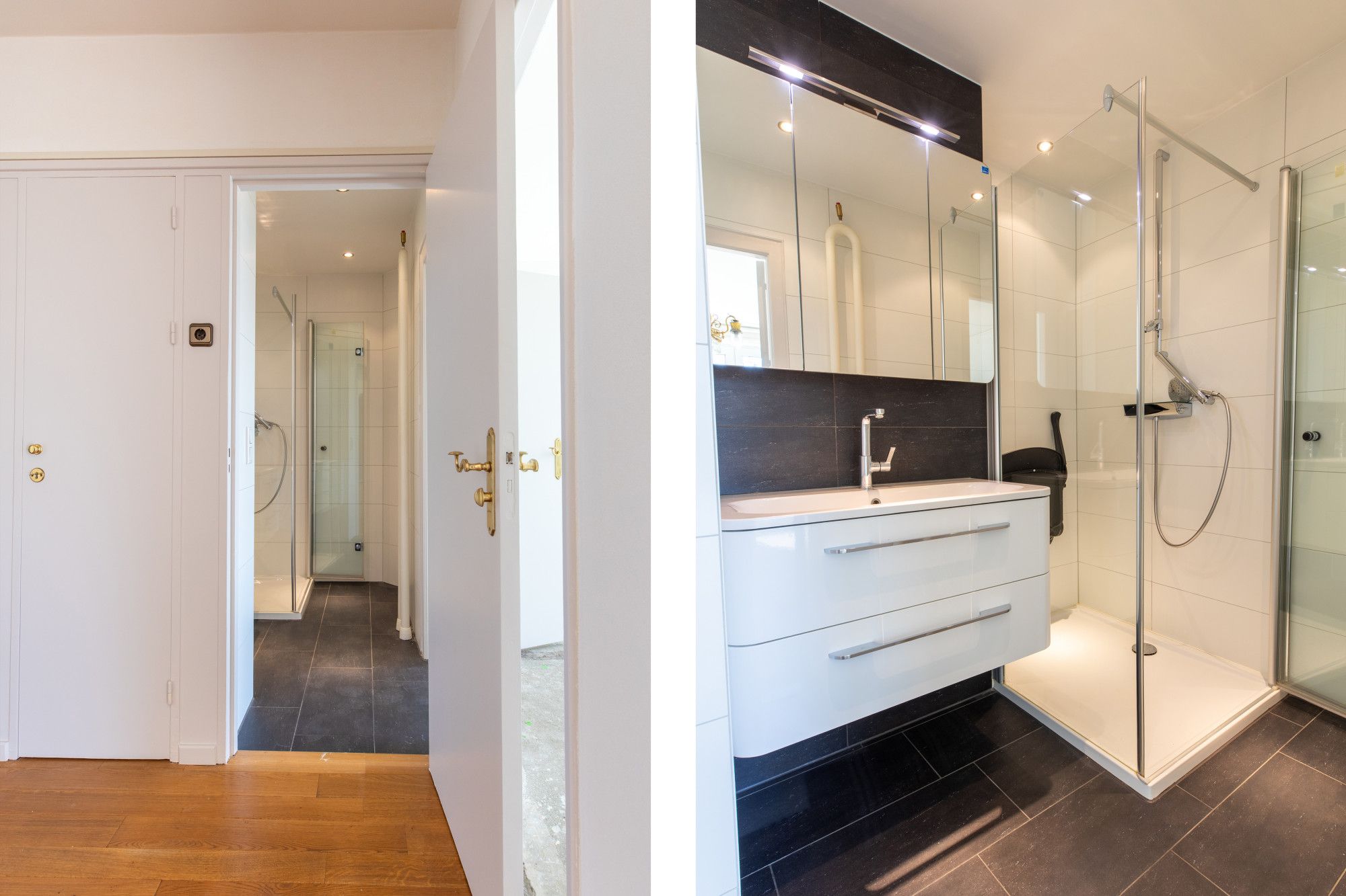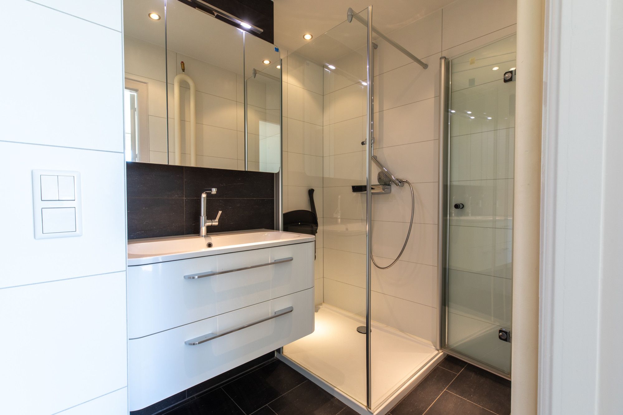 - Moderne badkamer met glazen douchecabine en wastafelmeubel.