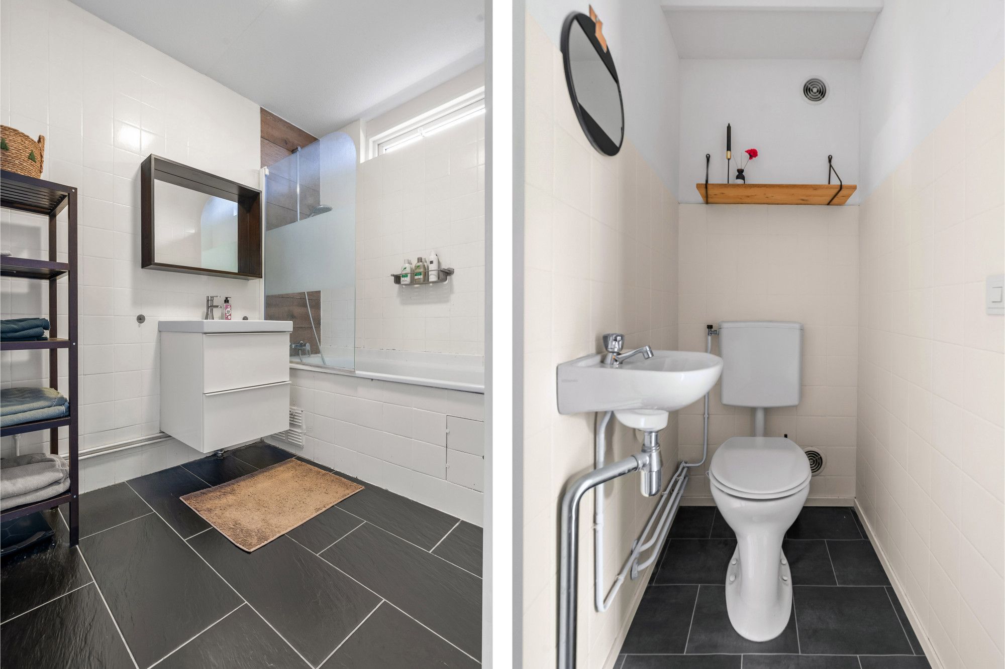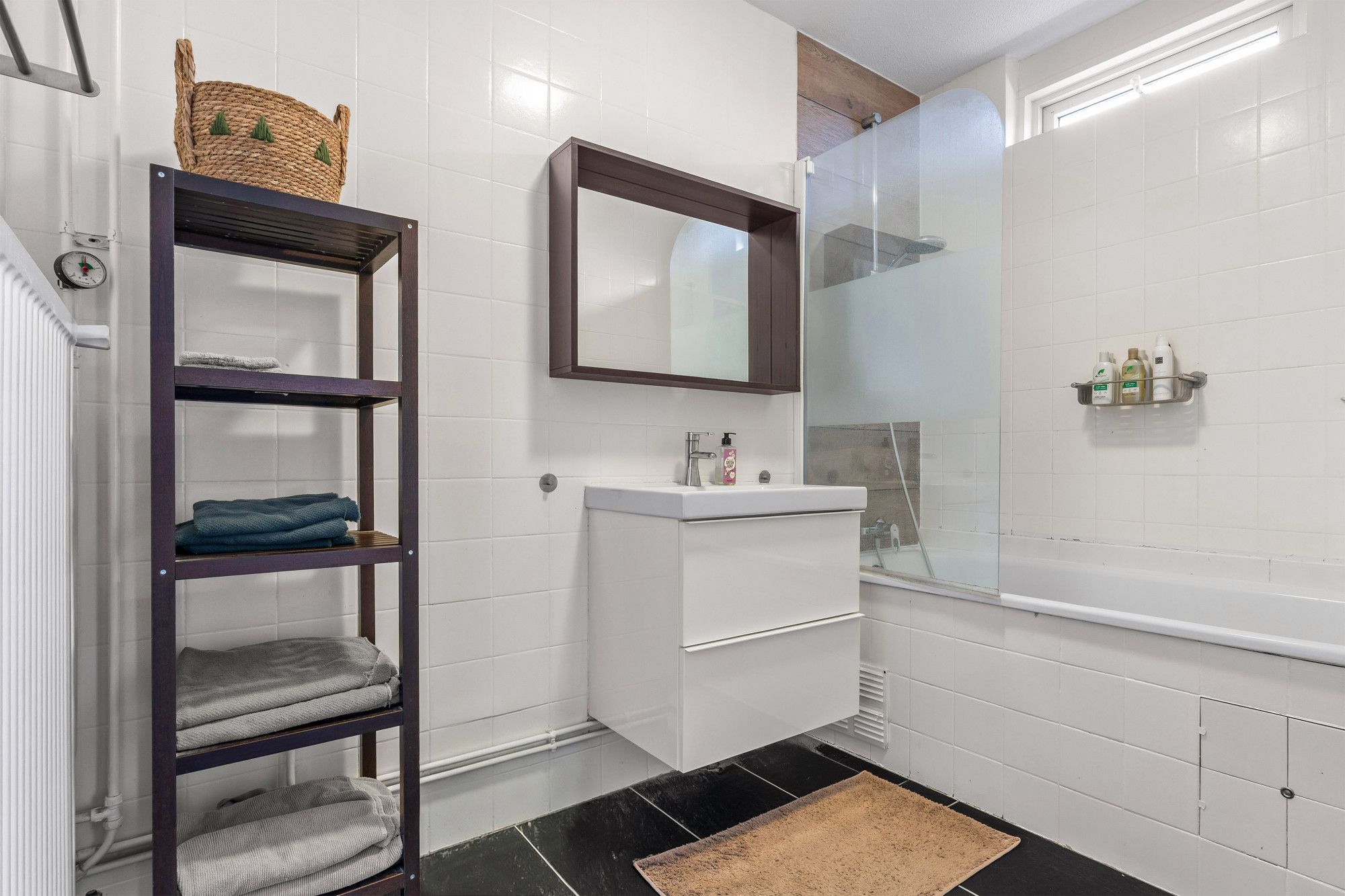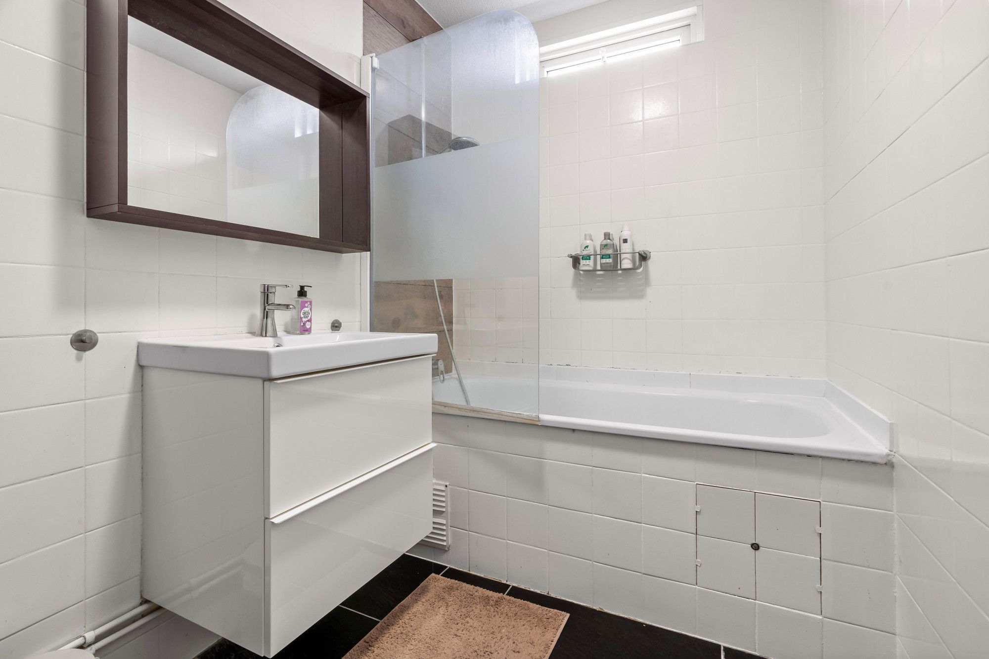 - Badkamer voorzien van ligbad en wastafel met meubel.