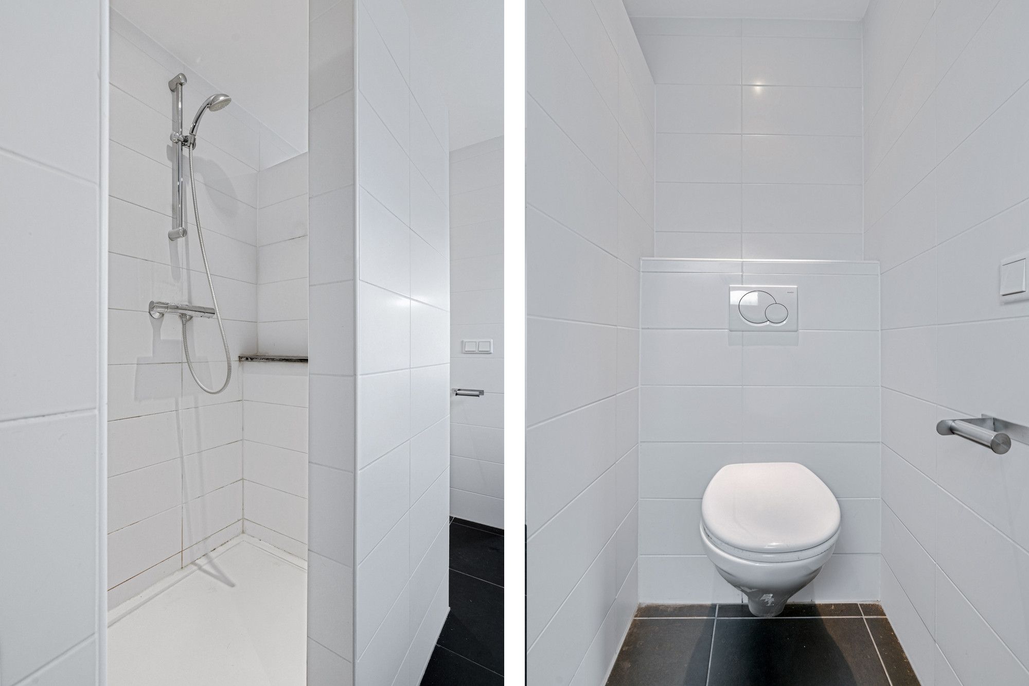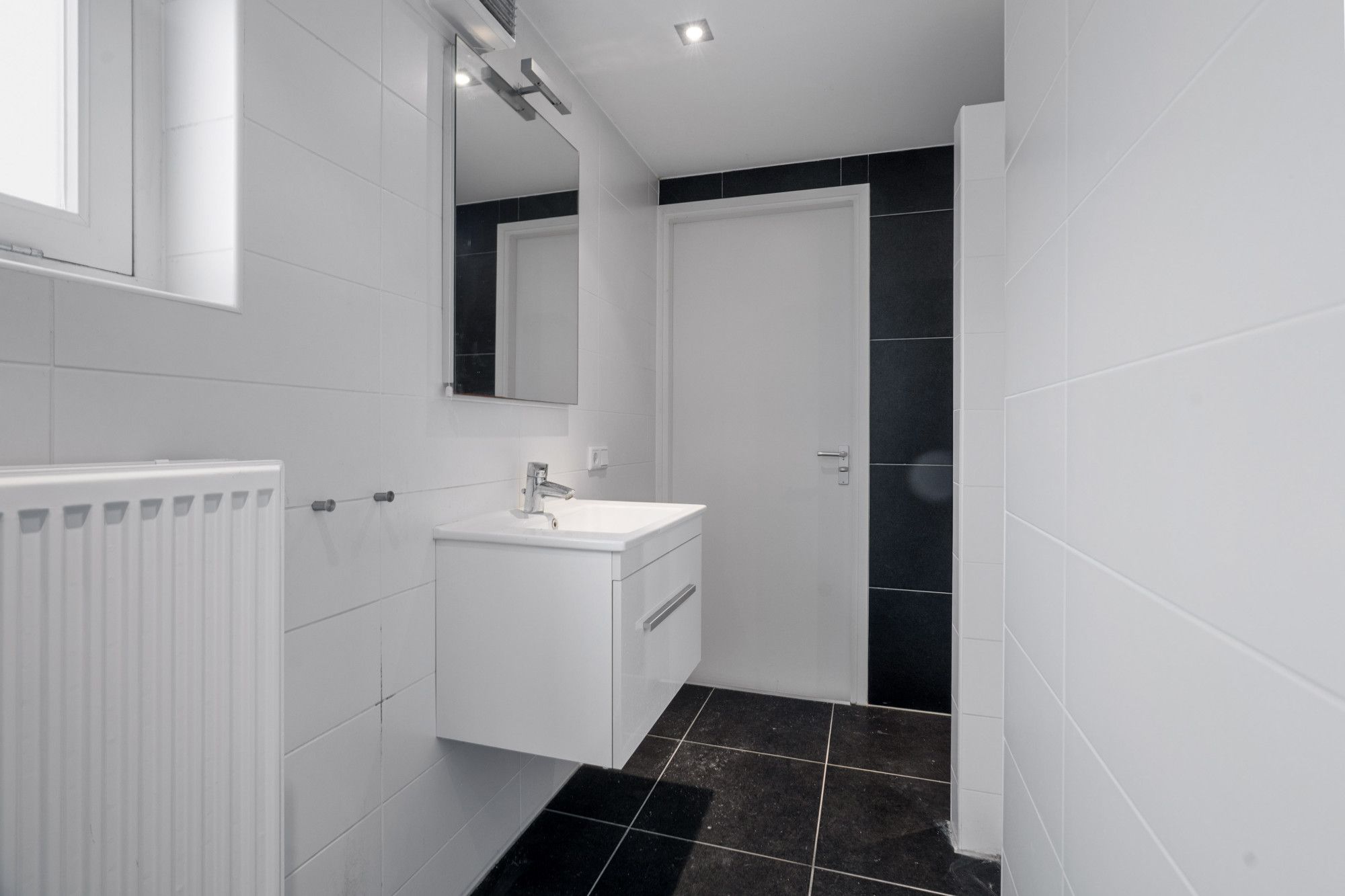 De moderne badkamer is volledig betegeld en uitgerust met een wastafel in meubel, toilet en inloopdouche. De afwerking is verzorgd en eigentijds, waardoor de ruimte direct een frisse uitstraling heeft.