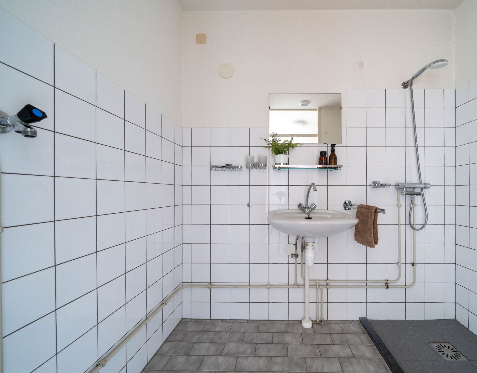 De entree met meterkast biedt toegang tot de ruime en lichte woon/eetkamer, twee slaapkamers, badkamer, toilet en de open keuken. De badkamer en het toilet zijn halfhoog betegeld. In de badkamer bevindt zich een vaste wastafel en douche.