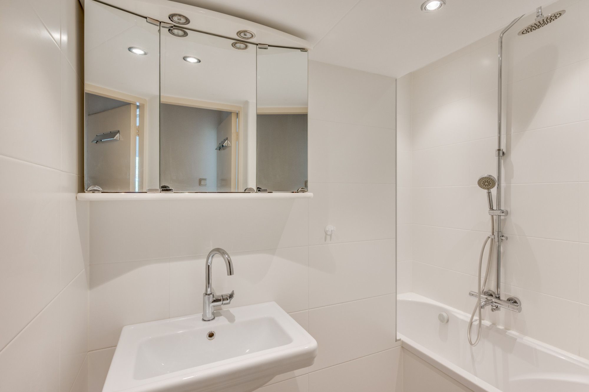 De hal geeft toegang tot de garderobe, keuken, woonkamer, 2 slaapkamers, badkamer en de toiletruimte. De keuken (ca. 8m2) is ingericht met een keramische kookplaat, afzuigkap, oven, koelkast, witgoedaansluitingen, muurkast en een loopdeur naar het balkon. De royale doorzonwoonkamer is ca. 40m2 en is voorzien van een balkon aan de voorzijde. Er bestaat de mogelijkheid om een gedeelte van de woonkamer te gebruiken als 3e slaapkamer. De slaapkamers zijn ca. 10m2 en ca. 10m2. De geheel betegelde badkamer is ingericht met een ligbad met douchefaciliteit (regen- en handdouche), wastafel, badkamermeubel en inbouwspotjes. De geheel betegelde toiletruimte is voorzien van een staand closet en fonteintje. De gehele verdieping is voorzien van dezelfde laminaatvloer en grotendeels voorzien van gestucte wanden.