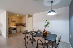 De woonkamer met open keuken krijgt veel natuurlijk lichtinval en is ca. 43m² groot. De open keuken is verdekt opgesteld en voorzien van een afzuigkap en spoelbak. Vanuit de hal is de technische ruimte te betreden, tevens is hier nog ruimte voor een extra koelkast/ diepvries. Vanuit de woonkamer is het balkon te betreden. Middels een loopdeur is er toegang tot het balkon. Het gehele appartement is voorzien van een laminaatvloer.