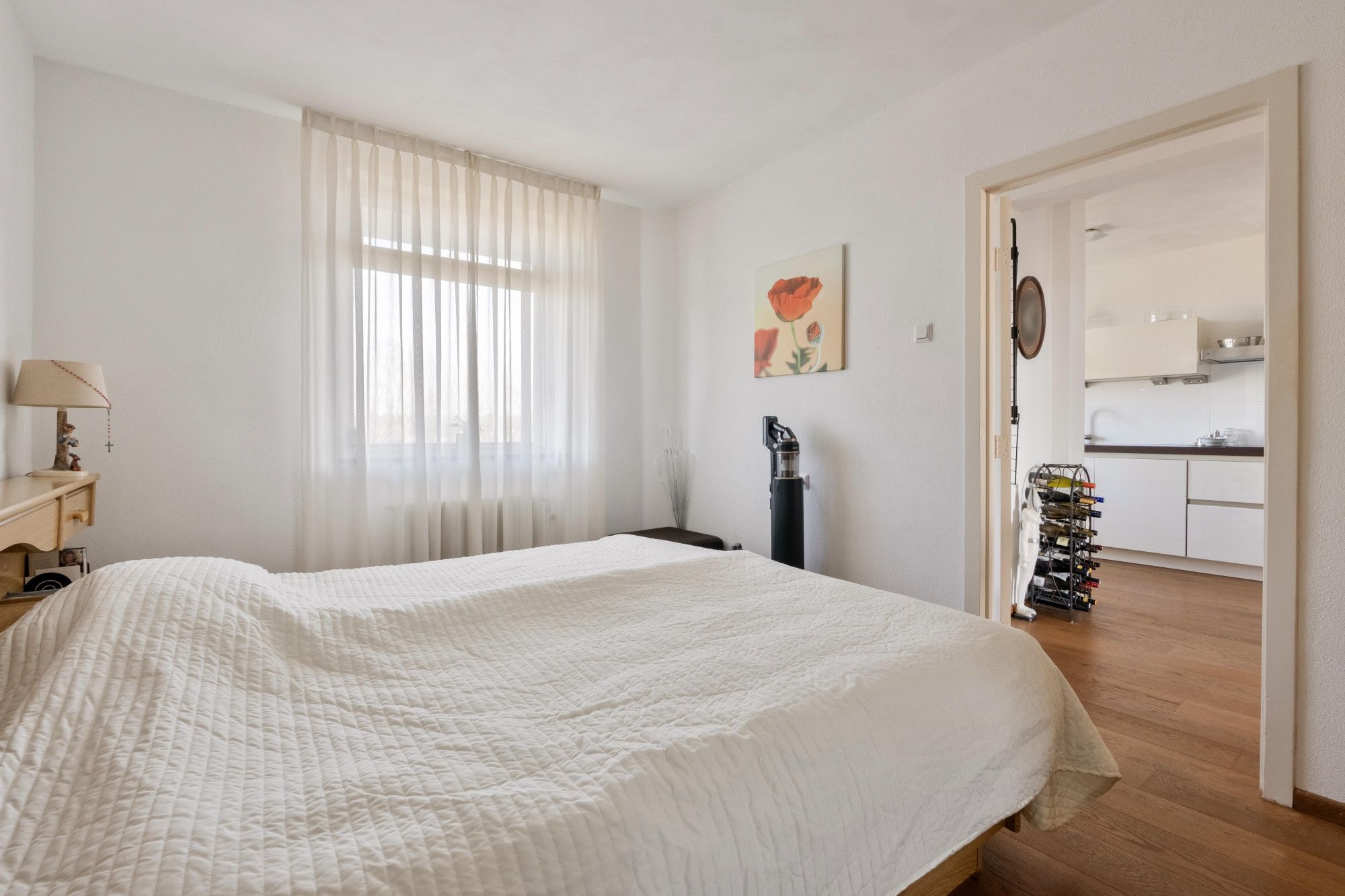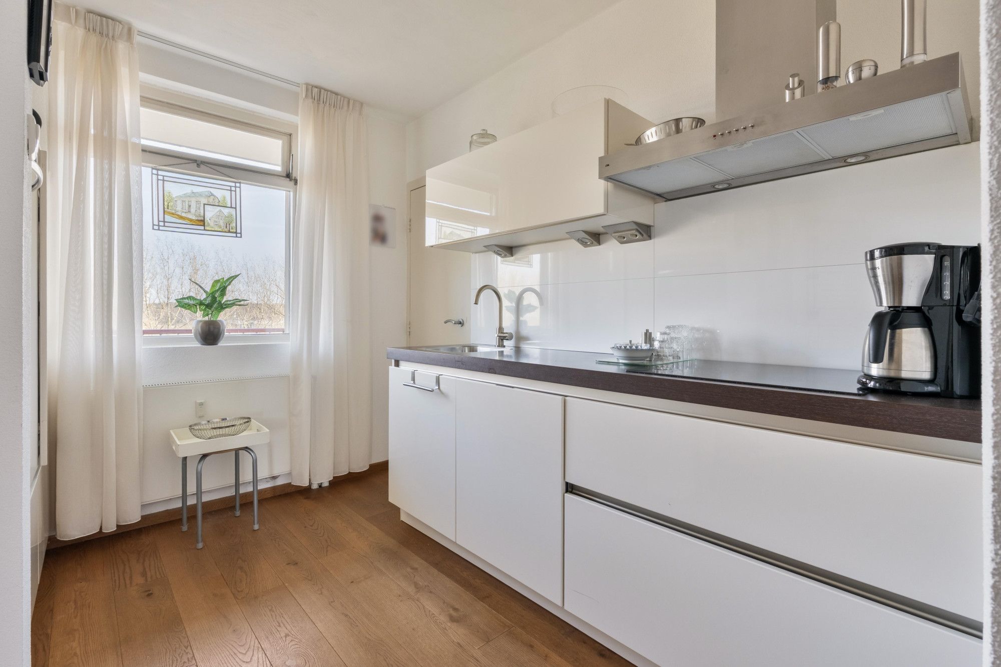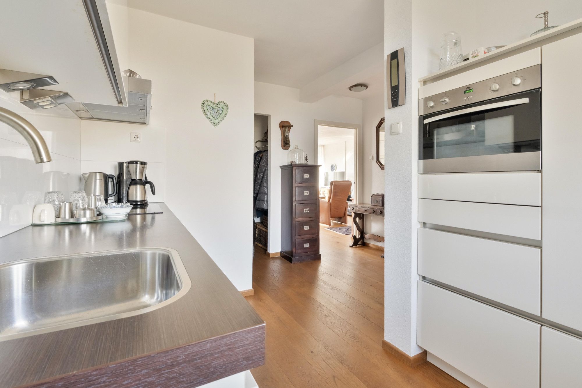Via de galerij bereikt u de entree van het appartement. De ruime hal biedt toegang tot alle vertrekken. De open keuken is voorzien van een keukenblok met diverse inbouwapparatuur, waaronder een 4-pits inductiekookplaat, combi-oven, afzuigkap en koelkast. Aansluitend bevindt zich de praktische bijkeuken met aansluiting voor witgoed.