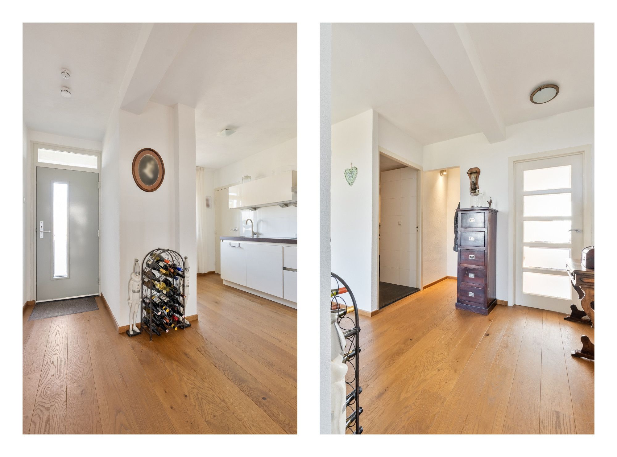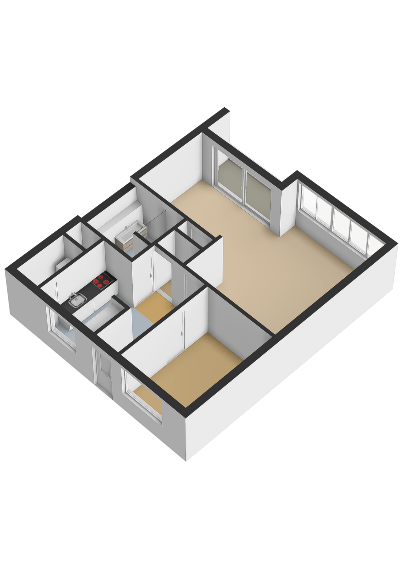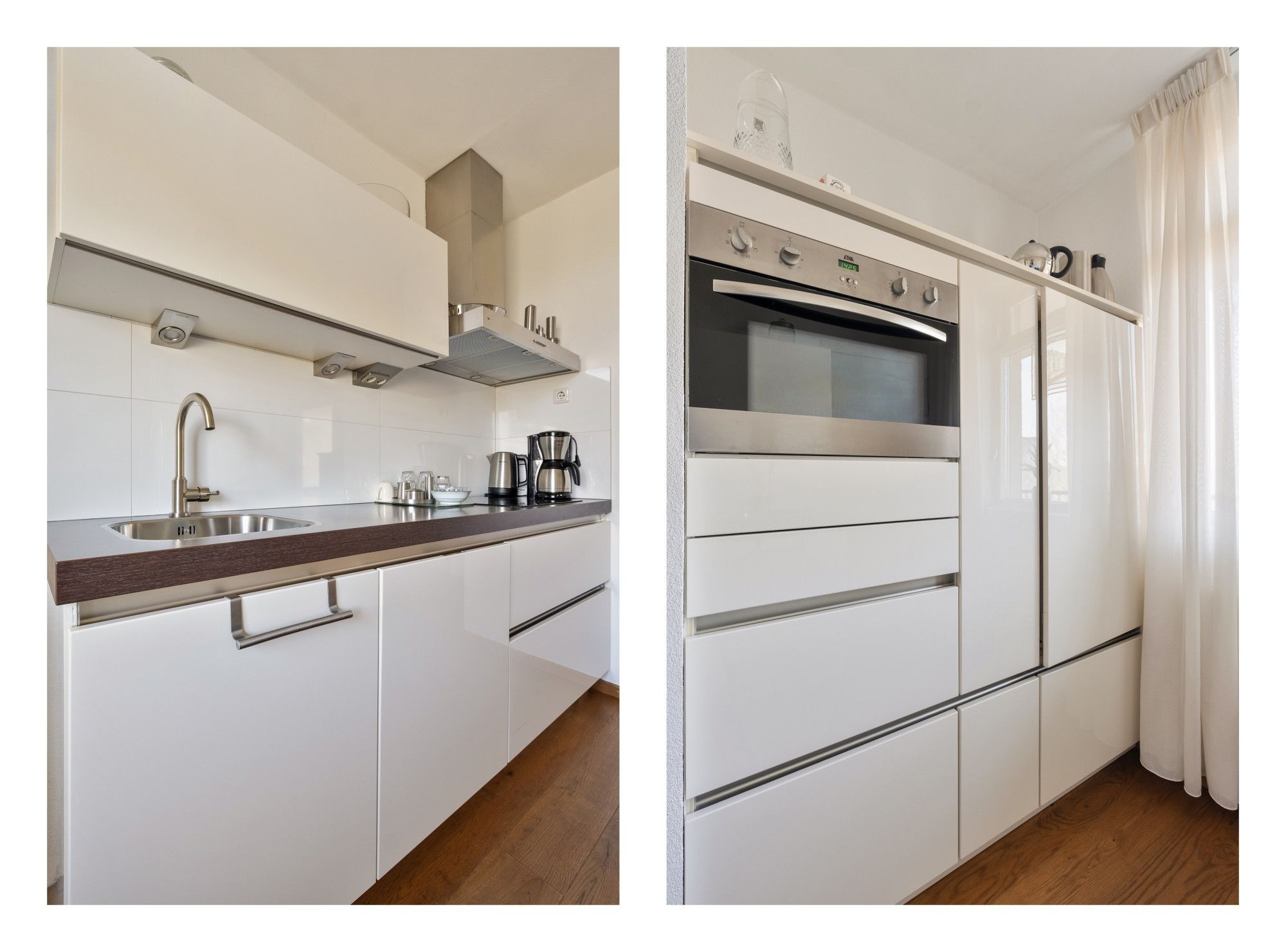 Via de galerij bereikt u de entree van het appartement. De ruime hal biedt toegang tot alle vertrekken. De open keuken is voorzien van een keukenblok met diverse inbouwapparatuur, waaronder een 4-pits inductiekookplaat, combi-oven, afzuigkap en koelkast. Aansluitend bevindt zich de praktische bijkeuken met aansluiting voor witgoed.