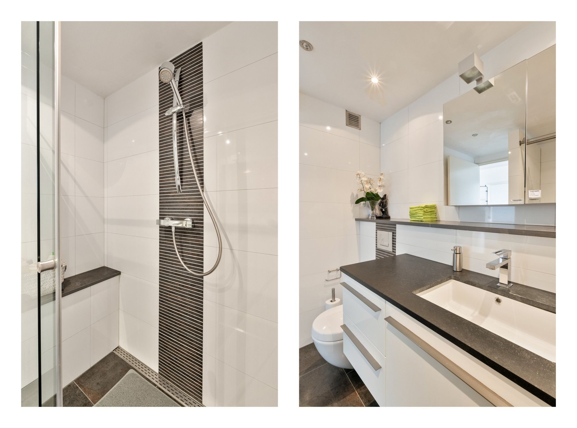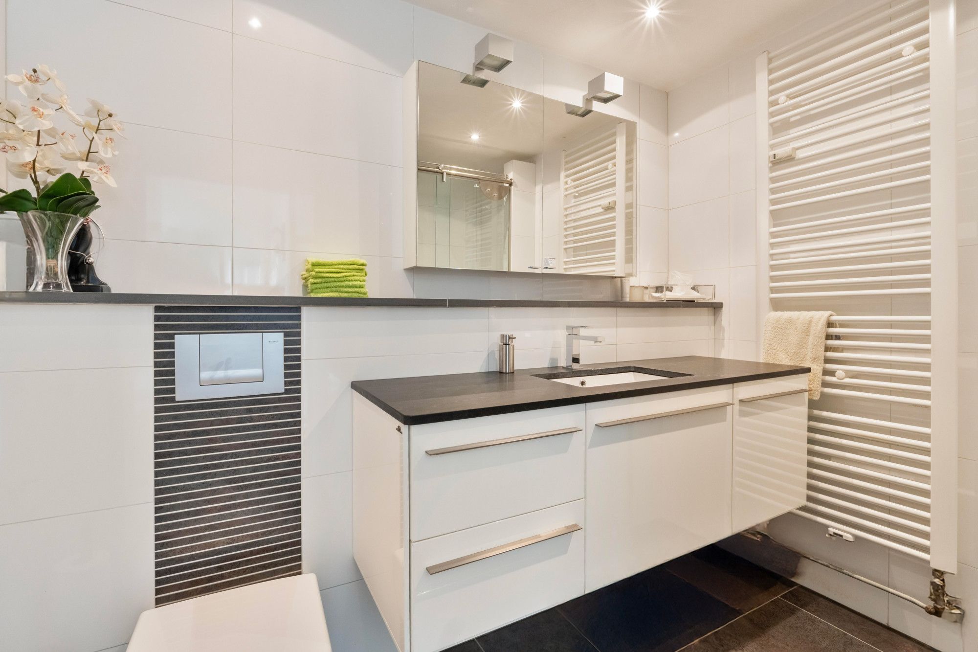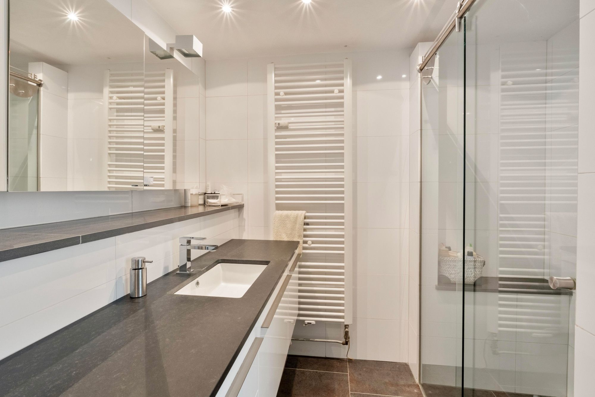 De nette badkamer beschikt over een inloopdouche, wastafel met meubel, designradiator en een zwevend closet. Aan de overkant van de hal bevindt zich de slaapkamer van circa 12,5 m².