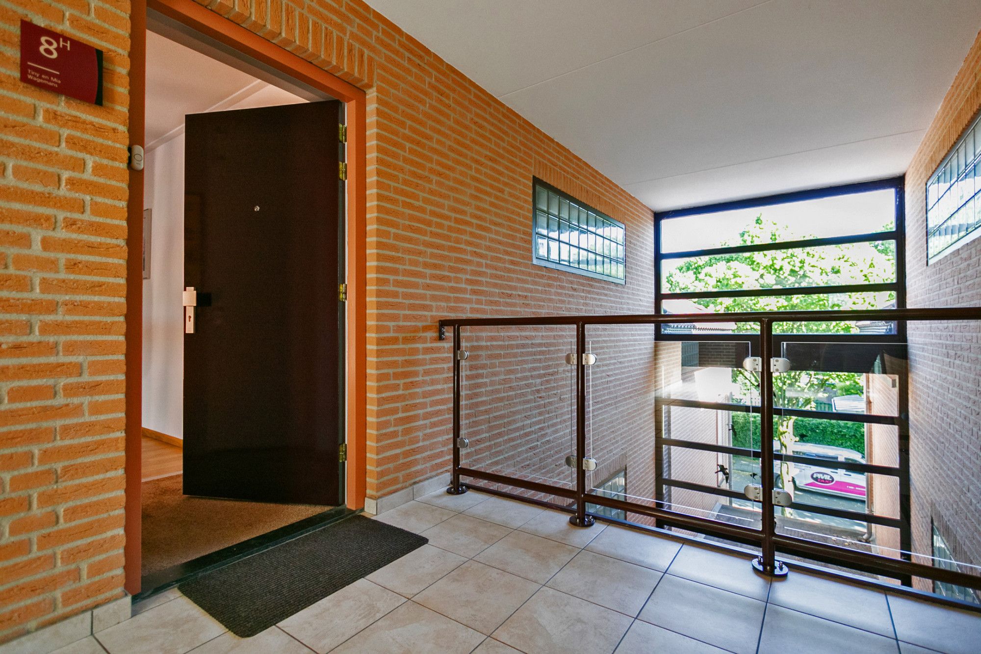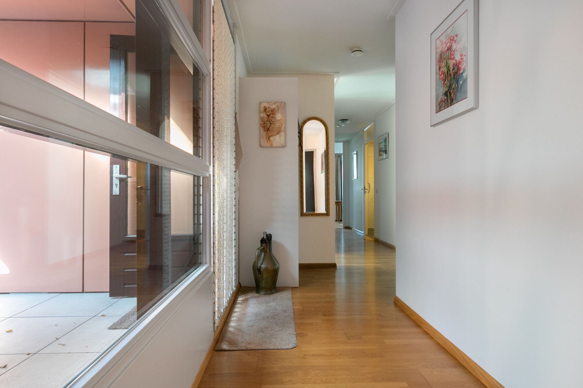 Entree via de gezamenlijke hal waar je de trap kunt nemen of de lift kunt kiezen naar de bovenste verdieping, waar het appartement zich bevindt. De lange hal is de centrale spil van het appartement. Het terras, de woonkamer, slaapkamers, badkamer, toilet, meterkast en grote bergruimte zijn vanuit de gang bereikbaar.