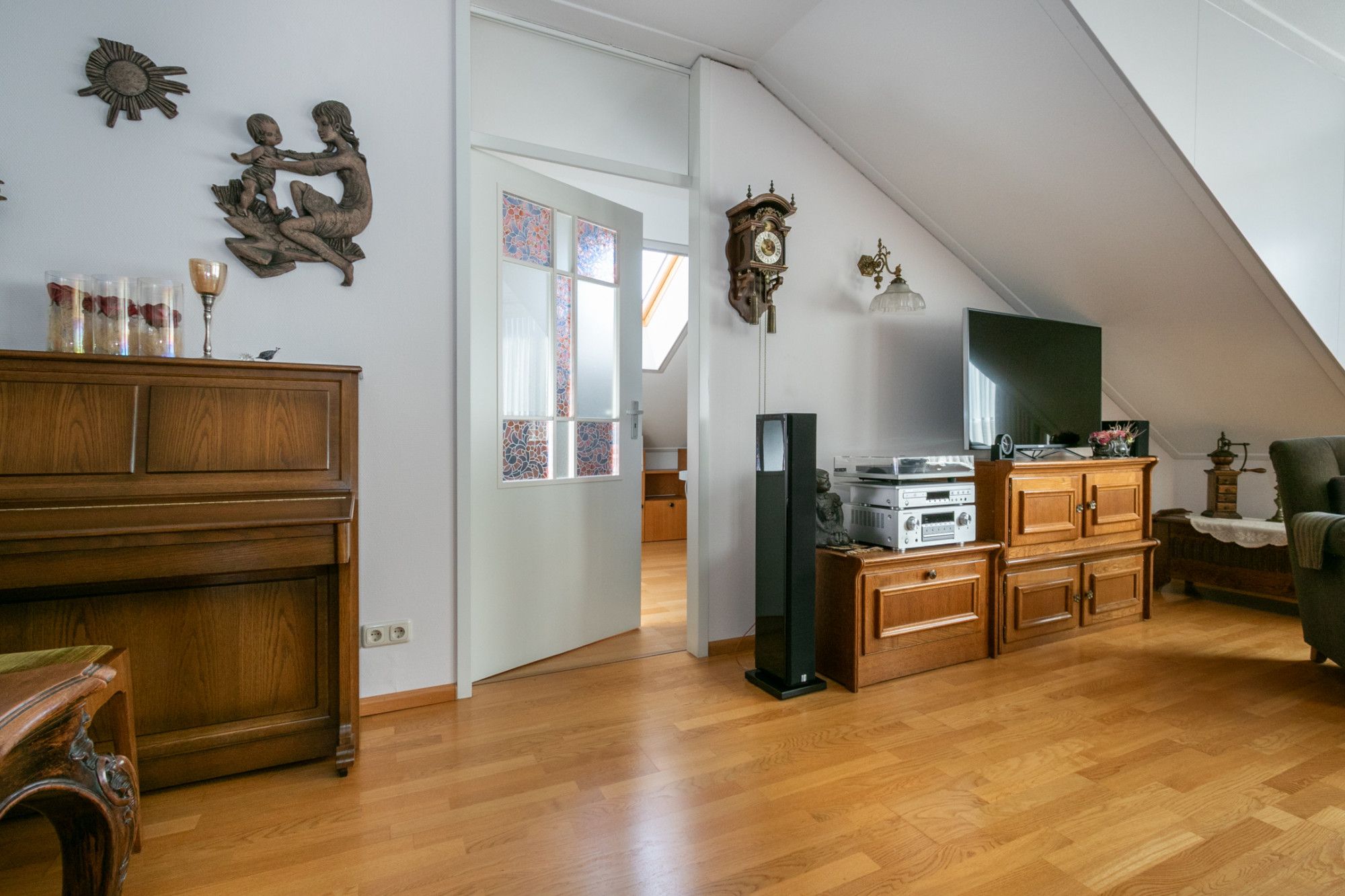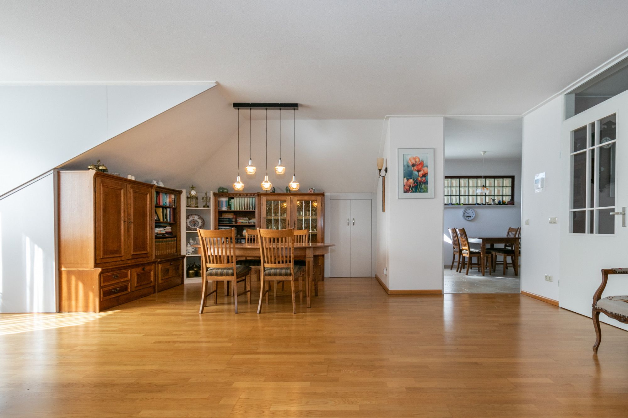 De ruime woonkamer heeft aan de voorzijde grote raampartijen die zorgen voor daglichttoetreding. Vanuit de woonkamer heb je toegang tot een extra kamer (thans in gebruik als hobbykamer) en de halfopen keuken.