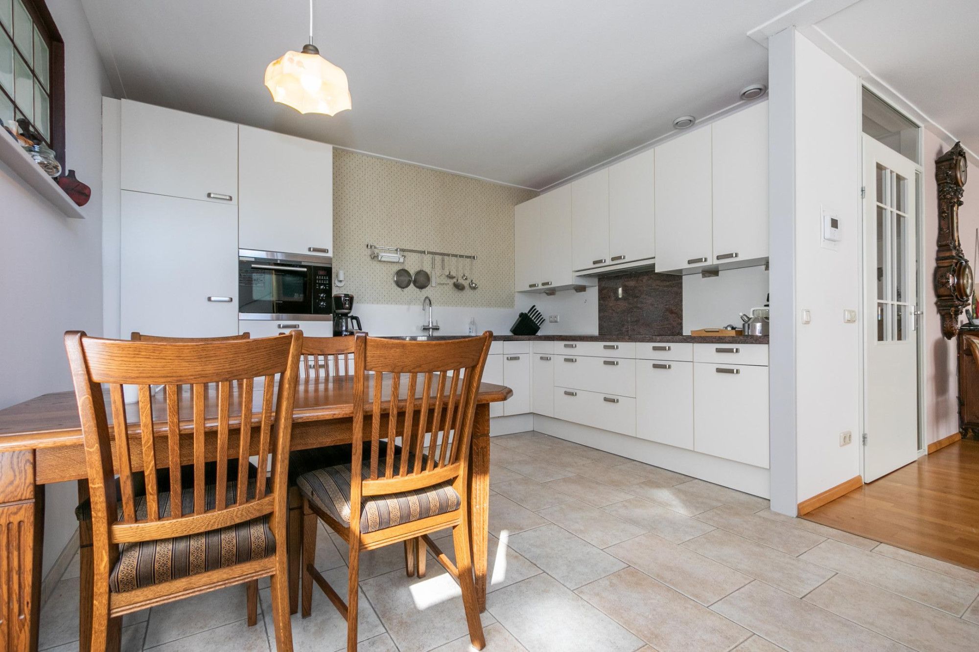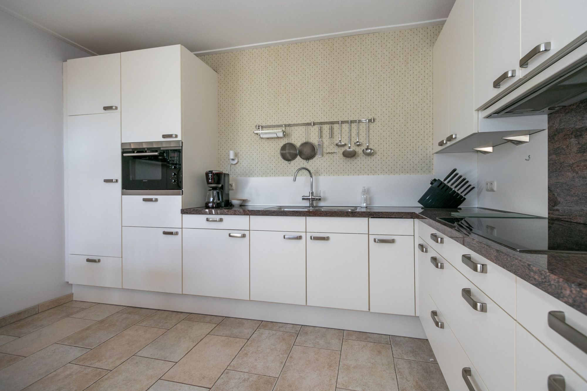 De keuken heeft een complete L-vormige opstand met een inductiekookplaat, afzuigkap en combi-oven.