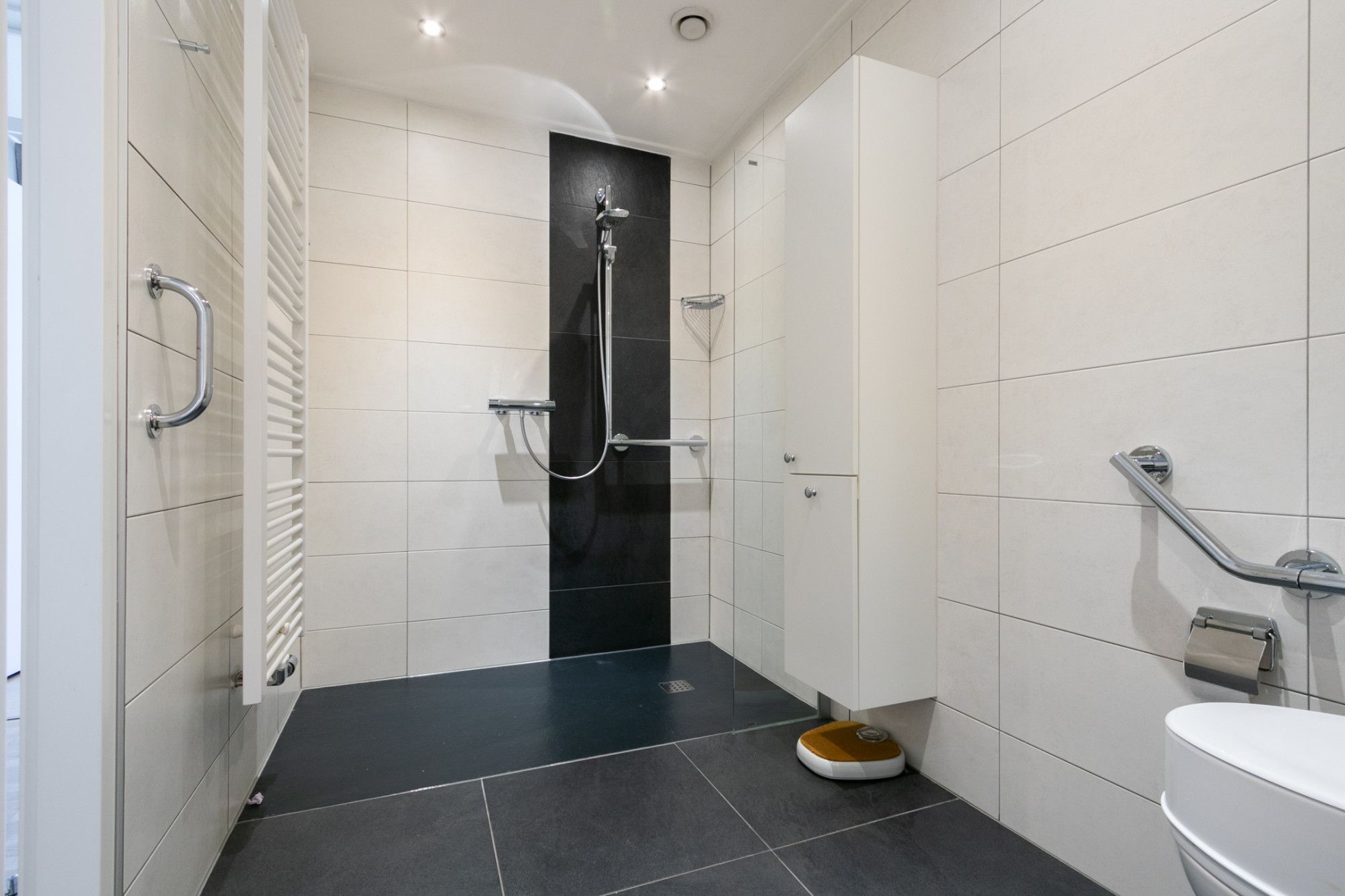 De moderne badkamer is voorzien van een toilet, wastafel en een ruime comfortabele inloopdouche. Een technische ruimte in het appartement doet tevens dienst als opbergruimte en is voorzien van een wasmachine-aansluiting.