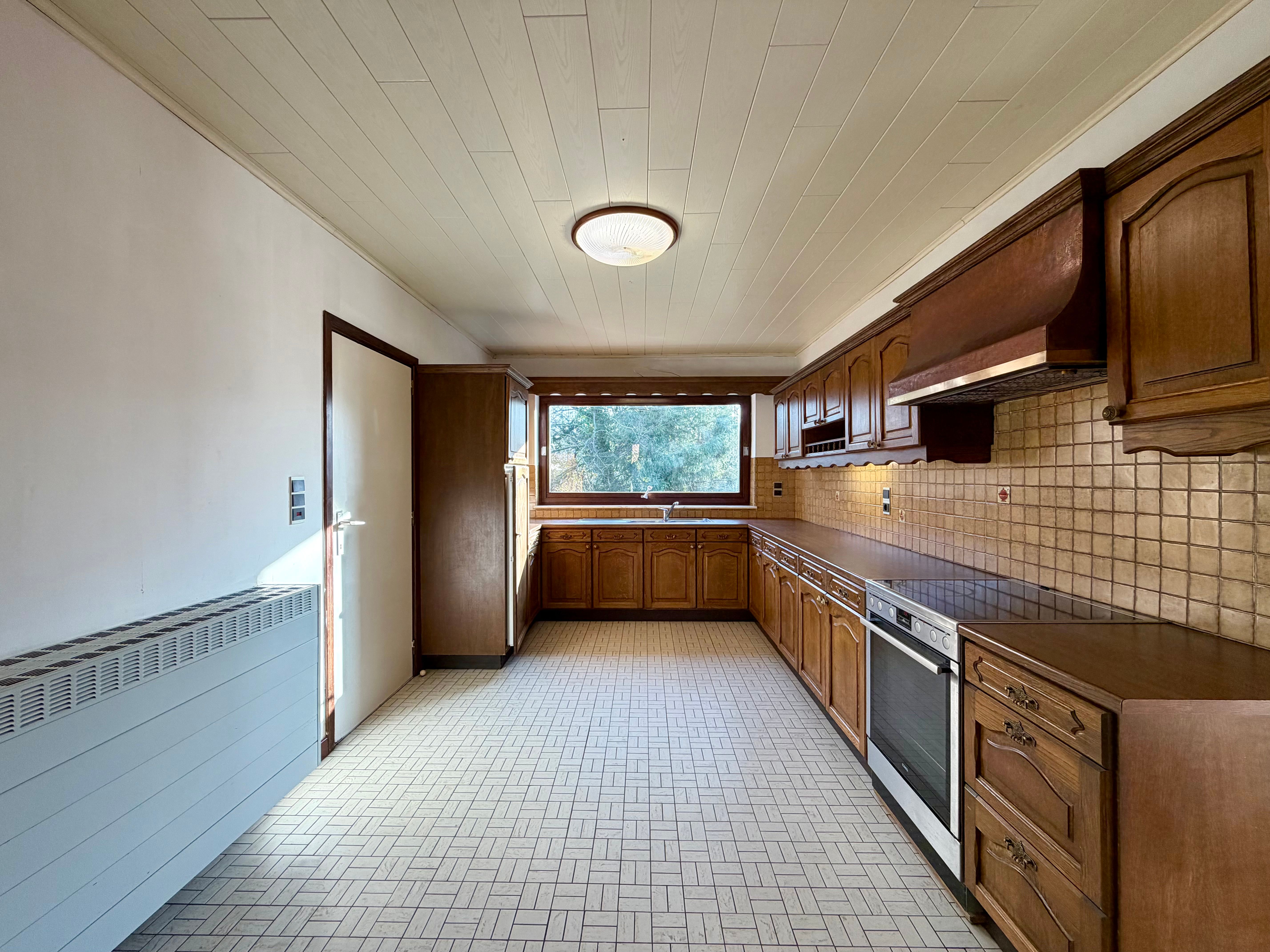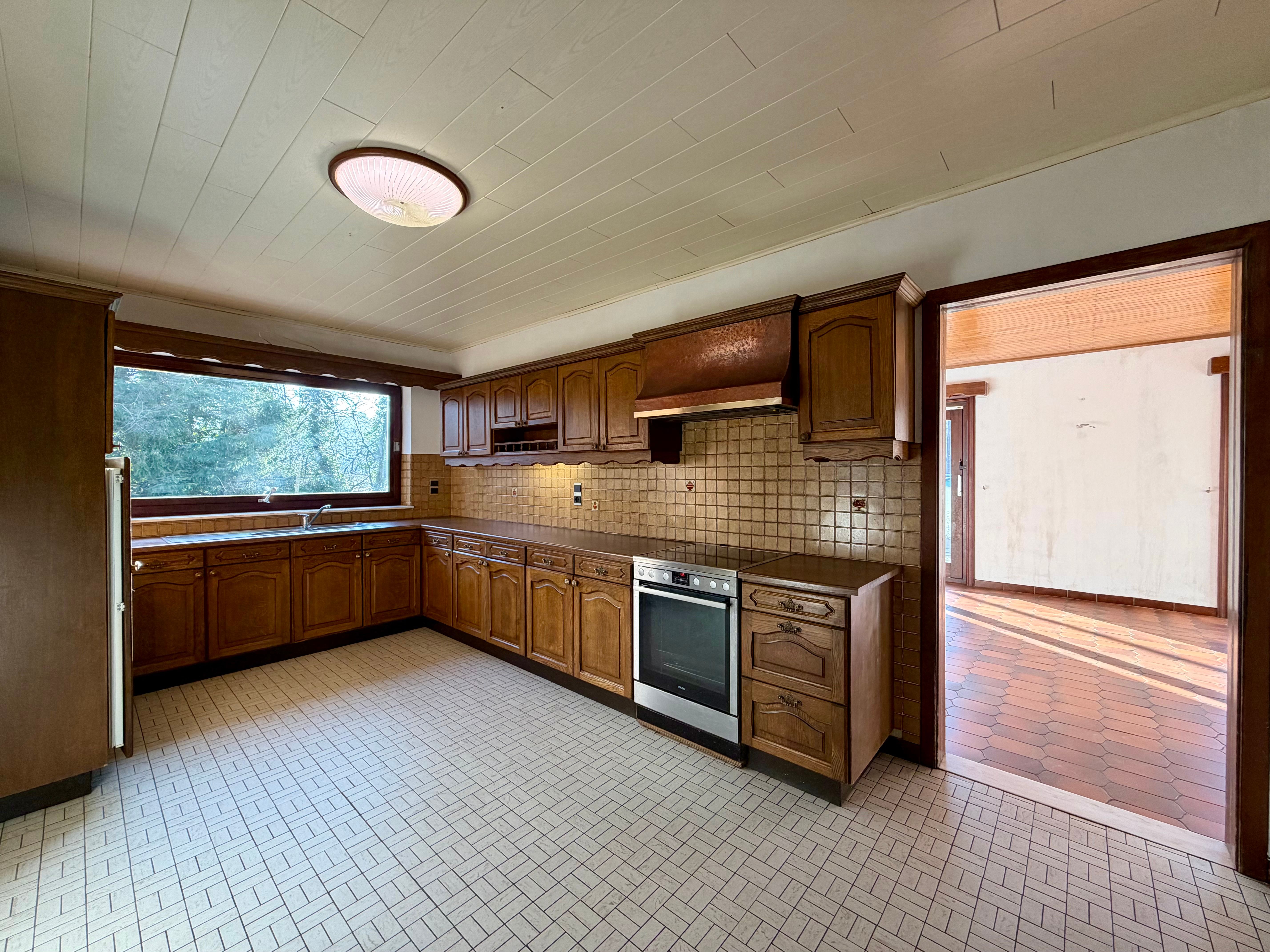 Aansluitend bevindt zich de keuken, uitgerust met kookplaat, oven en dampkap. Een praktische basis die bovendien mogelijkheden biedt om verder te moderniseren en volledig naar eigen smaak in te richten.