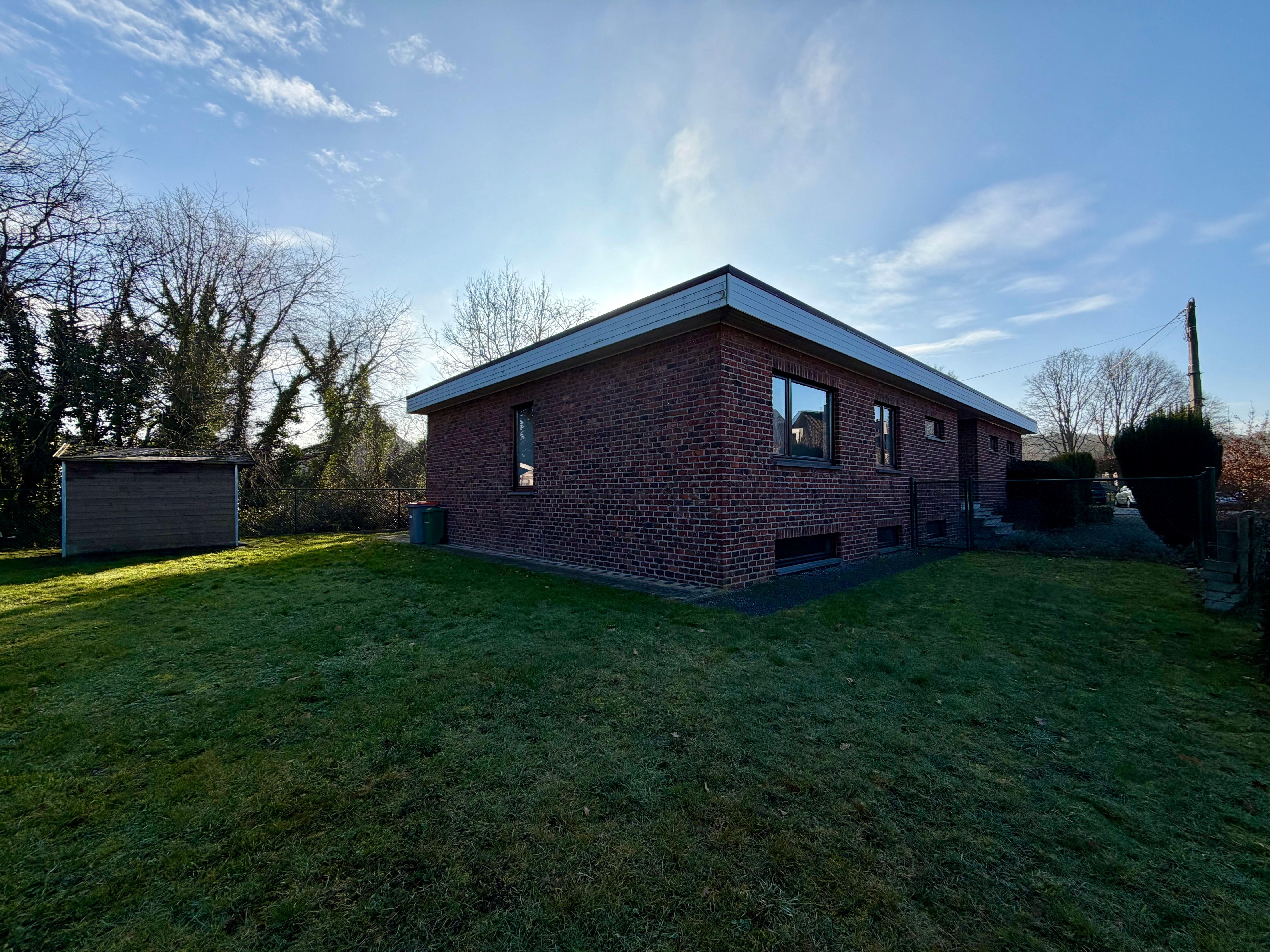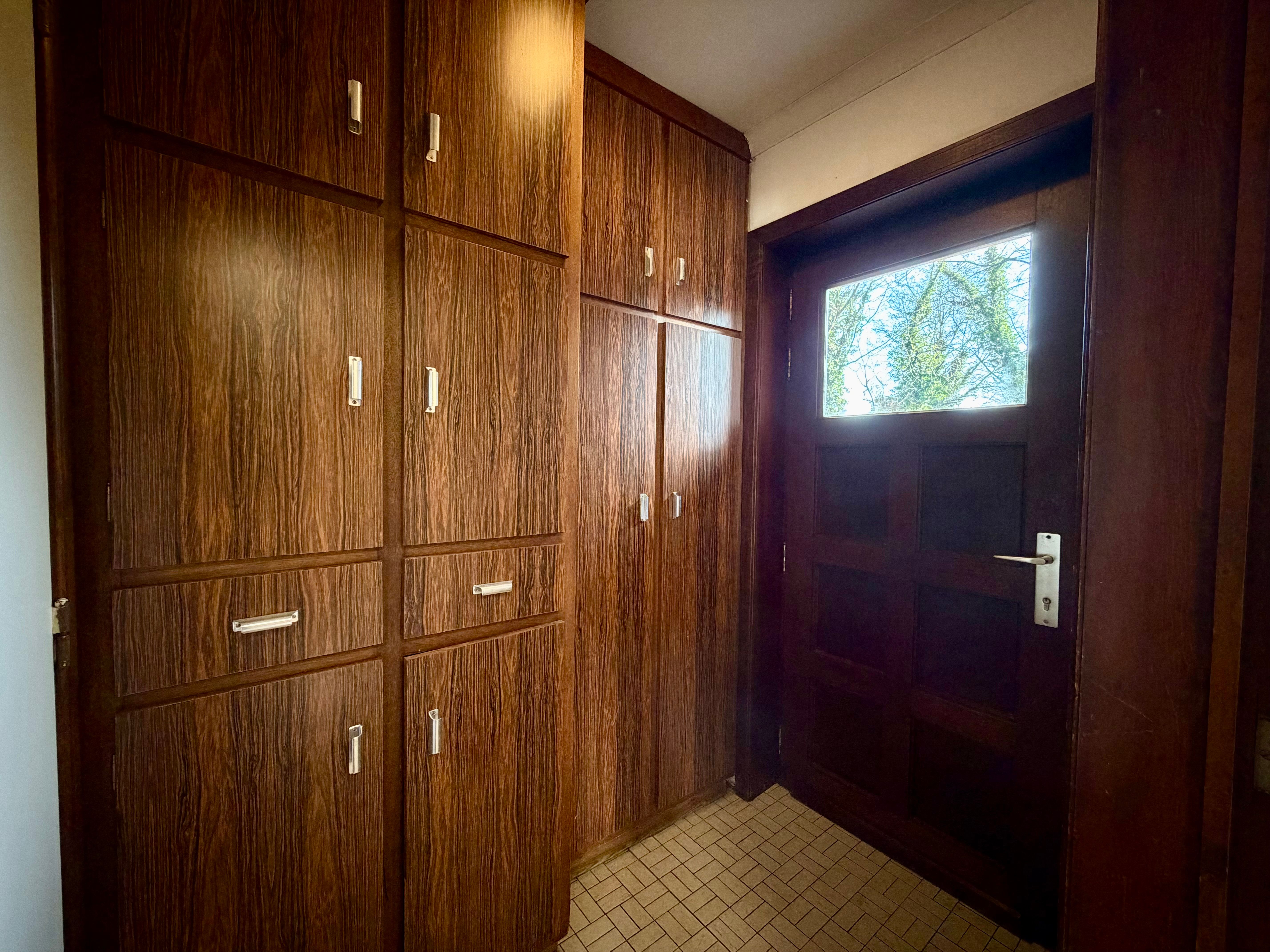 Achter de keuken ligt een handige achterinkom met ingebouwde kasten, ideaal als vestiaire of extra bergruimte. Van hieruit heb je rechtstreeks toegang tot de tuin, een fijne plek om in alle rust te genieten van het buitenleven. Het tuinhuisje biedt bijkomende opbergmogelijkheden voor tuinmateriaal of fietsen.