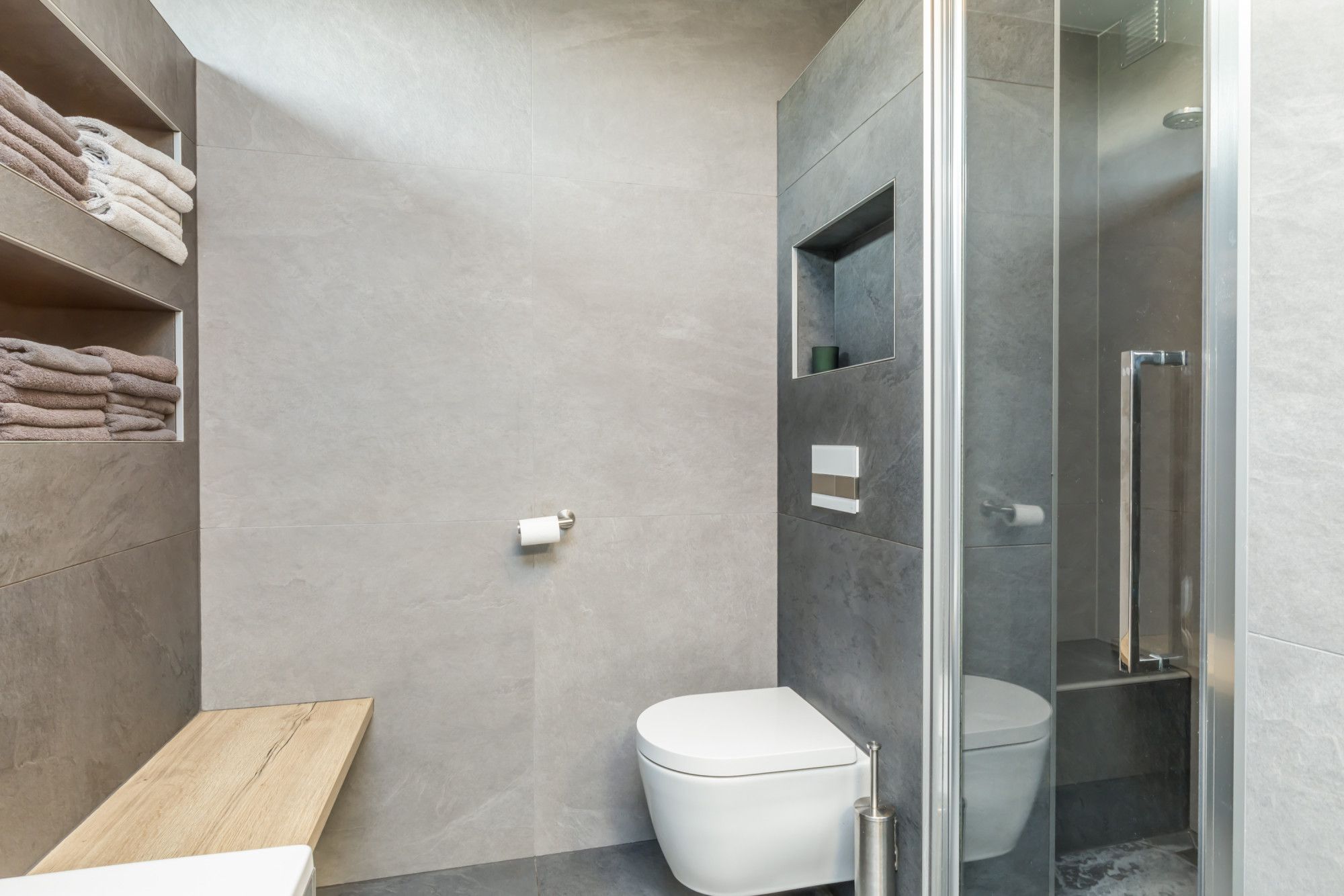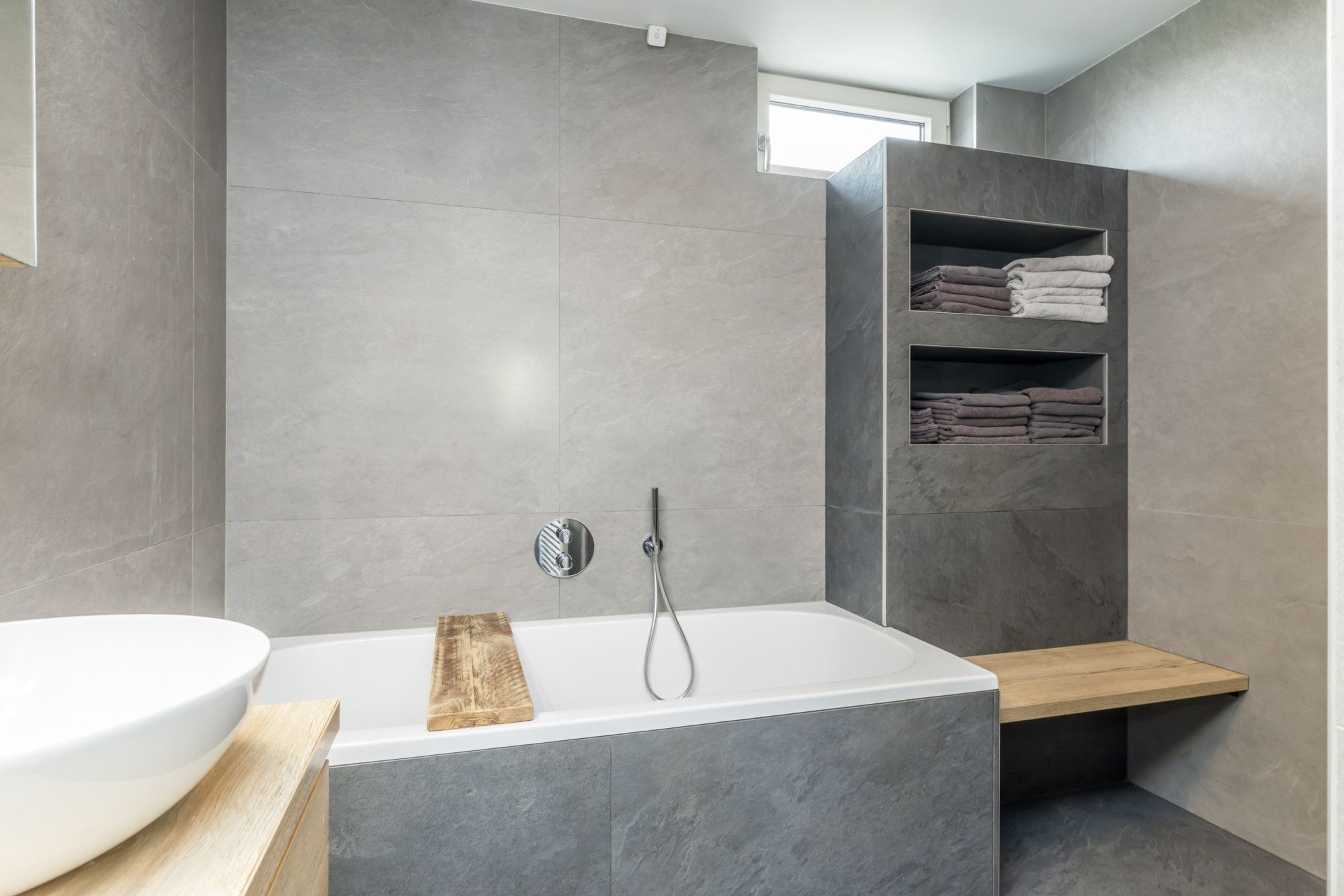 * MODERNE BADKAMER MET DUBBELE WASKOMMEN OP EEN MEUBEL / INLOOPDOUCHE / LIGBAD EN 2E TOILET