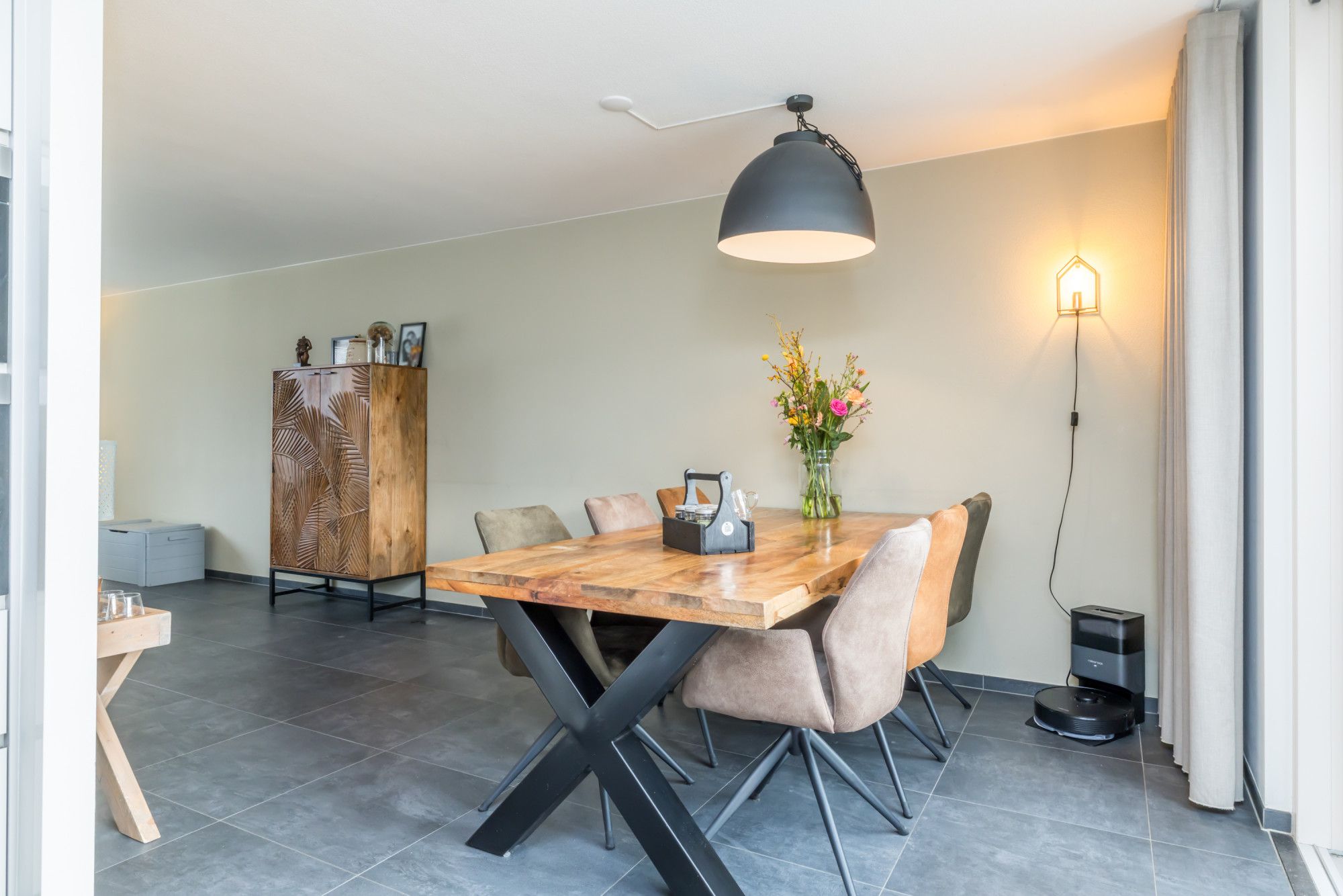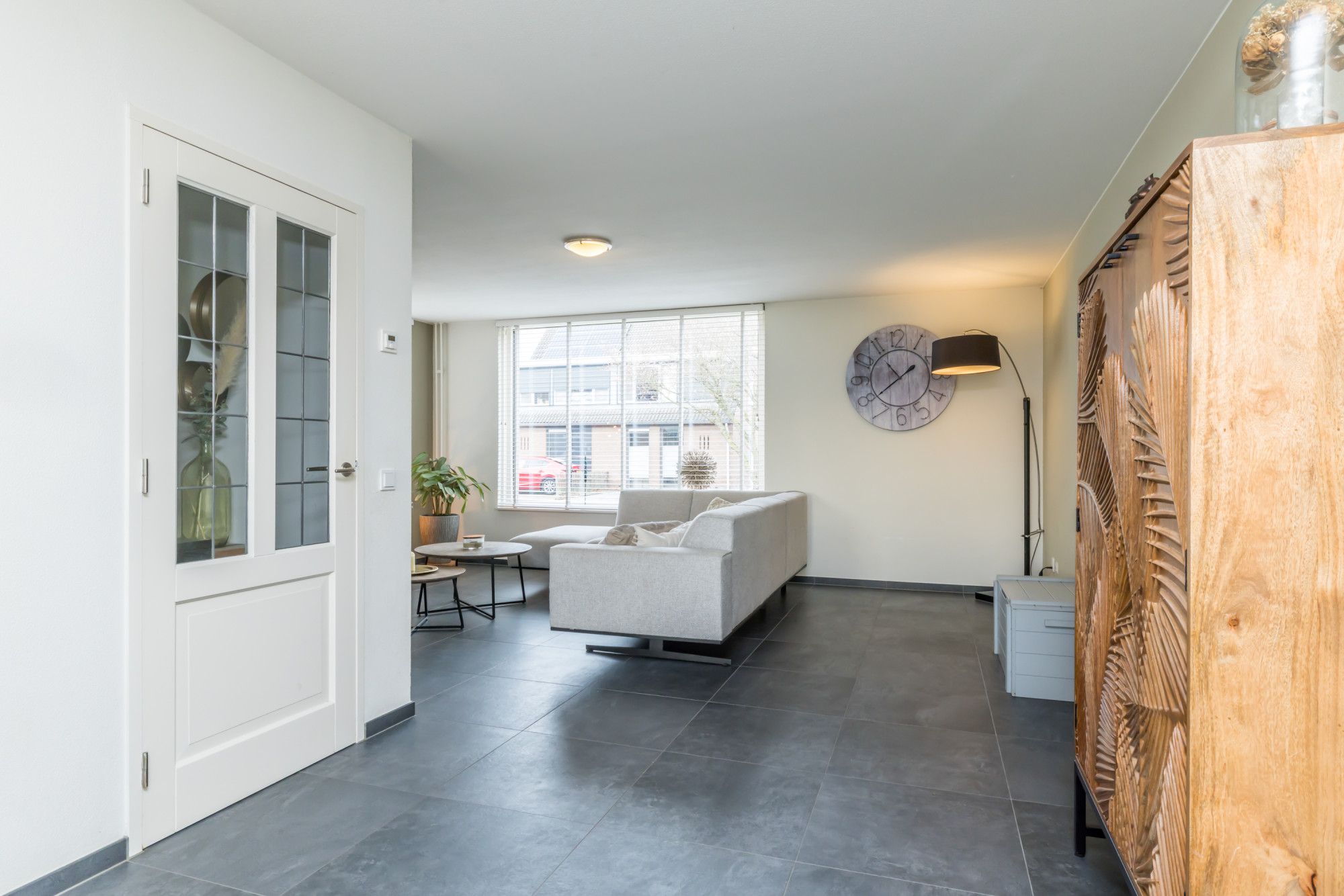 Bij binnenkomst valt direct de strakke, lichte afwerking op. De woonkamer is aan de voorzijde gesitueerd en ingericht als comfortabele living/lounge, voorzien van multimediale aansluitingen. Aansluitend bevindt zich de eetkamer aan de achterzijde, waar een grote schuifpui zorgt voor veel lichtinval en een directe verbinding met het overdekte terras. Vanuit hier is er tevens doorgang naar de keuken.