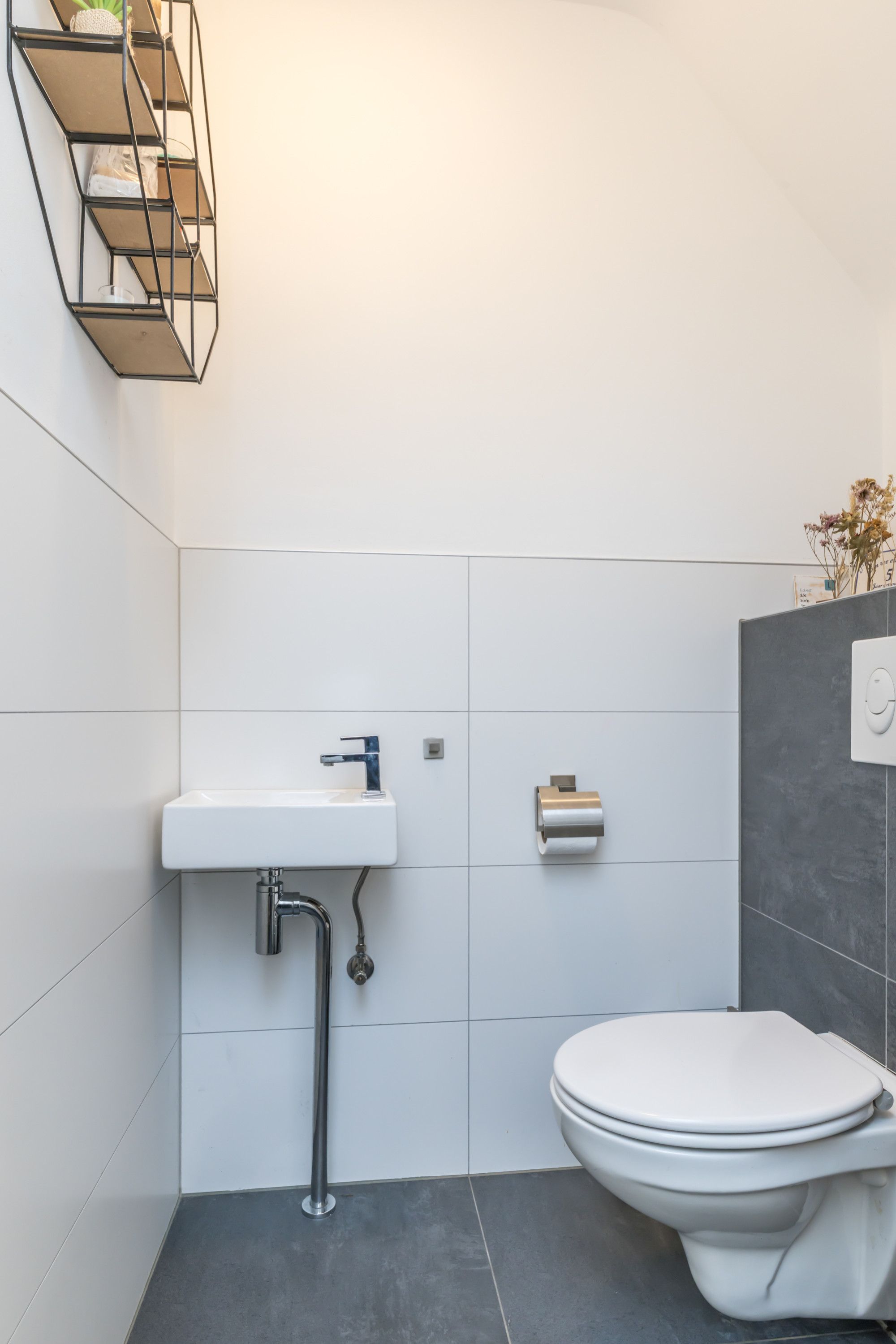 Hal / entree, meterkast met groepsinstallatie / aardlekschakelaars / digitale meters met dag-/nachtstroom / glasvezel-aansluiting en omvormer voor de zonnepanelen. Half betegeld gastentoilet met zwevend wandcloset en fonteintje. Toegang tot de woonkamer.