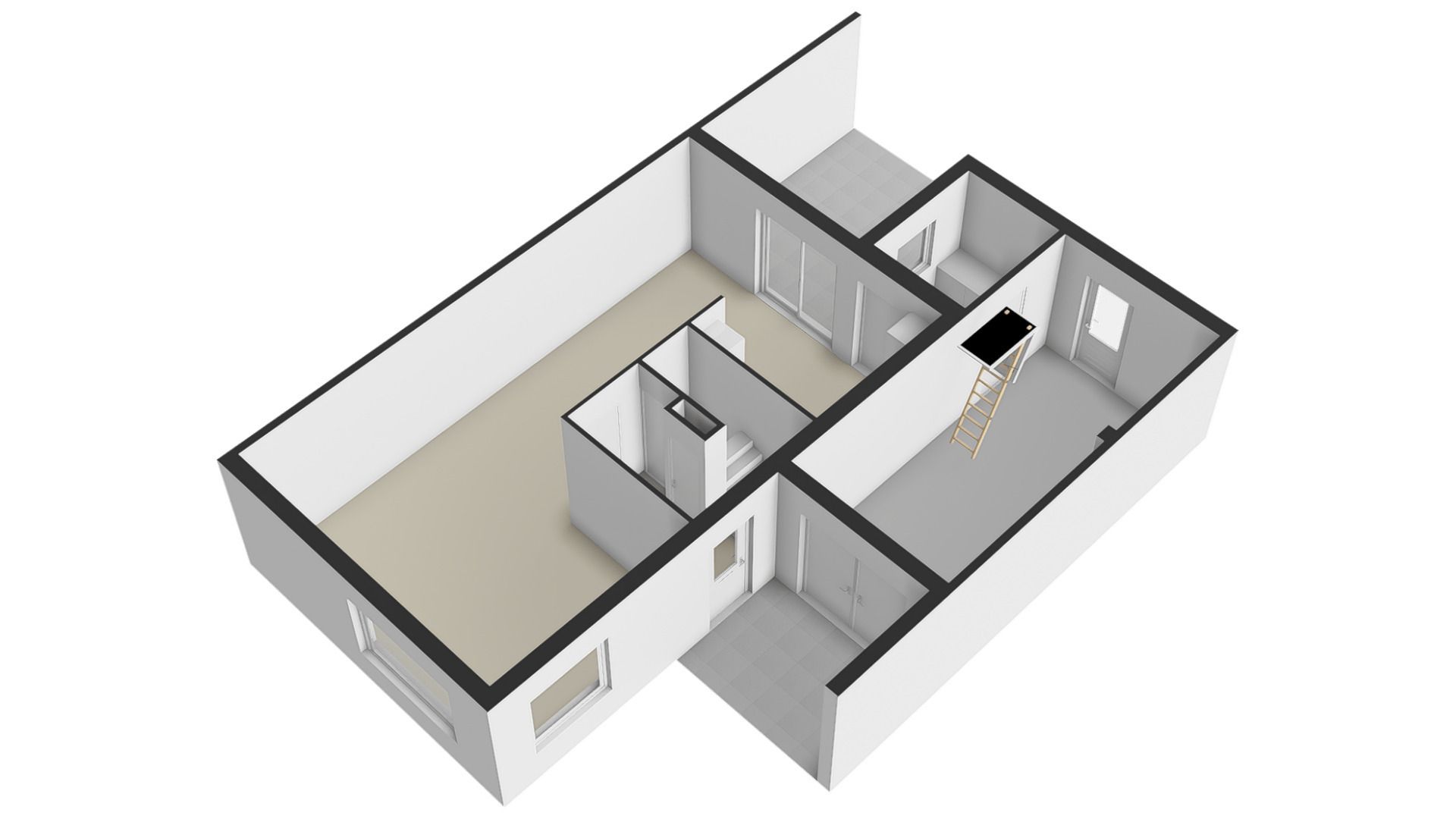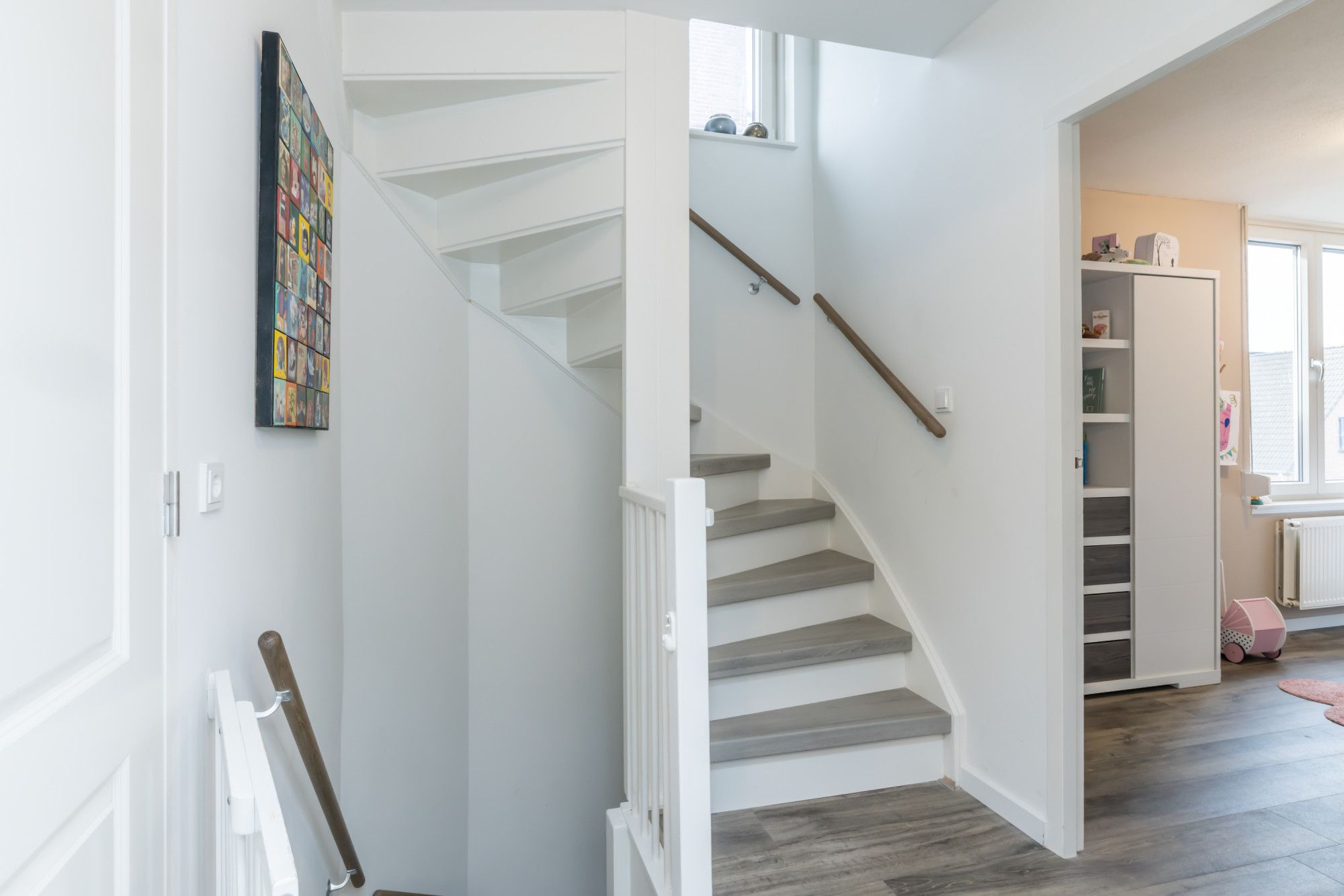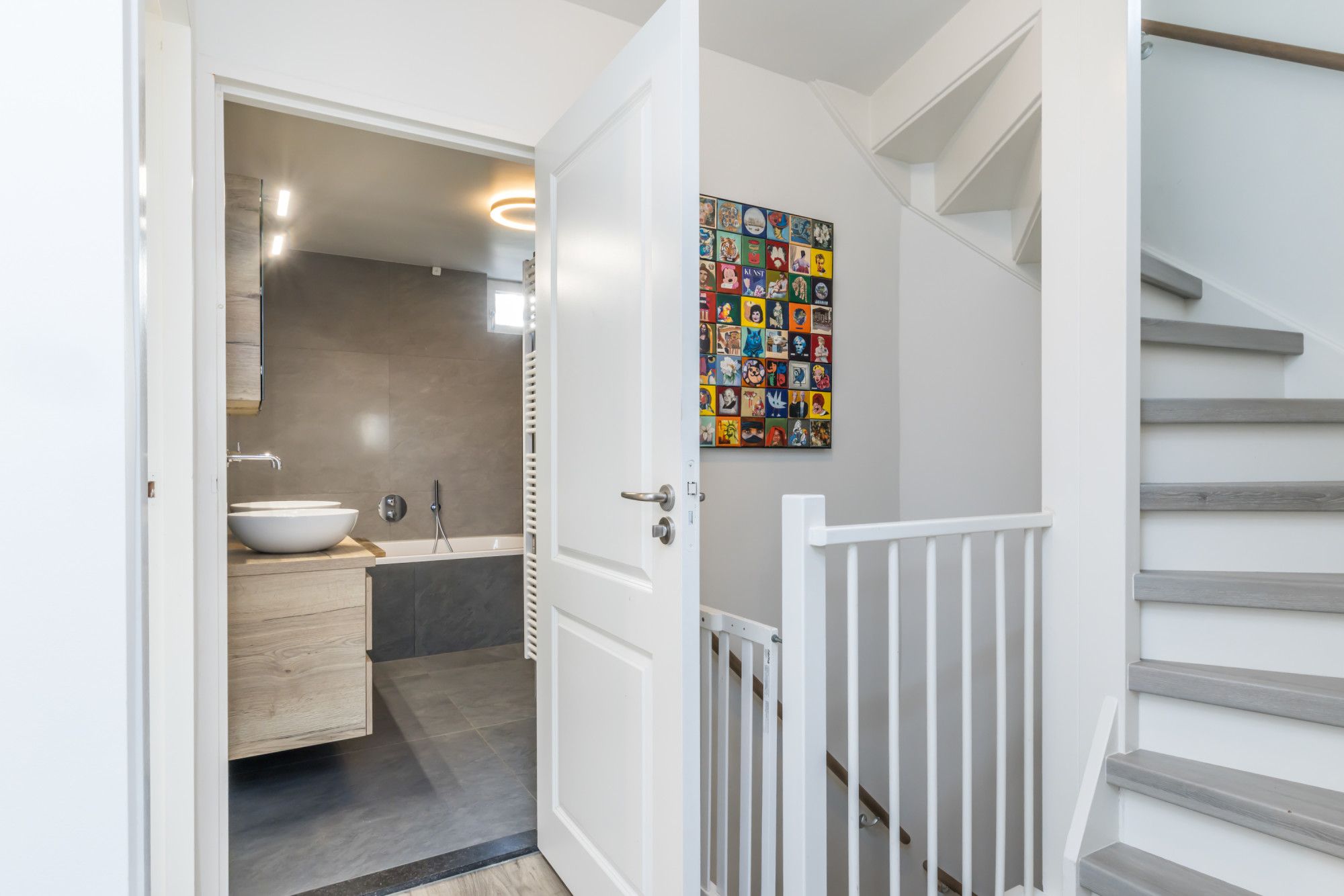 Overloop met toegang tot 2 slaapkamers en de tweede badkamer, bereikbaar middels een vaste trap.