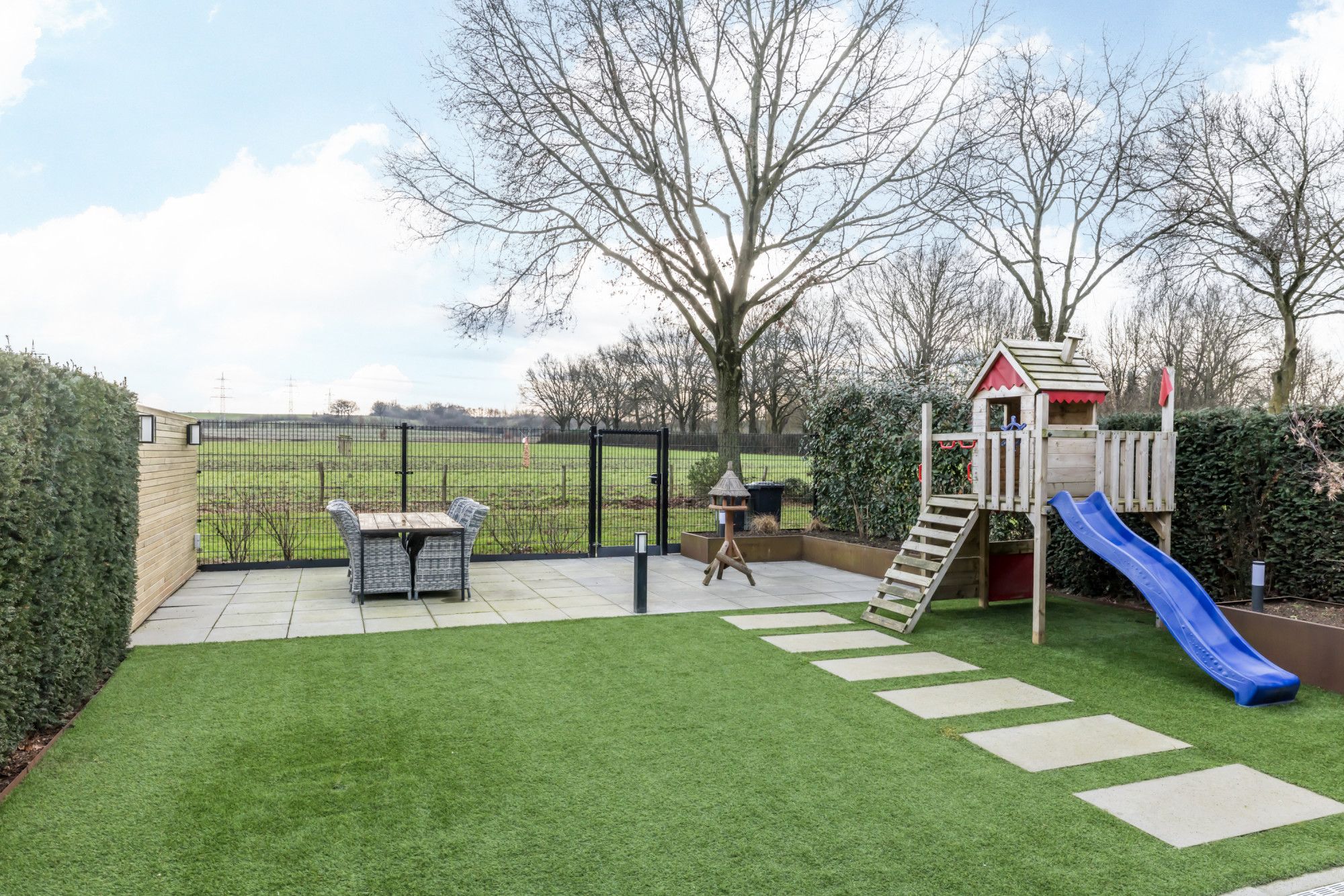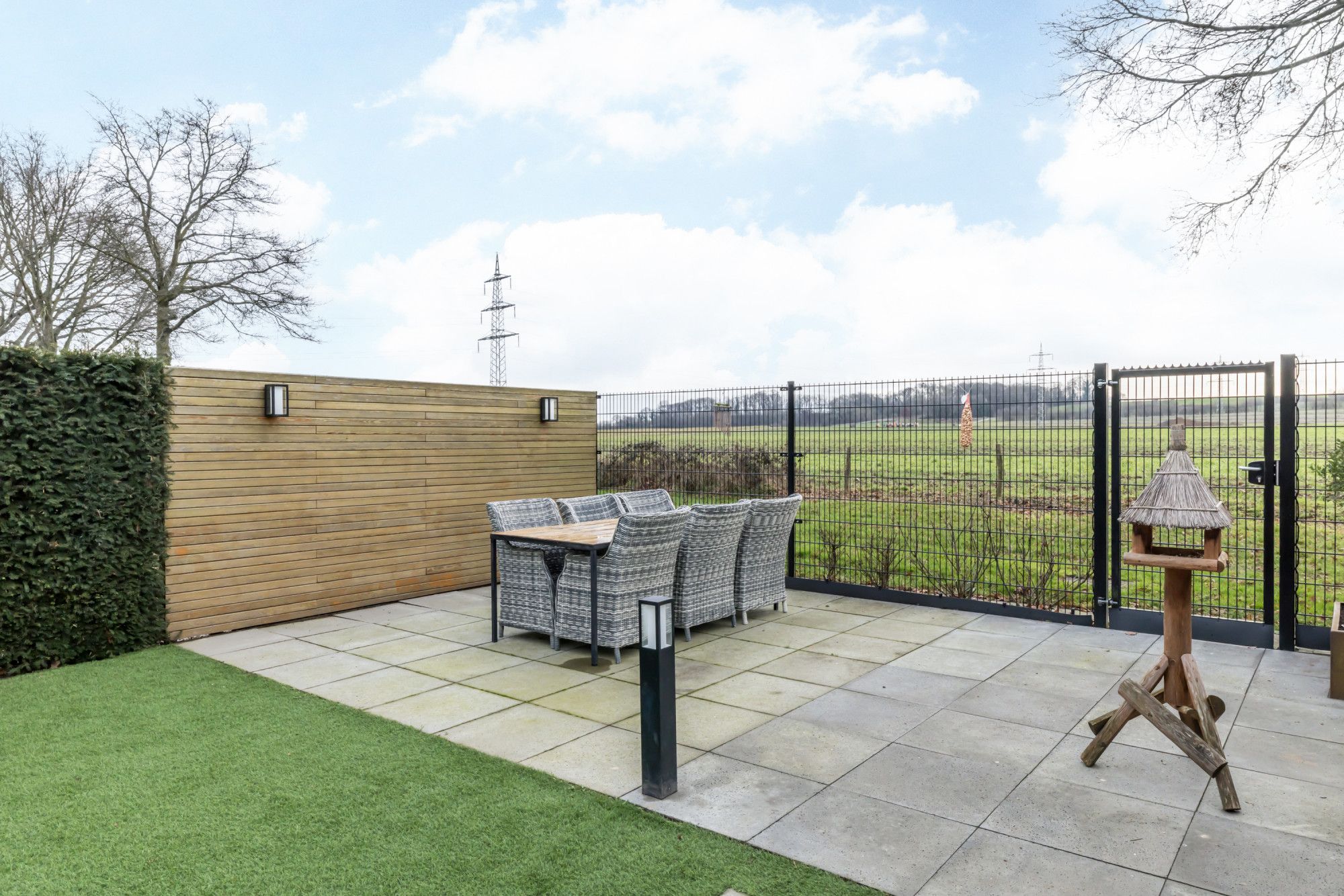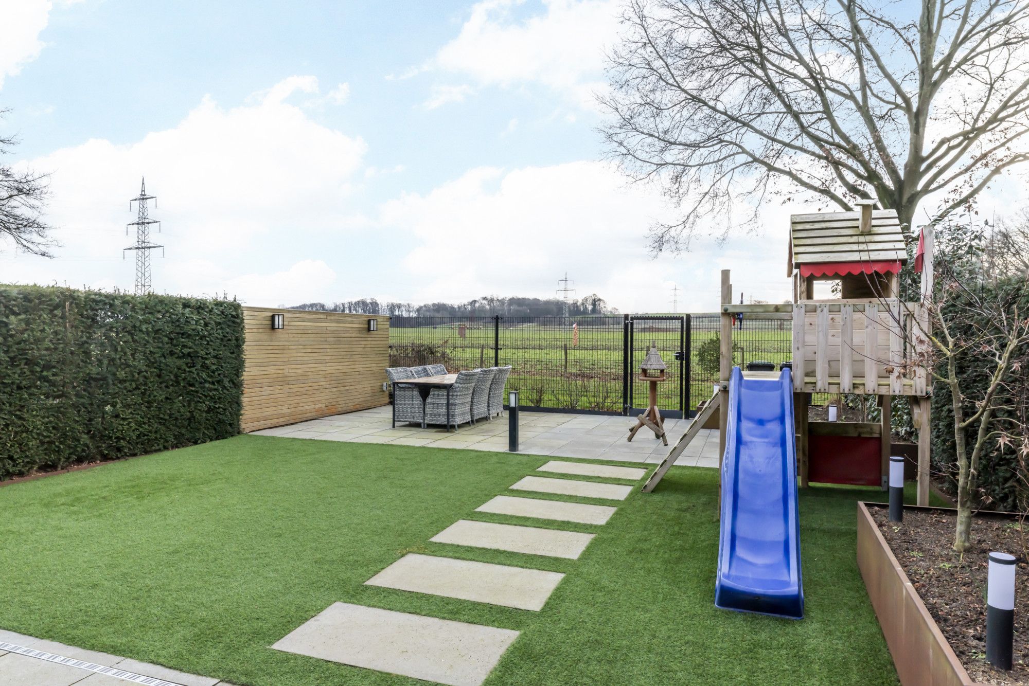 Geheel omsloten, onderhoudsvriendelijke, achtertuin met royaal overdekt terras, kunstgras, met Cortenstaal afgewerkte borders voorzien van aanplanting en tweede terras met vrij uitzicht over de velden.