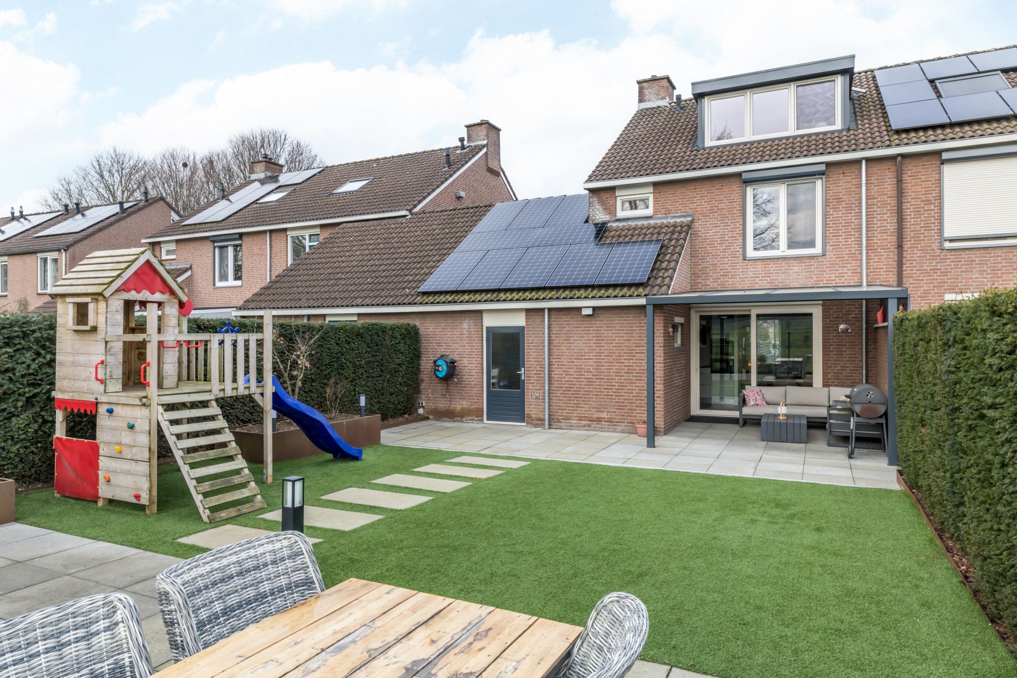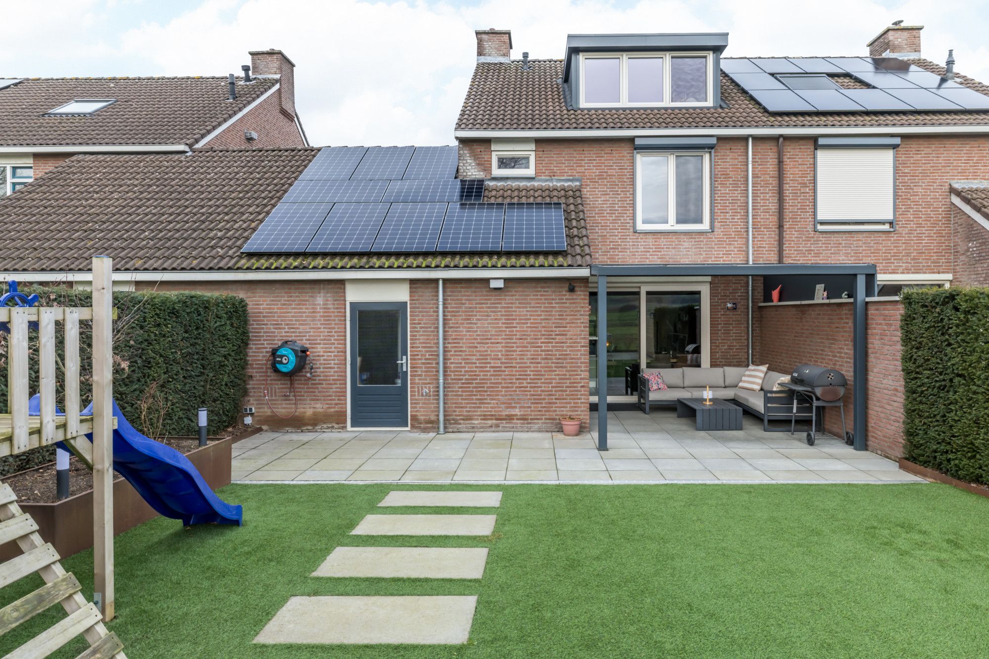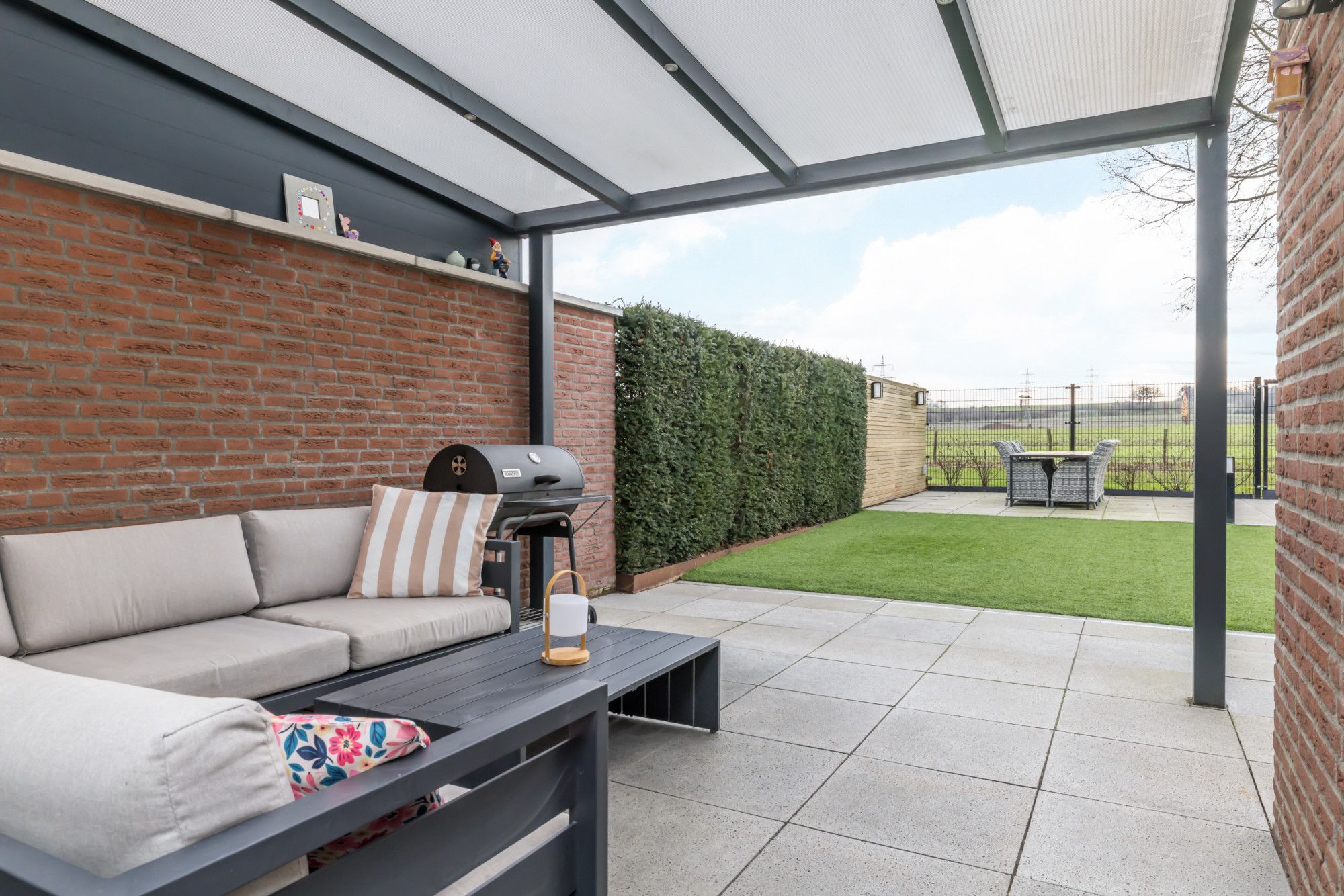 De fraai aangelegde, geheel omsloten achtertuin is een absolute plus: een overdekt terras direct aan de woning, onderhoudsvriendelijk kunstgras en strak vormgegeven borders afgewerkt met Cortenstaal. Achterin de tuin bevindt zich een tweede terras met zithoek en een vrij en weids uitzicht over de aangrenzende velden — rust en privacy gegarandeerd.