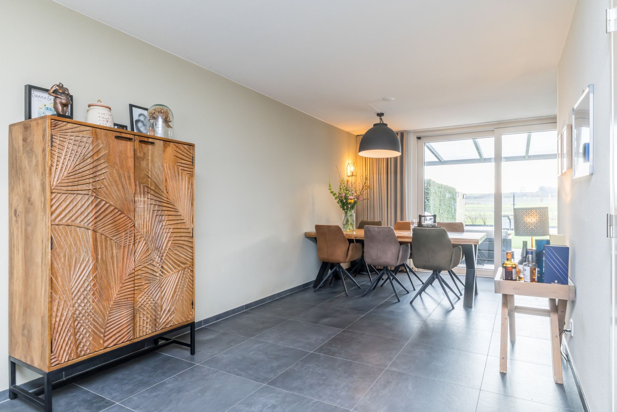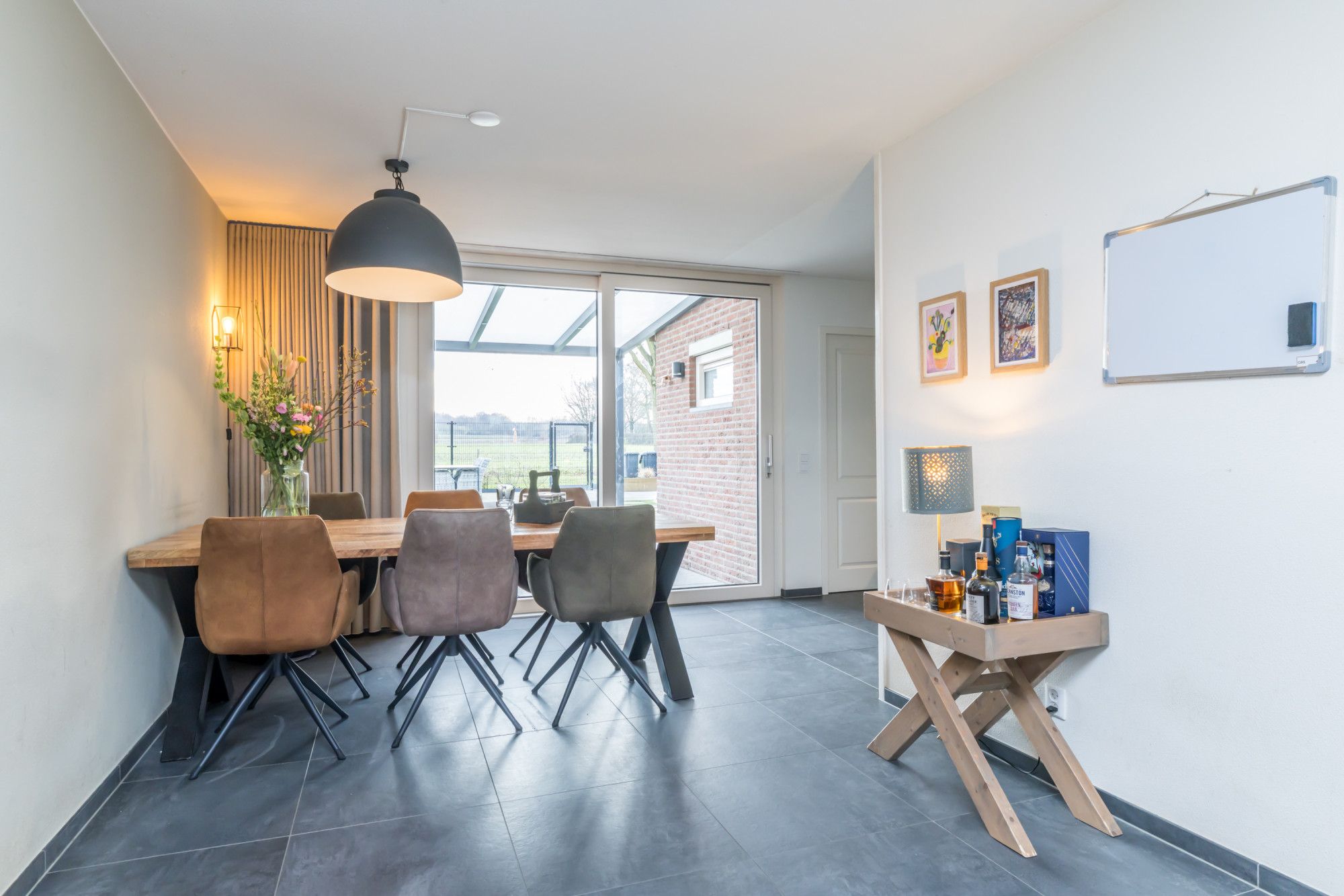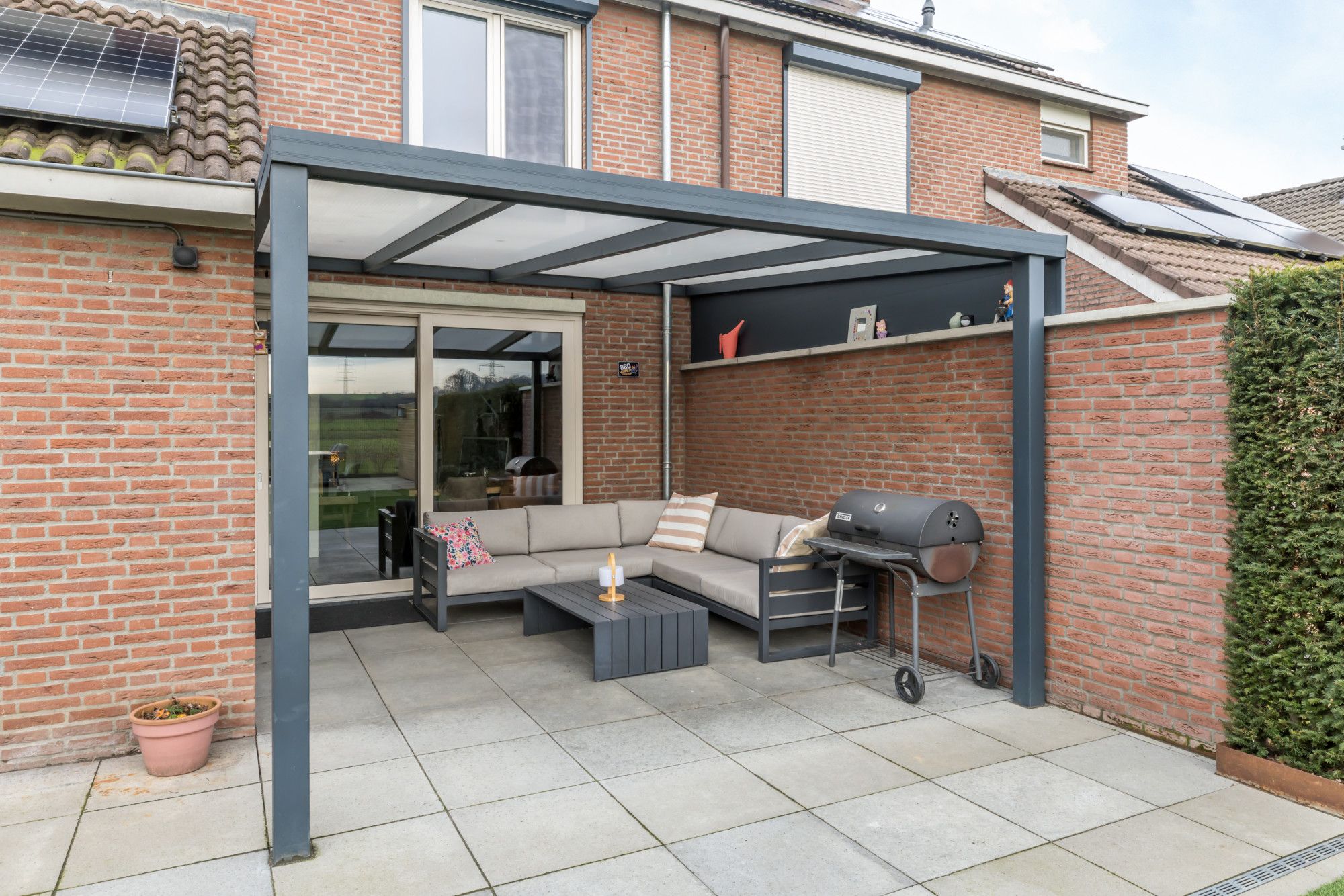 De fraai aangelegde, geheel omsloten achtertuin is een absolute plus: een overdekt terras direct aan de woning, onderhoudsvriendelijk kunstgras en strak vormgegeven borders afgewerkt met Cortenstaal. Achterin de tuin bevindt zich een tweede terras met zithoek en een vrij en weids uitzicht over de aangrenzende velden — rust en privacy gegarandeerd.