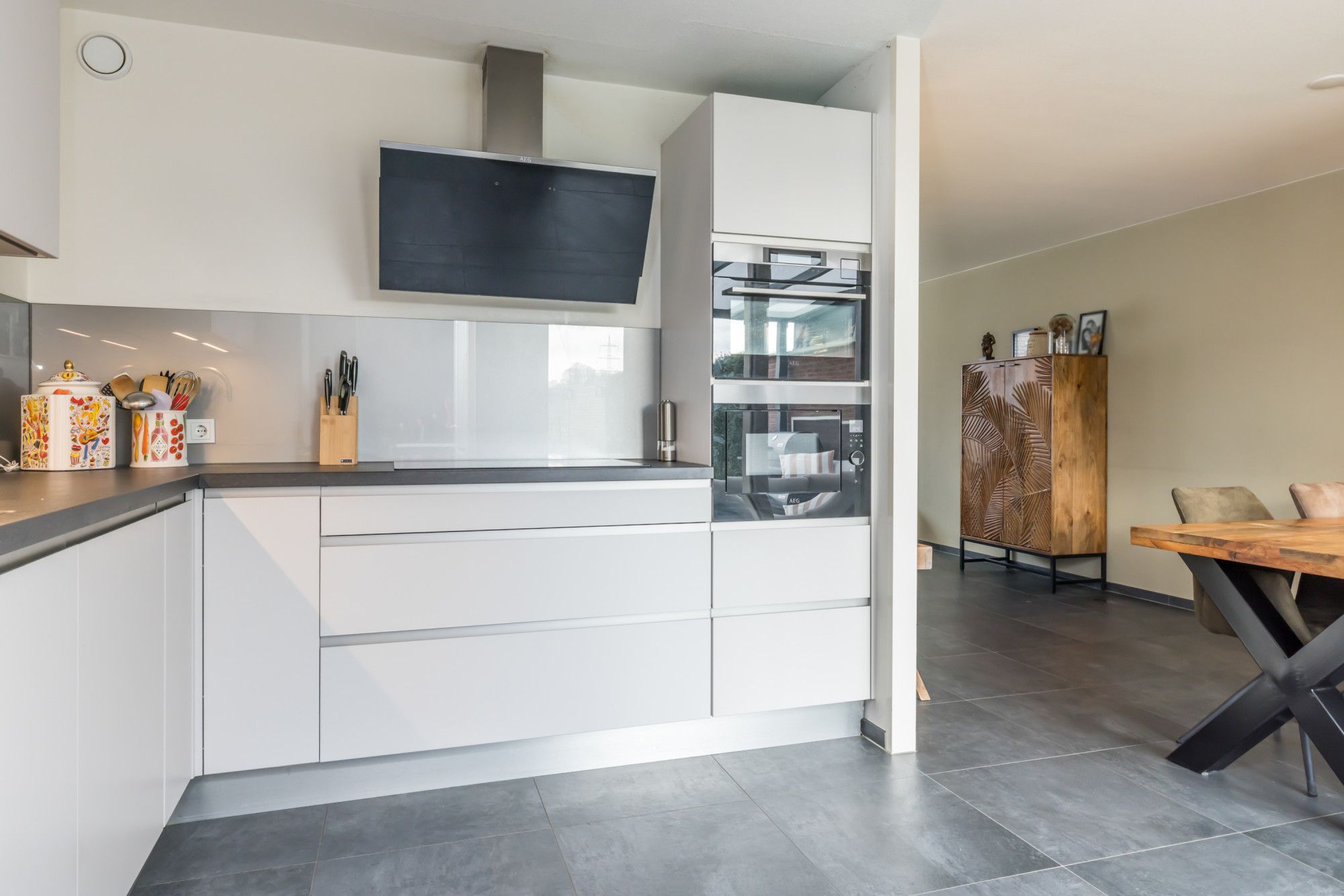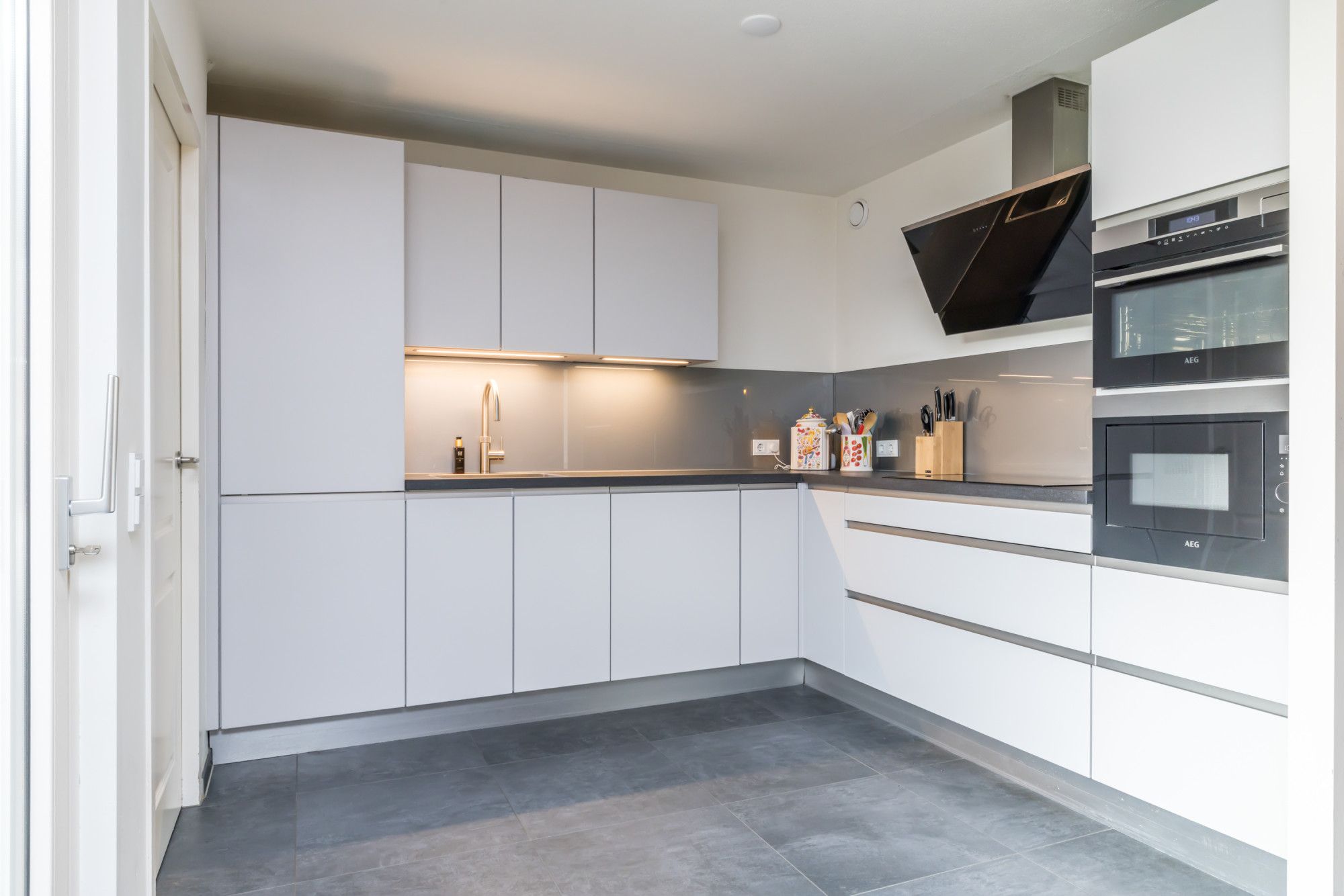 De halfopen keuken is uitgevoerd met een eigentijdse, greeploze inbouwkeuken in witte hoekopstelling, compleet uitgerust met inbouwapparatuur en een frisse, moderne uitstraling.