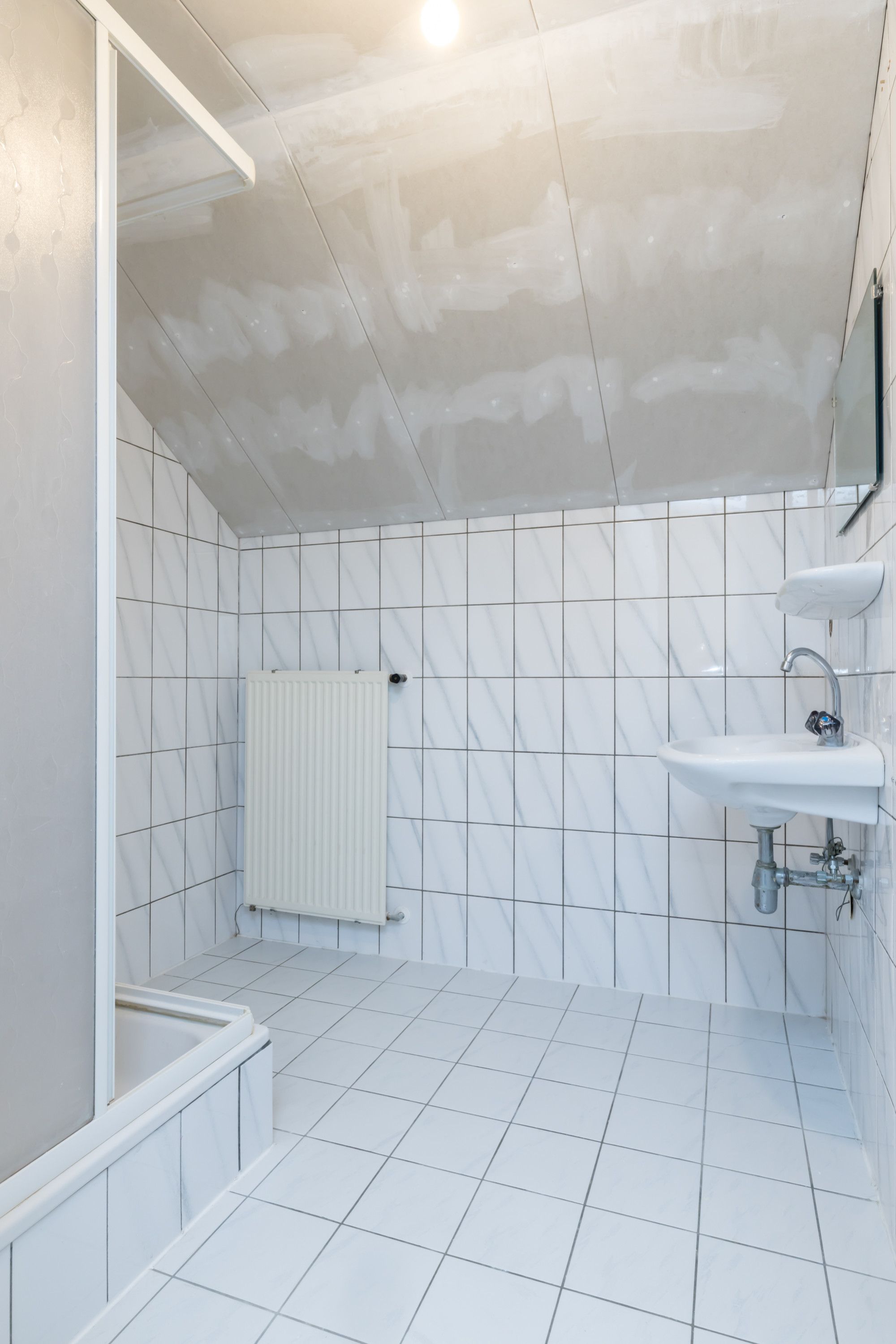 Centraal op deze verdieping bevindt zich de tweede badkamer met wastafel en douchecabine. Daarnaast is er volop bergruimte in de schuinte van de dakconstructie, waar tevens de warmtepompinstallatie en boilers zijn geplaatst.