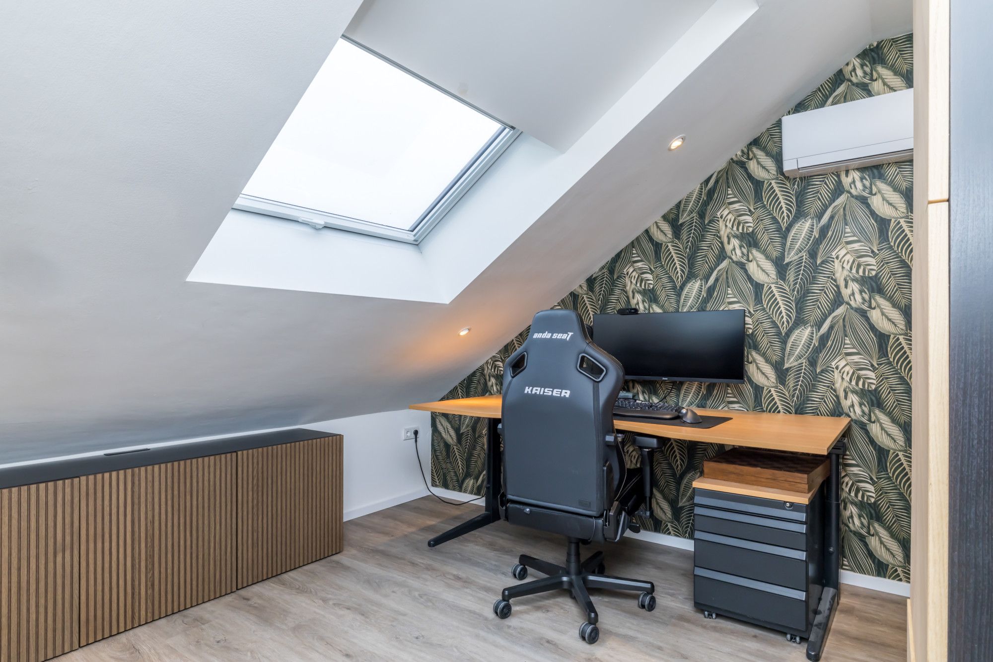 De ruime slaapkamer aan de achterzijde heeft een grote dakkapel en is eveneens voorzien van een airconditioningsinstallatie.