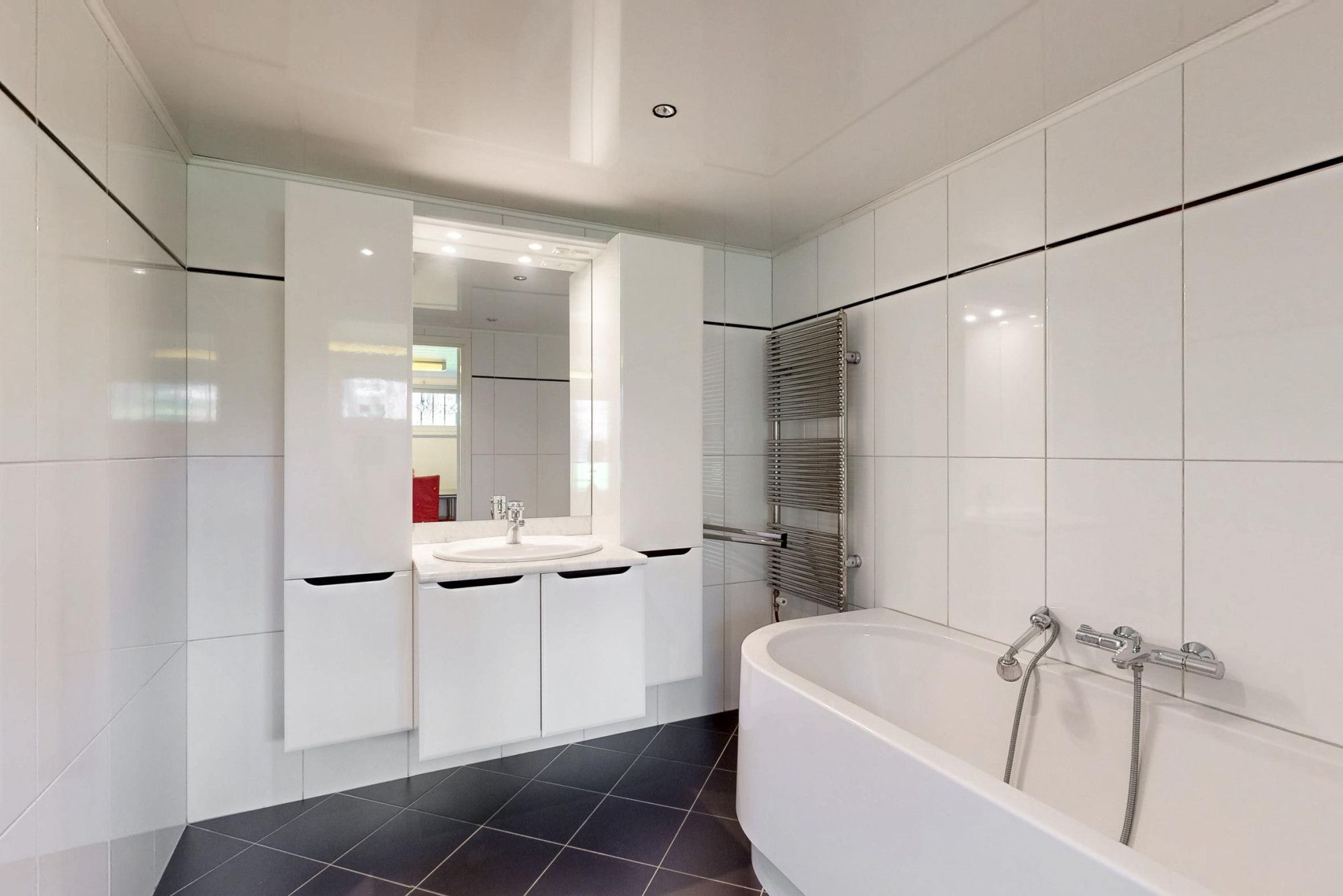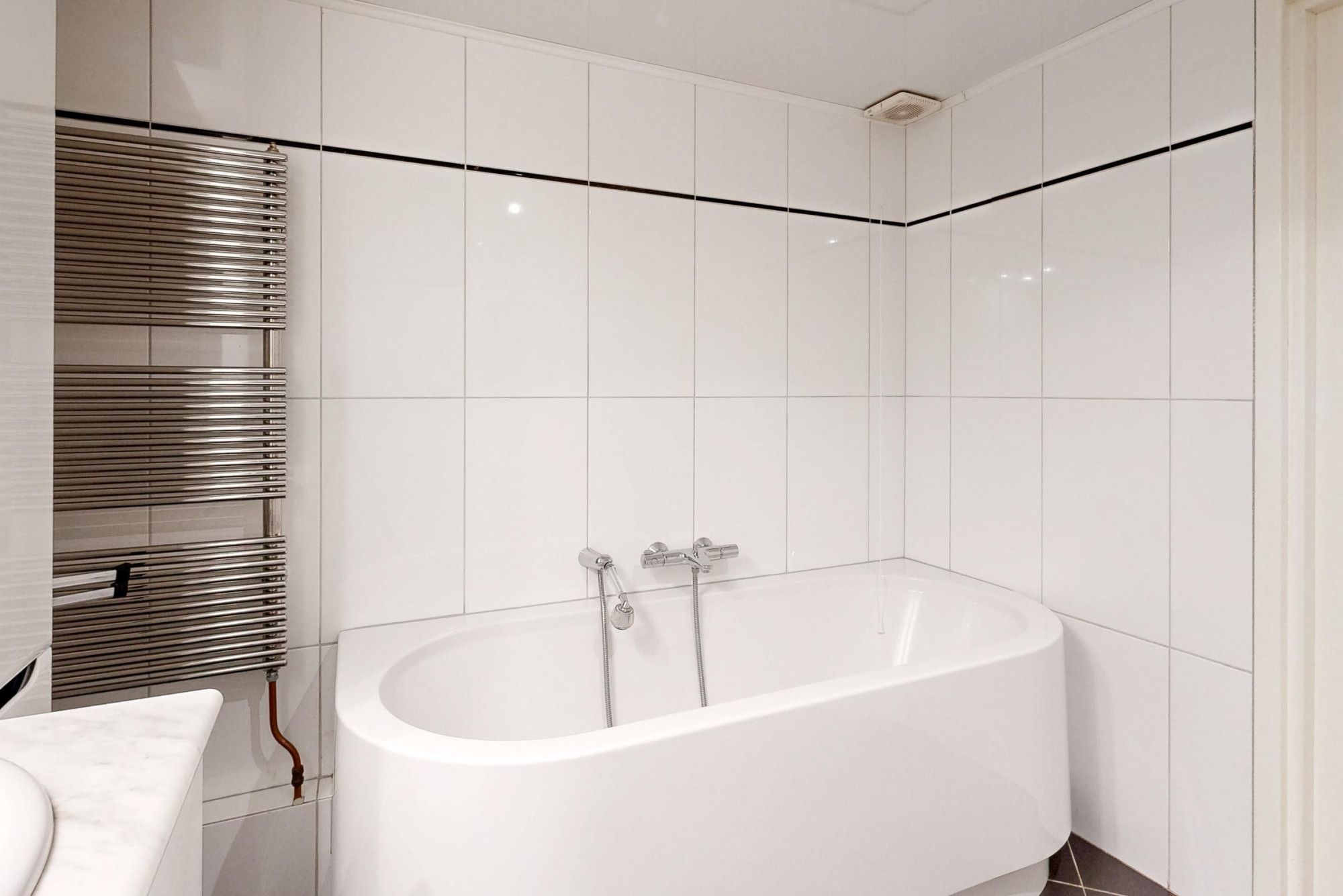 Volledig betegelde badkamer(2.53mx2.27m) met ligbad, vaste wastafel met ombouw, sierradiator.