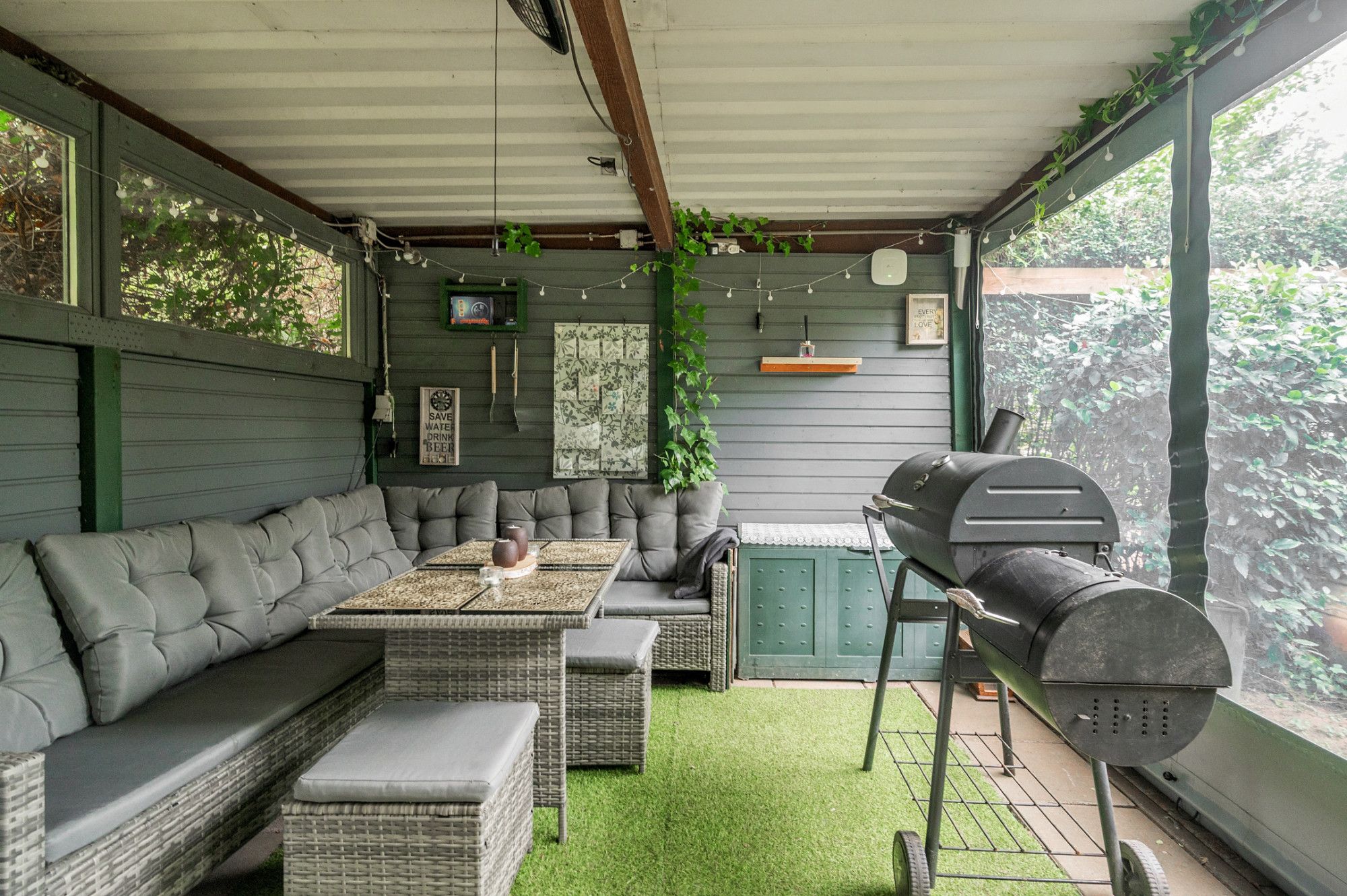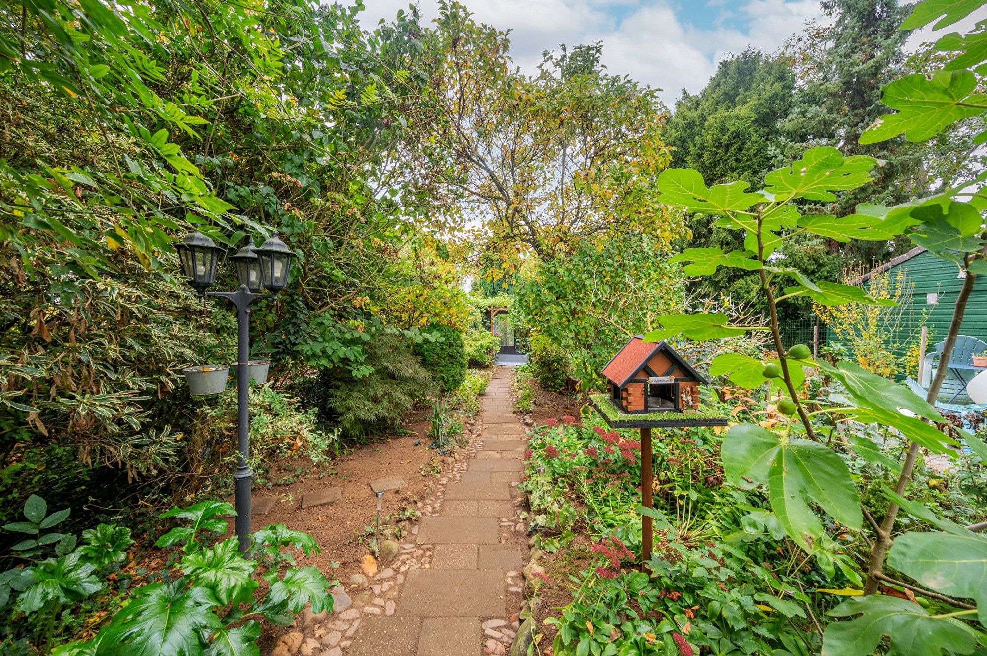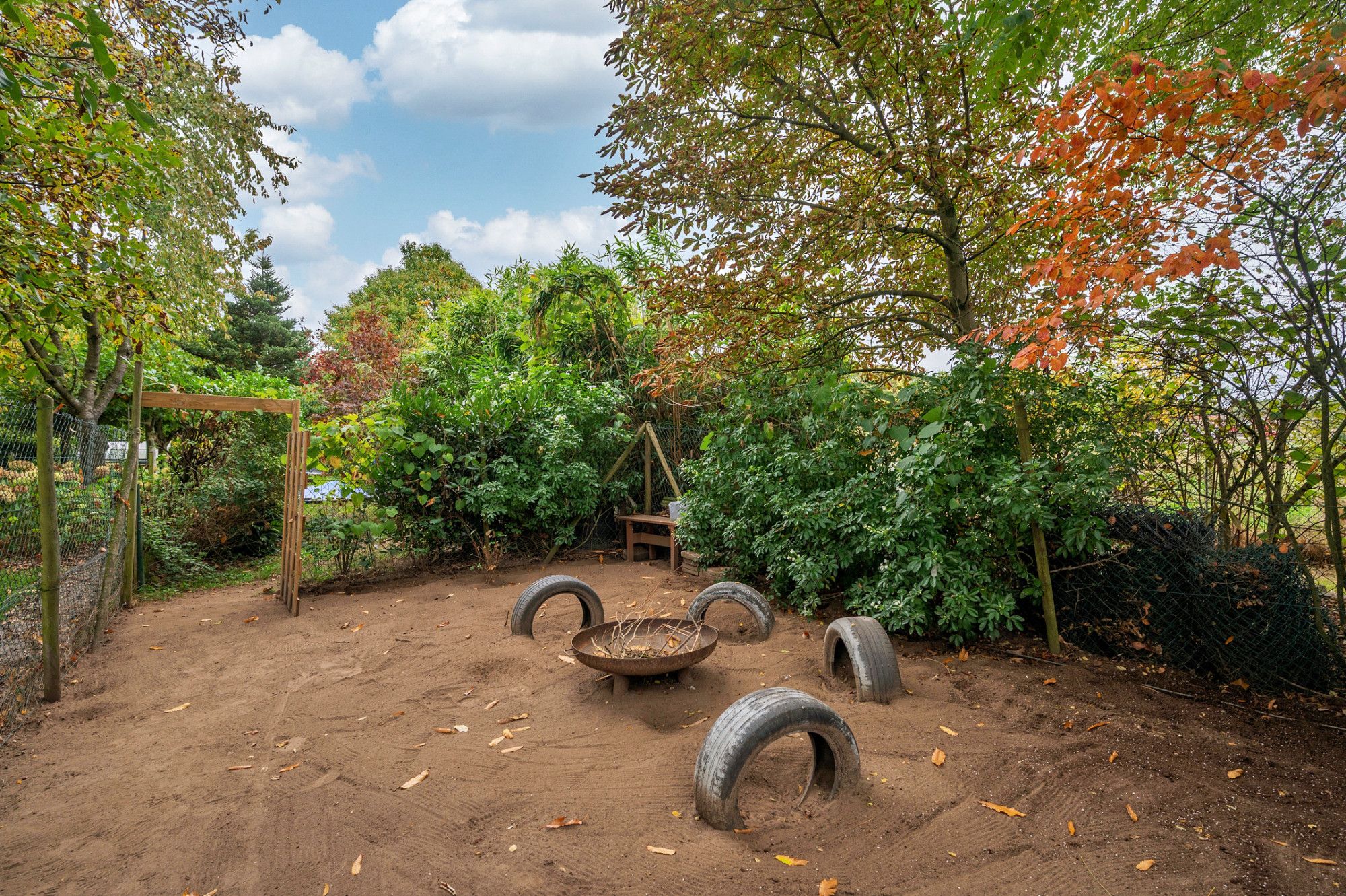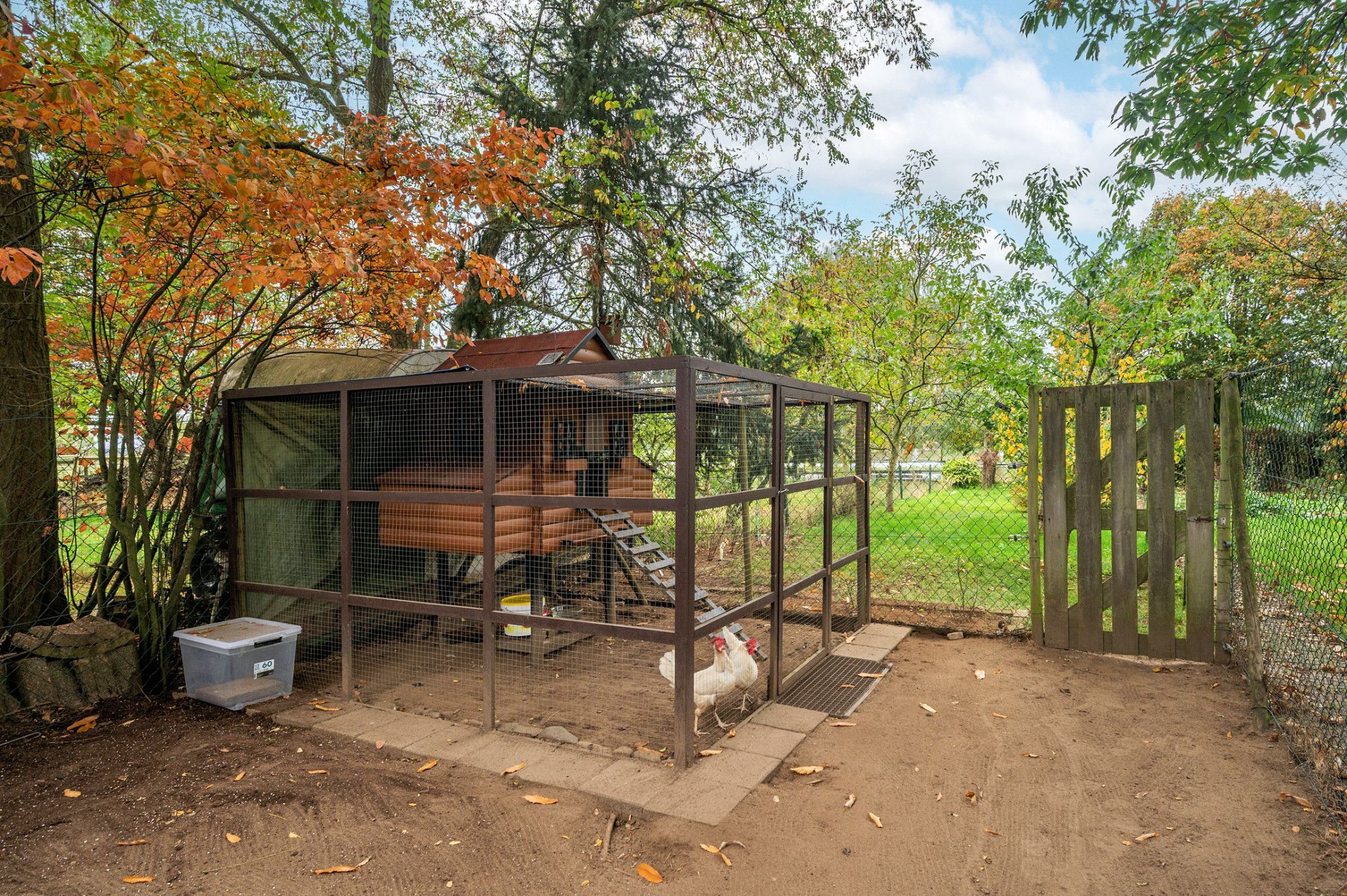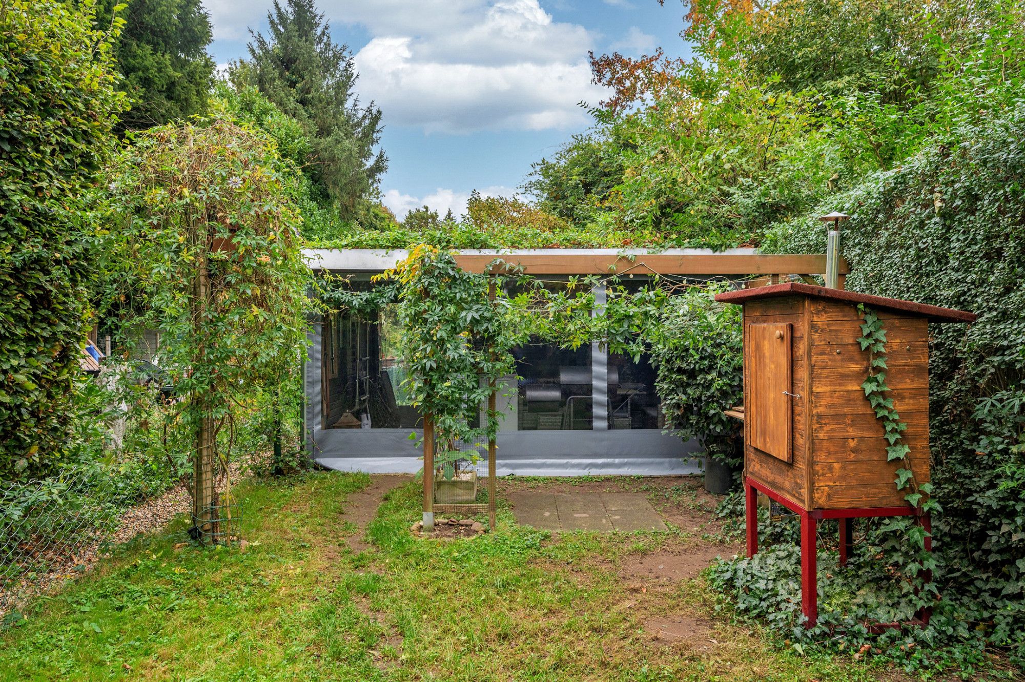 Middels de bijkeuken is de buitenruimte te bereiken. Hier is een betegeld terras aanwezig. De garage is aan de achterzijde gelegen en biedt de mogelijkheid om een auto binnen te zetten en geeft toegang tot de ruime hobbyruimte. De riante tuin met zeer veel groen heeft volledige privacy en beschikt over een zwembad. De achtertuin is ruim 120m² diep en geeft een prachtig uitzicht op de Maas en haar uiterwaarden.