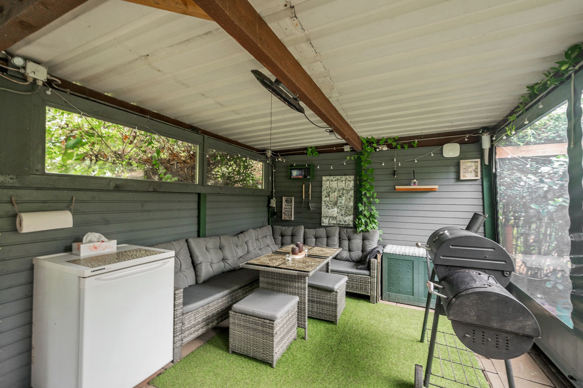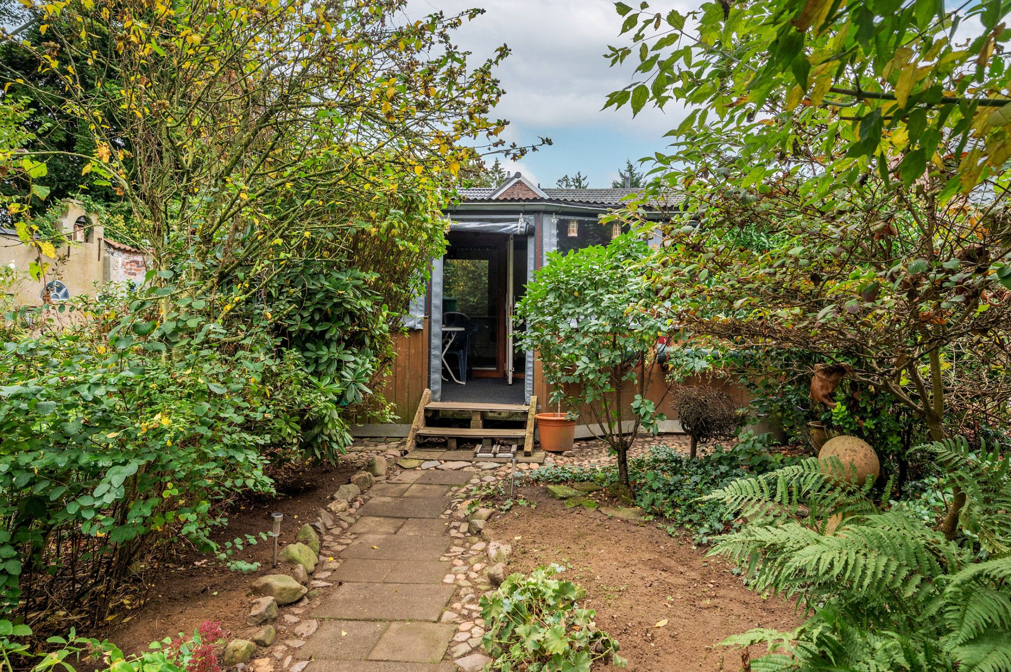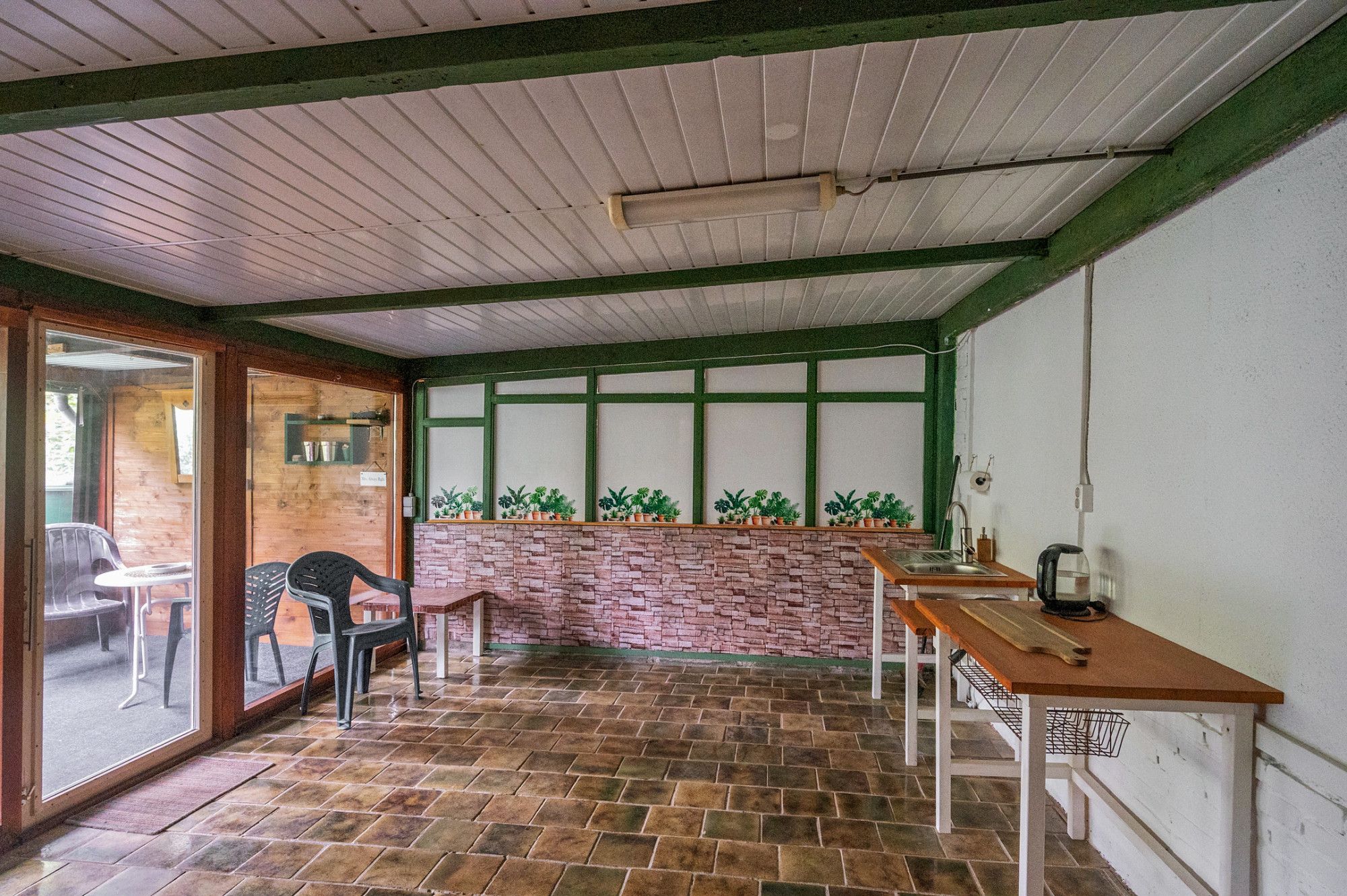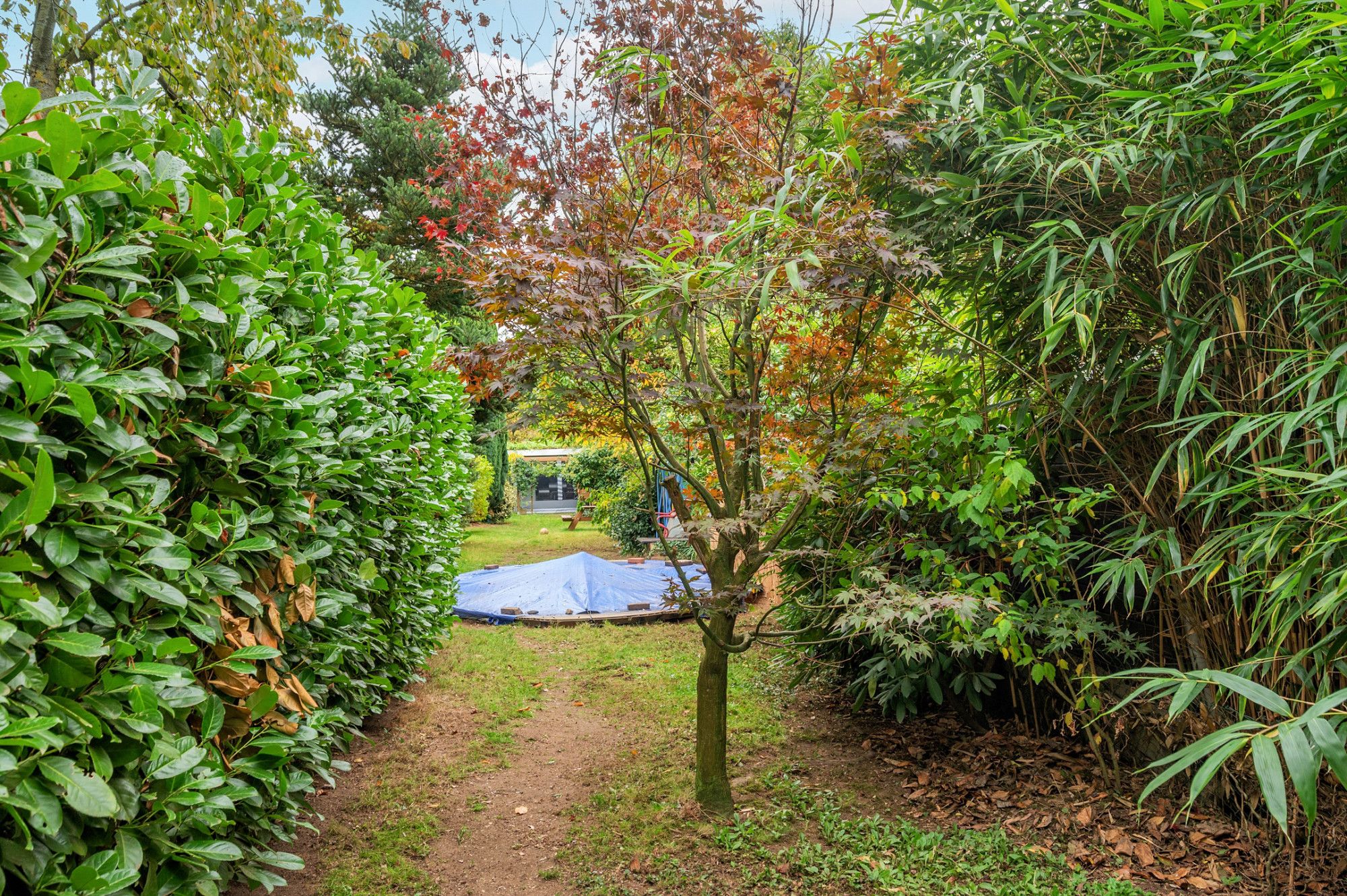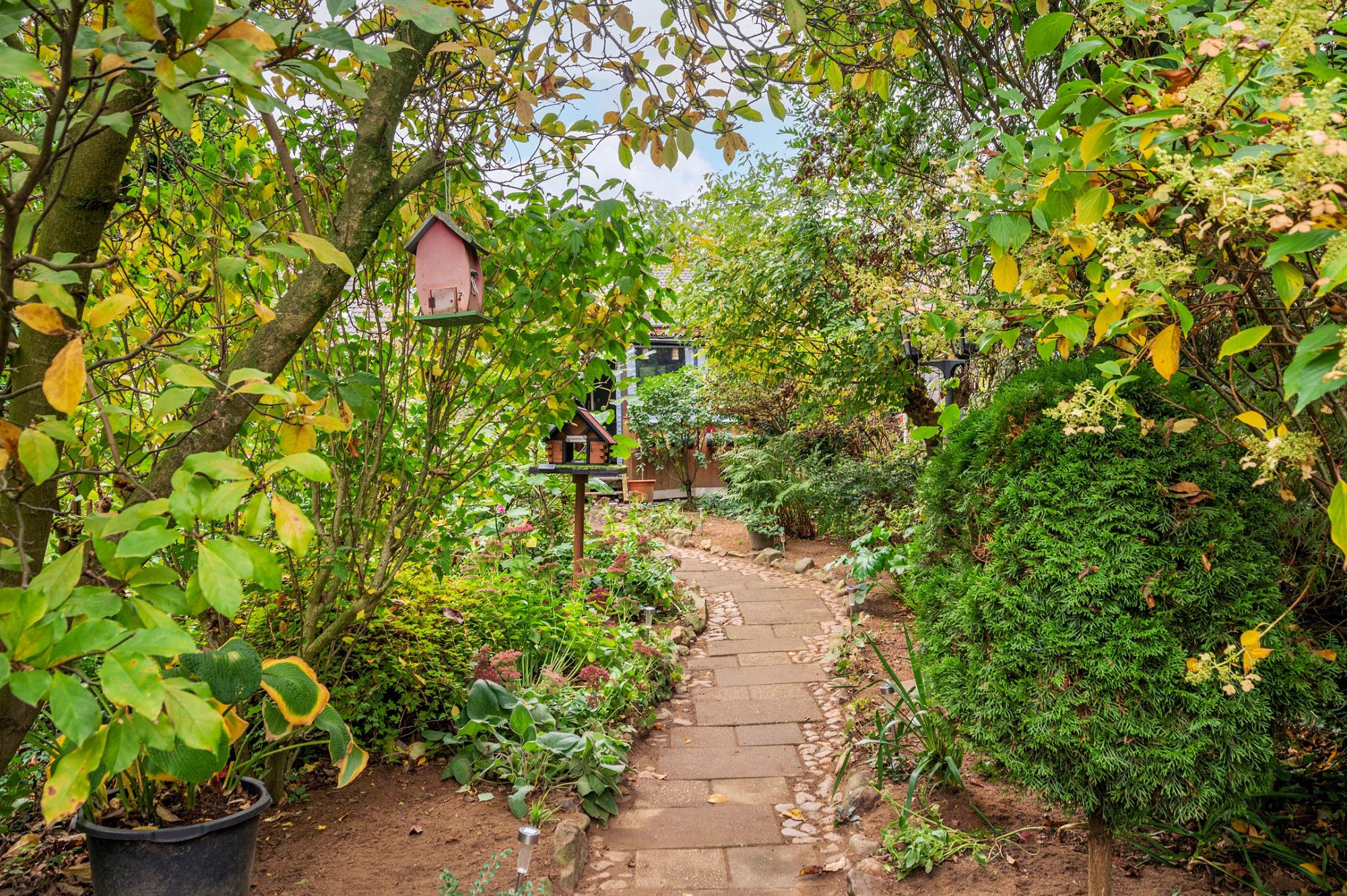Middels de bijkeuken is de buitenruimte te bereiken. Hier is een betegeld terras aanwezig. De garage is aan de achterzijde gelegen en biedt de mogelijkheid om een auto binnen te zetten en geeft toegang tot de ruime hobbyruimte. De riante tuin met zeer veel groen heeft volledige privacy en beschikt over een zwembad. De achtertuin is ruim 120m² diep en geeft een prachtig uitzicht op de Maas en haar uiterwaarden.