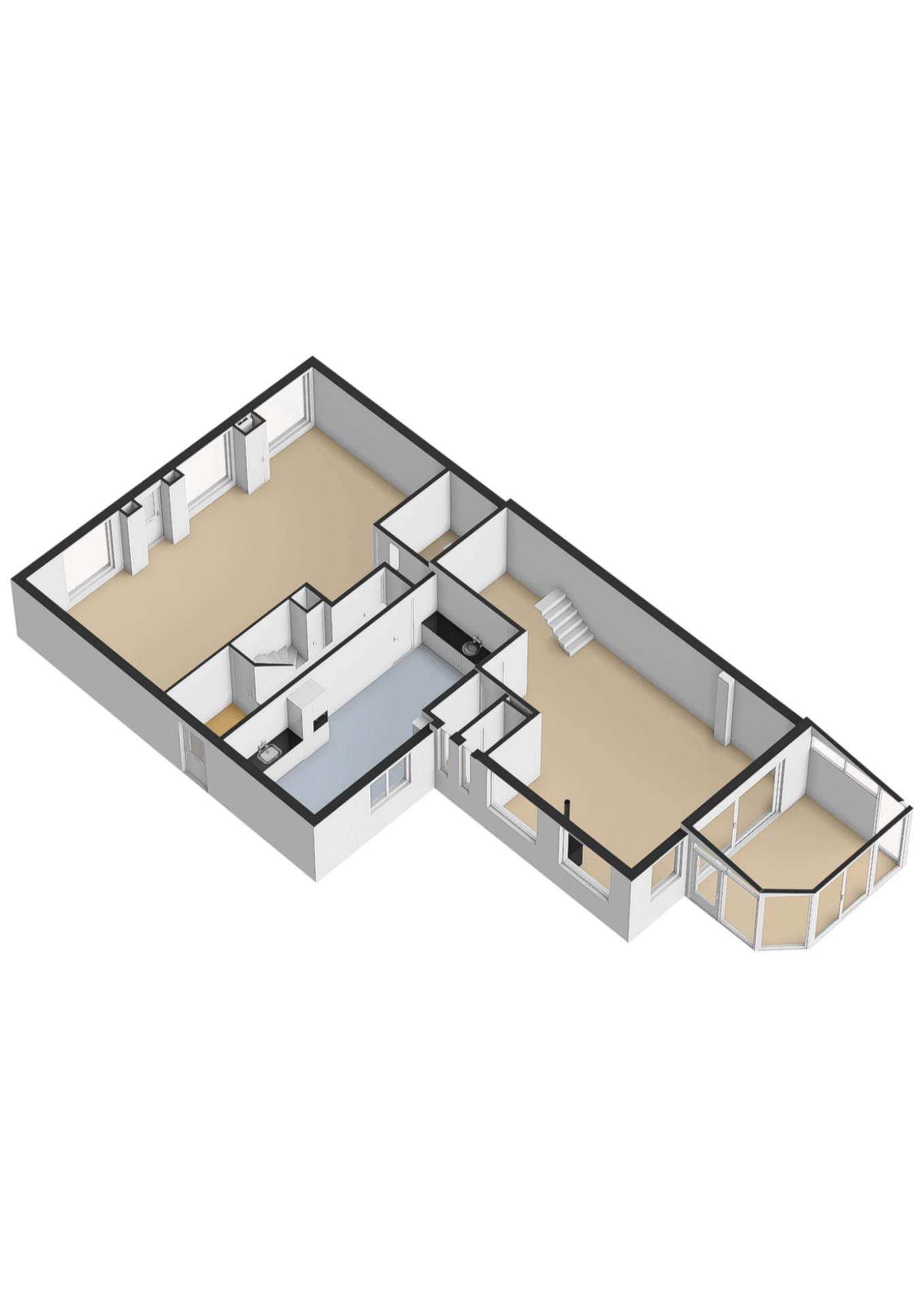 De begane grond heeft een totaaloppervlakte van circa 166 m². Aan de voorzijde bevindt zich de winkelruimte van circa 58 m² met een aansluitende berging van circa 5 m². Het woongedeelte bestaat uit een aparte entree met gang en een trap naar de eerste verdieping en kelder, woonkeuken van circa 25 m² die is uitgerust met een 4-pits inductiekookplaat, vaatwasser en combi-oven. Daarnaast is er een woonkamer met veel licht inval van circa 50 m² met aansluitend een serre met schuifpui van circa 14 m². De woonkamer bevat een tweede trap naar d eerste verdieping. Verder is er een toilet aanwezig.