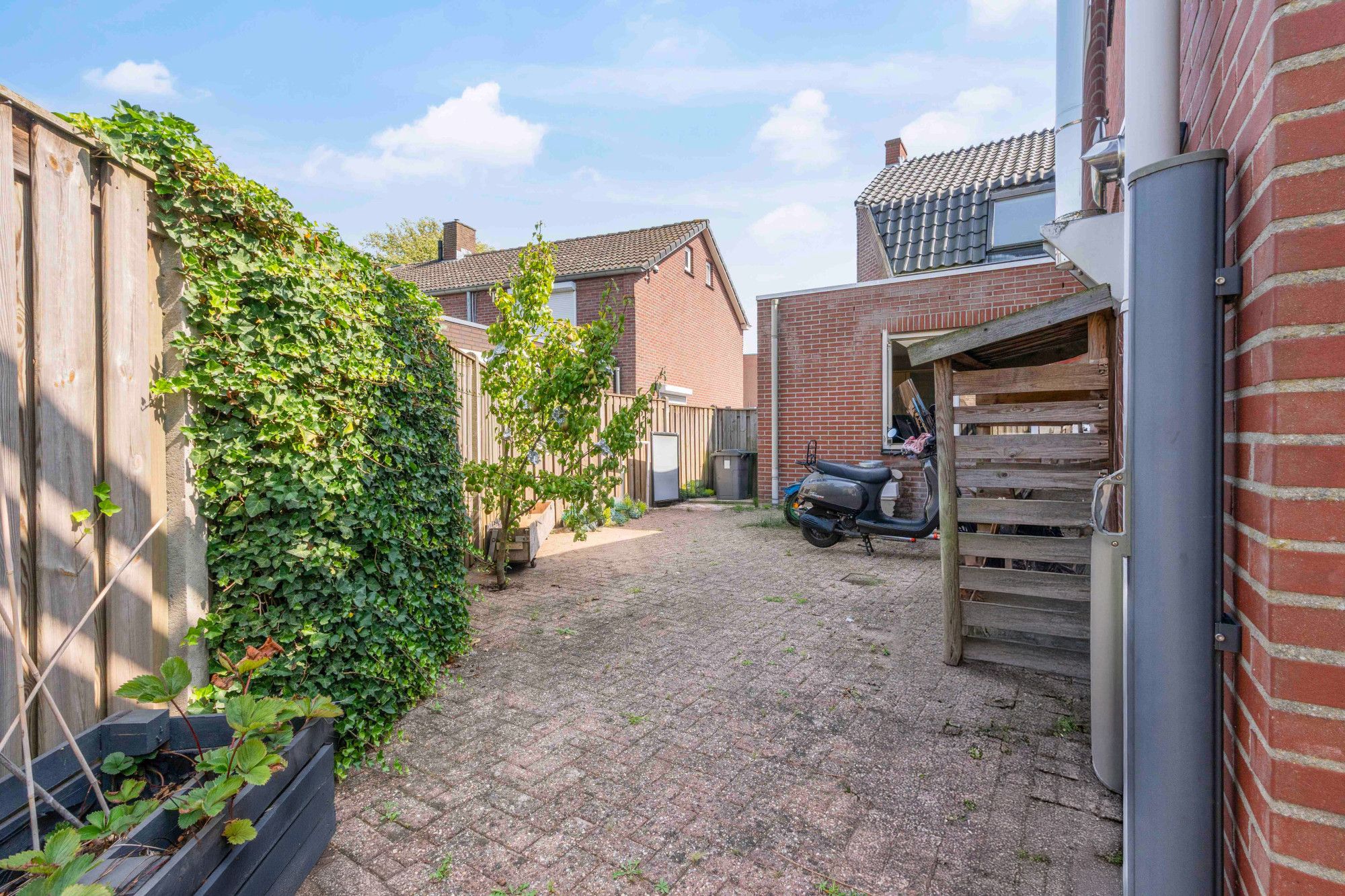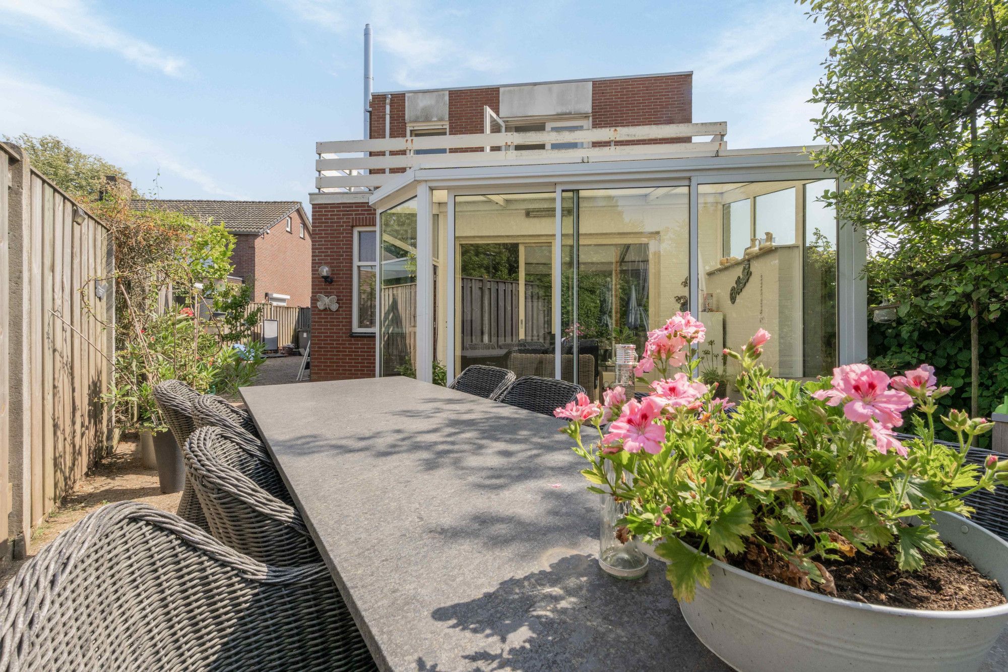 De diepe achtertuin ligt op het zuidoosten, loopt in de lengte door aan de rechterkant van het huis en is bereikbaar via de voor- en achterzijde. Achter in de tuin bevindt zich een ruime garage met rolpoort.