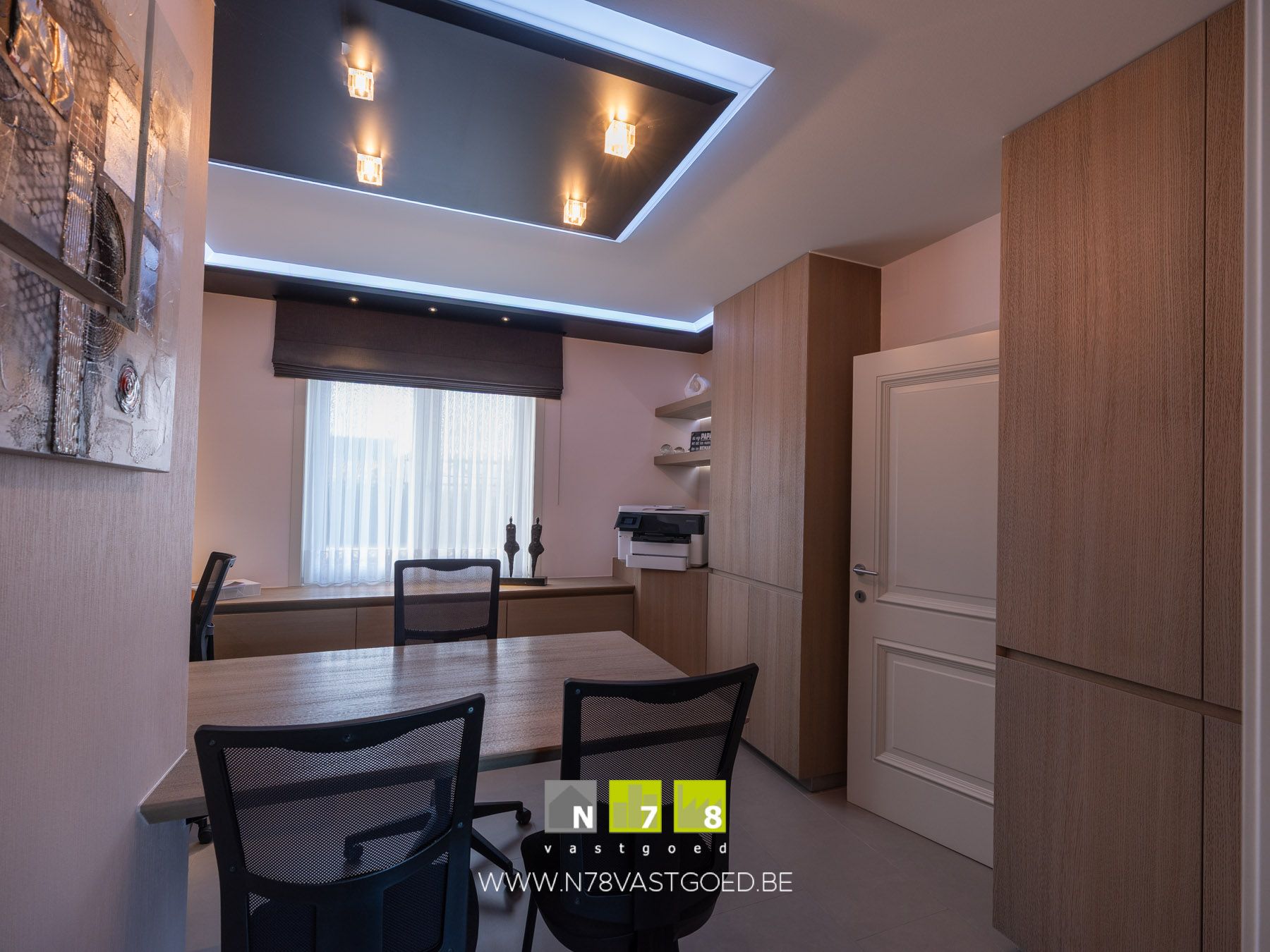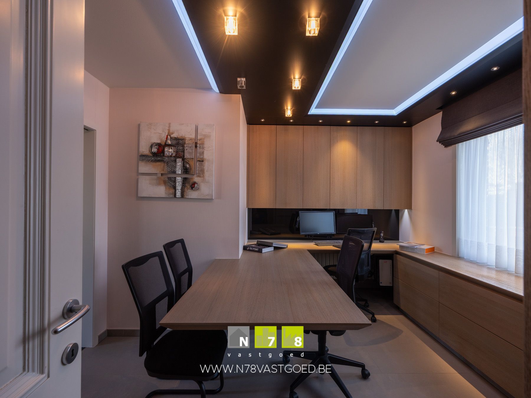- Bureau (3,68m x 3,85m = 14,16m²): eiken inbouwkasten, bureautafel, alles in fineerhout, tegelvloer