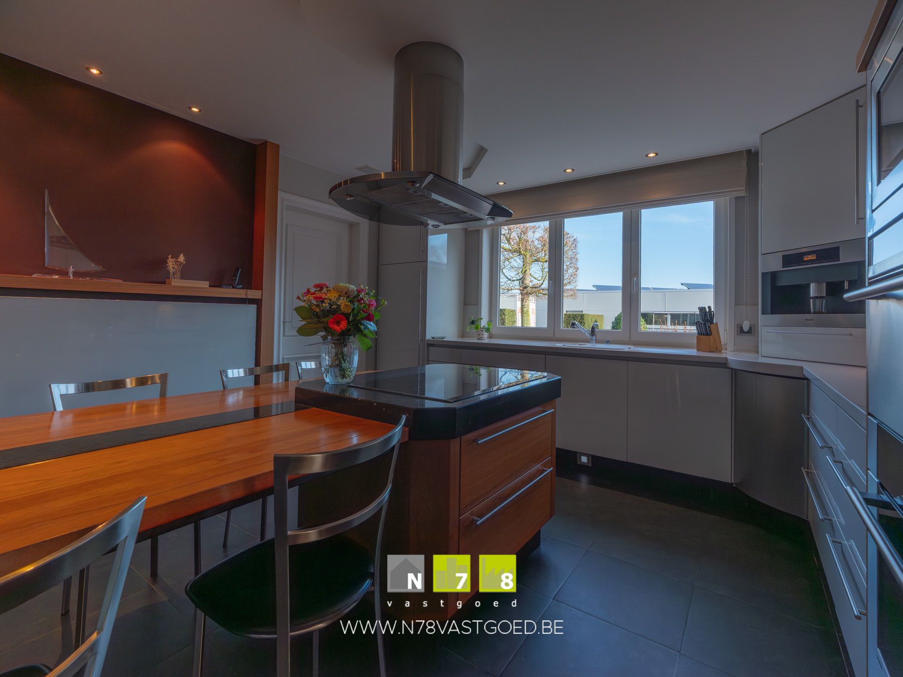 - Keuken ((4,10m x 3,91m) + (1,00m x 1,20m) = 17,23m²)): geïnstalleerde keuken (koelkast, spoelbak, onder- en bovenkasten, lades, kolomkast, oven, microgolfoven, vaatwasser, koffiemachine Miele, Corian werkblad); kookeiland (inductiekookplaat, dampkap, aangehechte tafel).