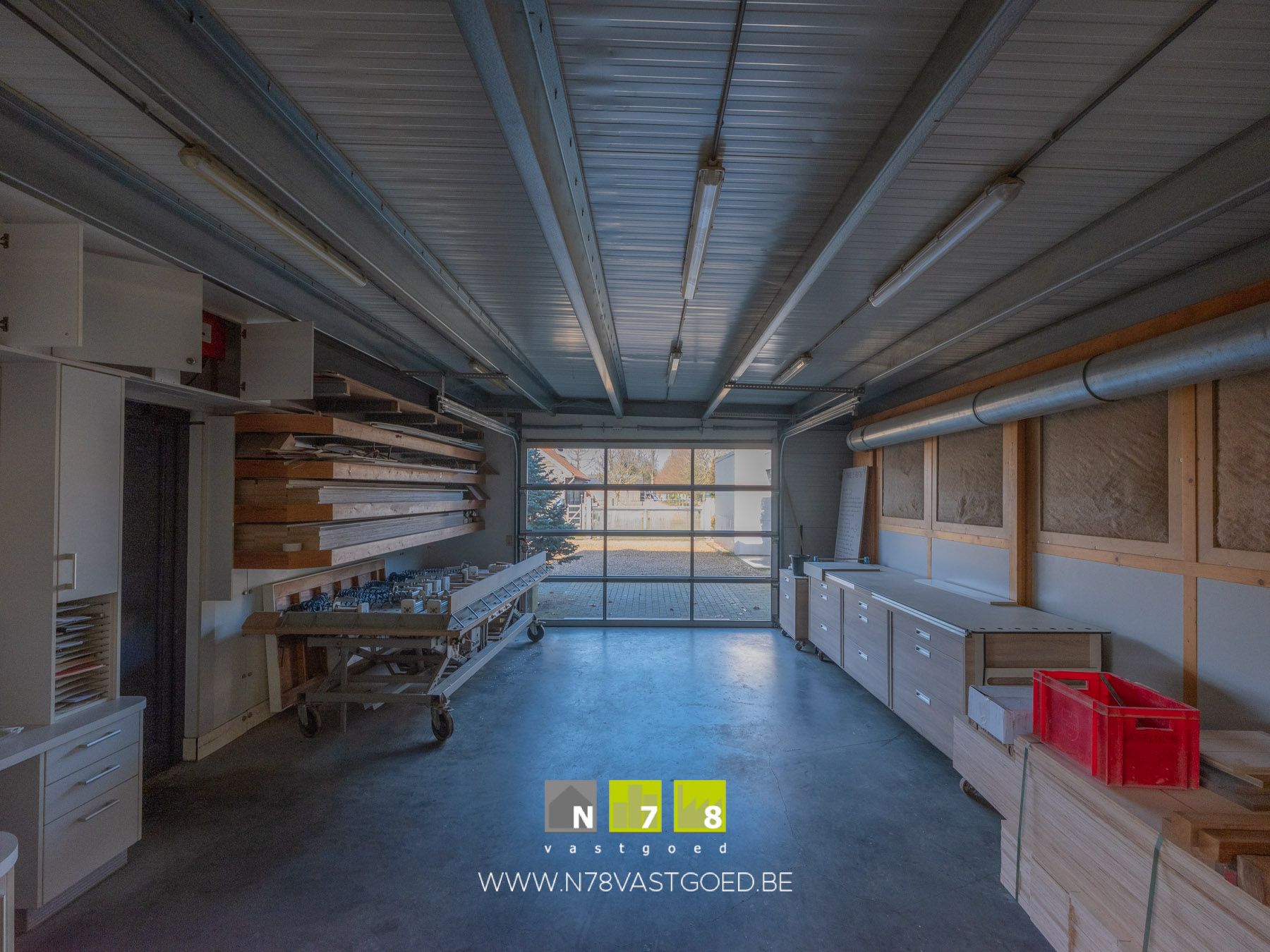 - Garage (35,05m²): houten poort met automatisatie, grondwaterpomp, zolder toegankelijk via vaste trap, tegelvloer.