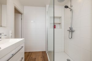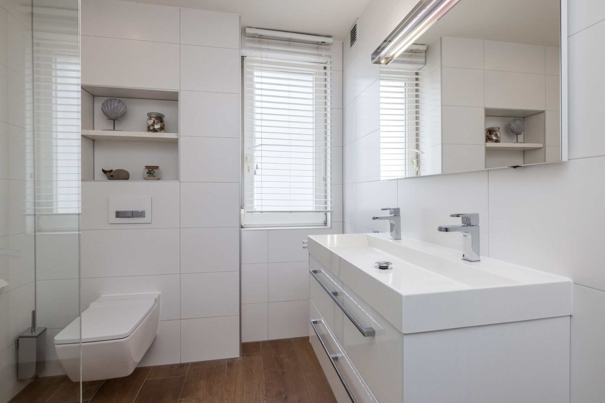 Rechtsachter op de verdieping bevindt zich de moderne, strakke, geheel betegelde badkamer voorzien van een inloopregendouche / vaste wastafel met dubbele kranen in een badkamermeubel / handdoek-radiator en tweede toilet.