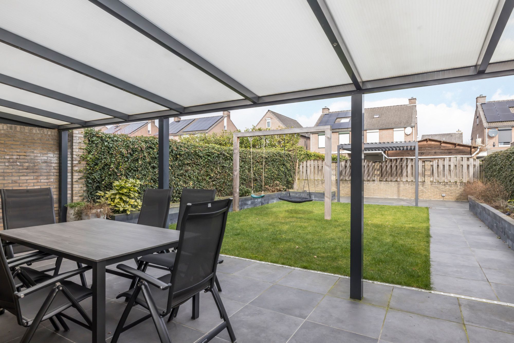 De fraai aangelegde achtertuin biedt volop ruimte om te genieten. Er is een groot terras met overkapping, een gazon met borders en een extra terras met prieel en lamellendak achterin de tuin. Hier vindt u altijd een plekje in de zon of schaduw!