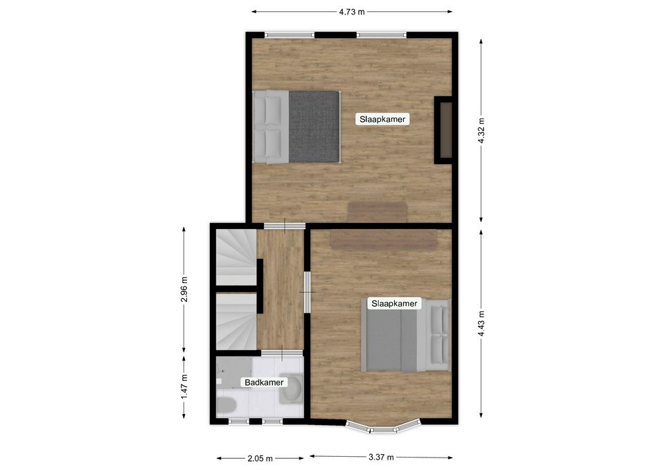 Overloop met toegang tot de 2 ruime slaapkamers en badkamer. De slaapkamers zijn gedeeltelijk voorzien van een nette laminaatvloer, vloerbedekking en van rolluiken. De keurige badkamer is voorzien van een douche, 2de toilet en vaste wastafel.